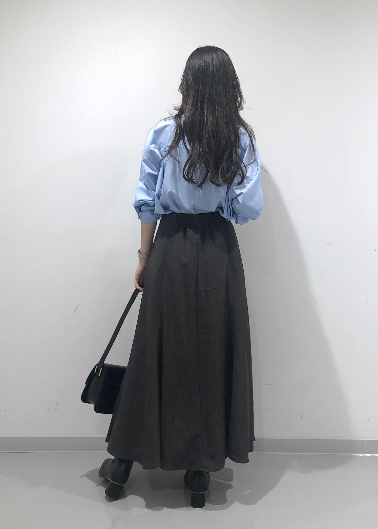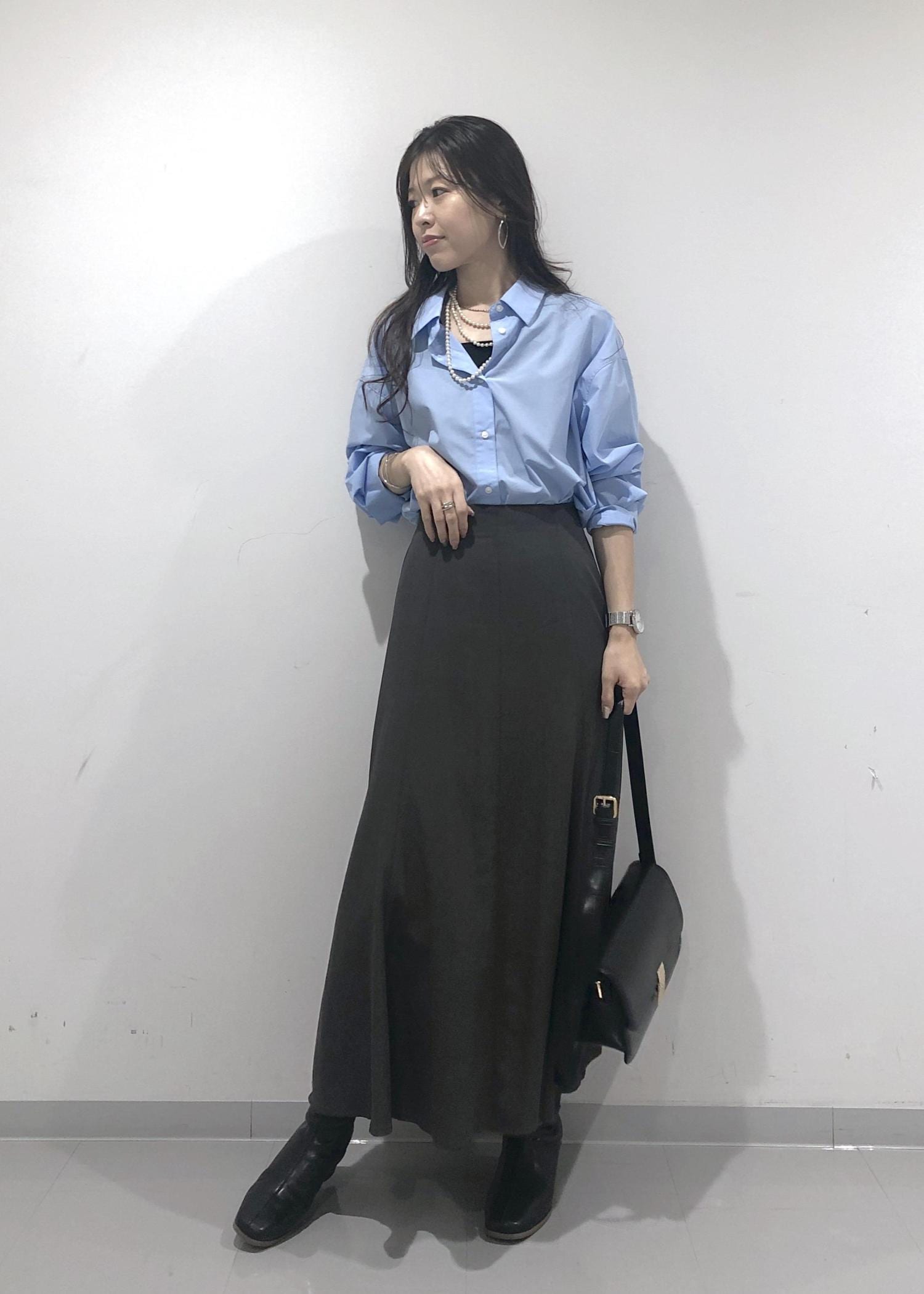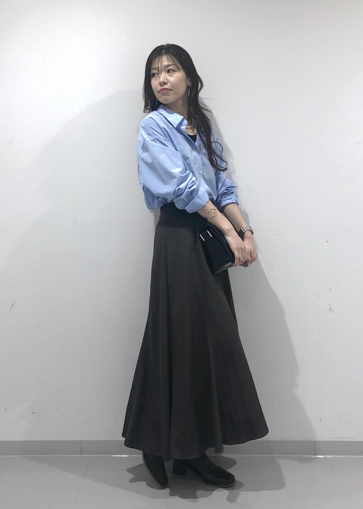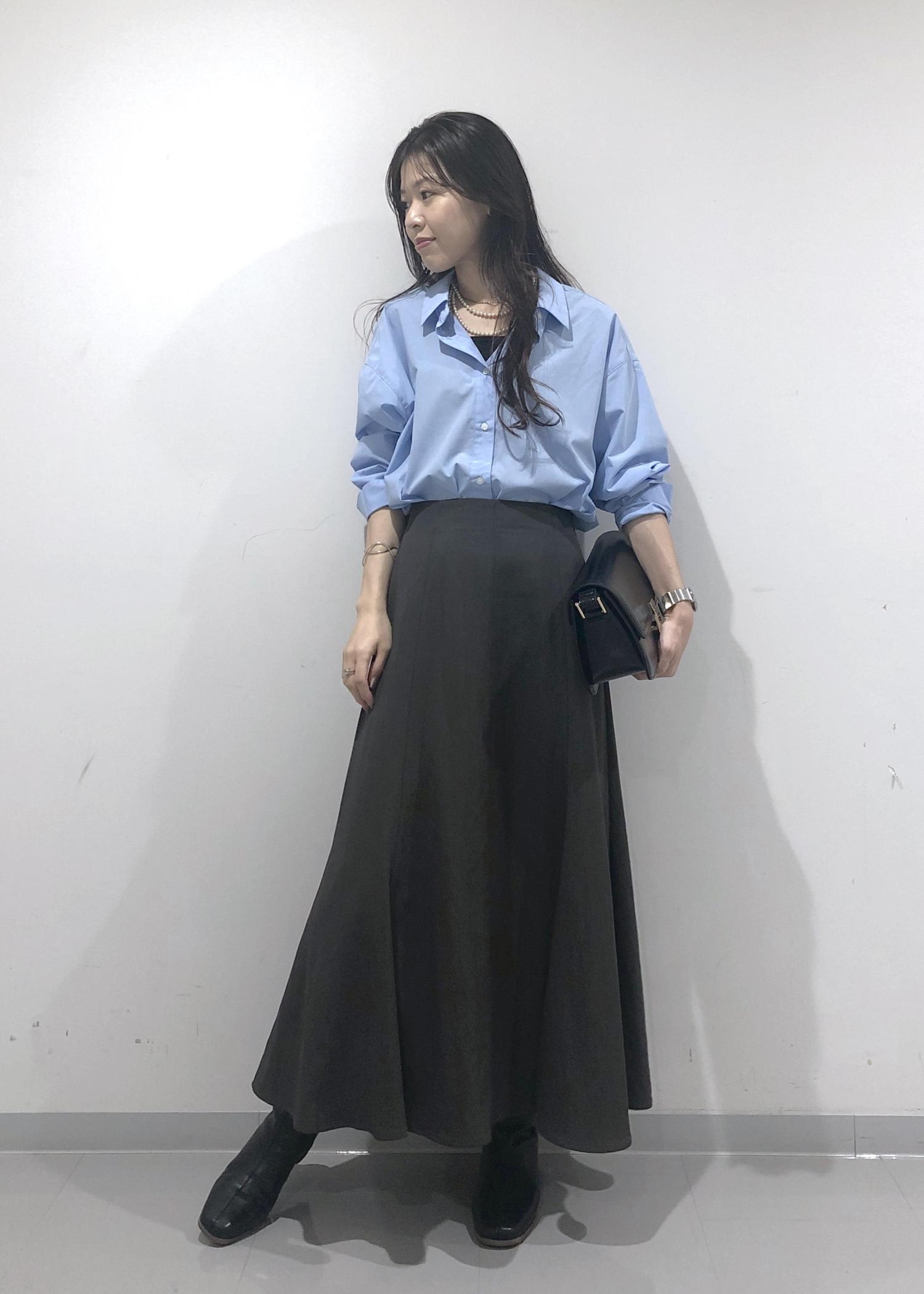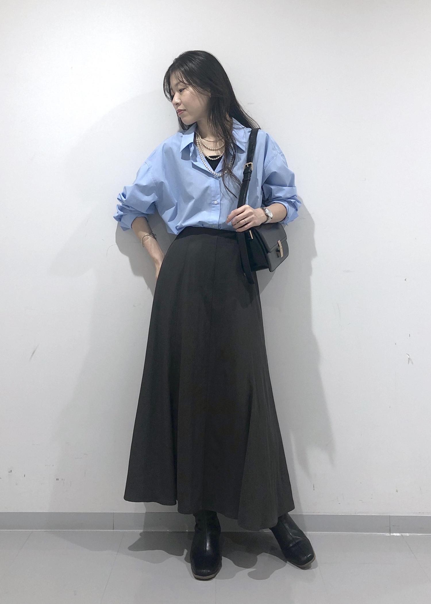 爽やかなきれいなブルーのシャツを1枚でさらっと着、シルエットのきれいなスカートと、秋らしくブーツを合わせたハンサムレディーコーデに仕上げました!
