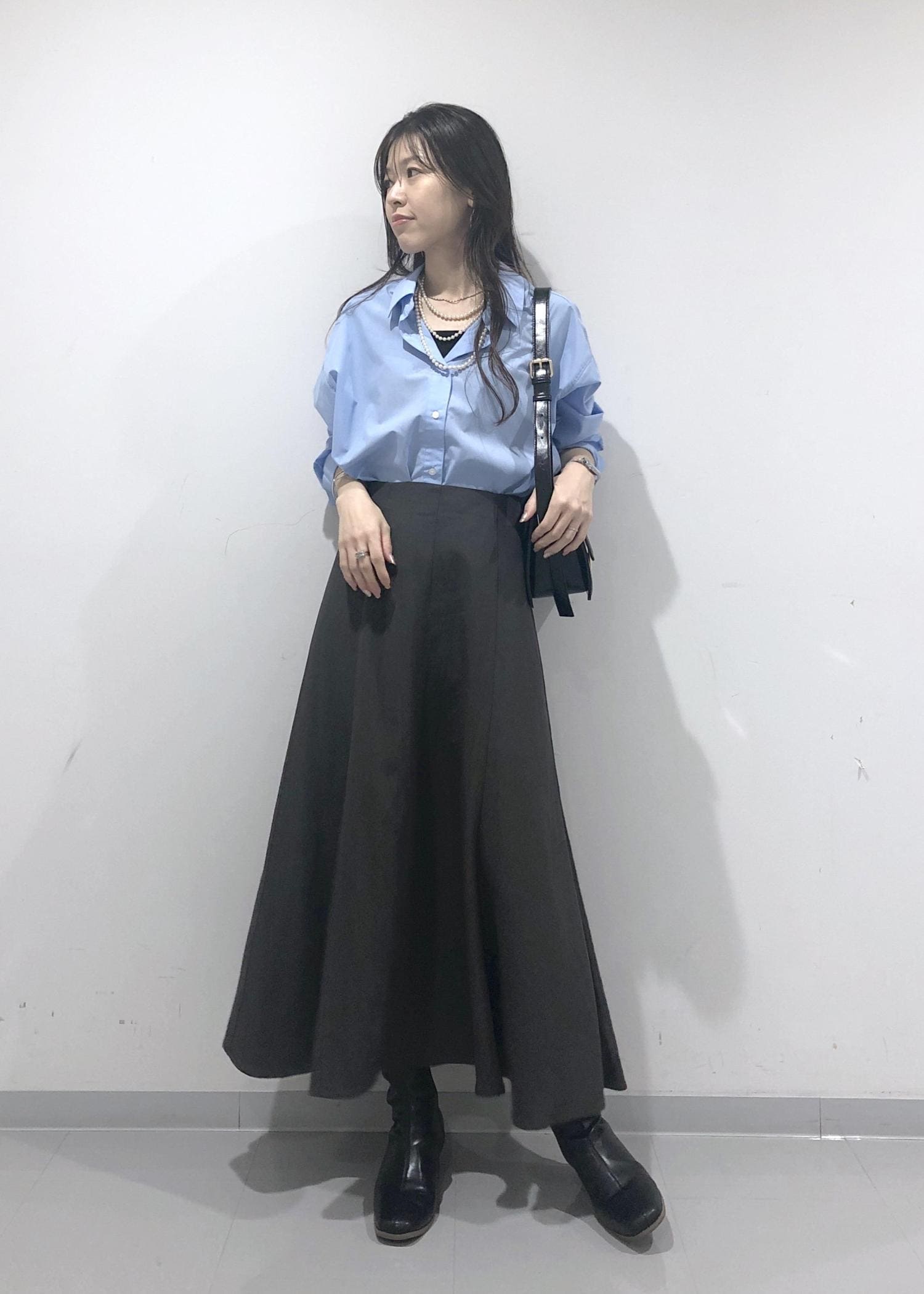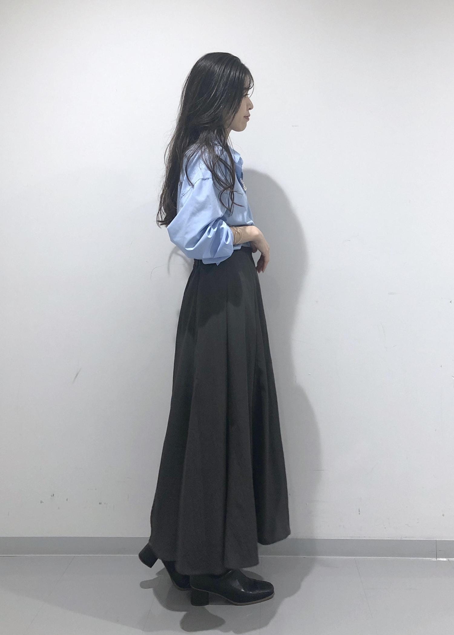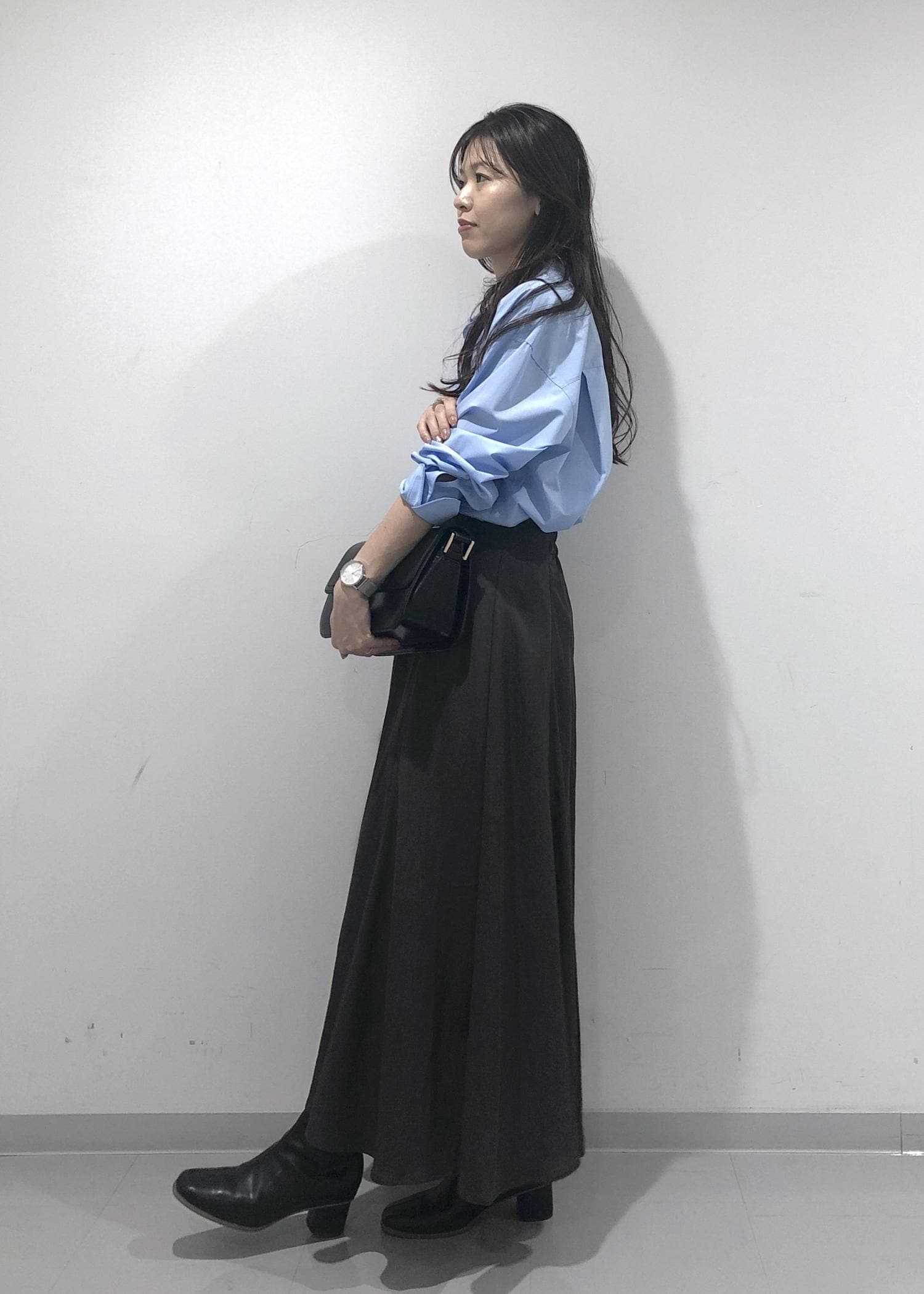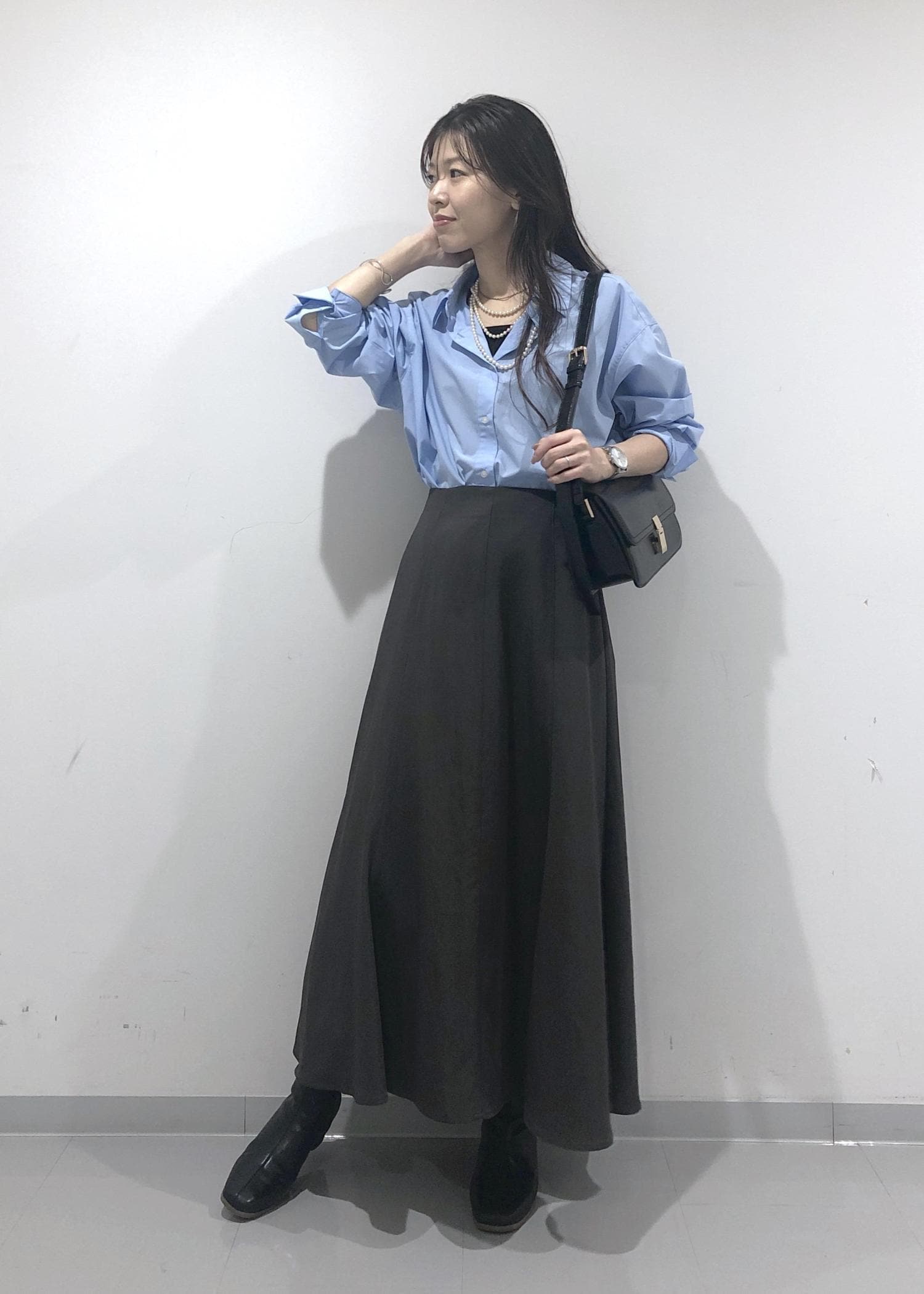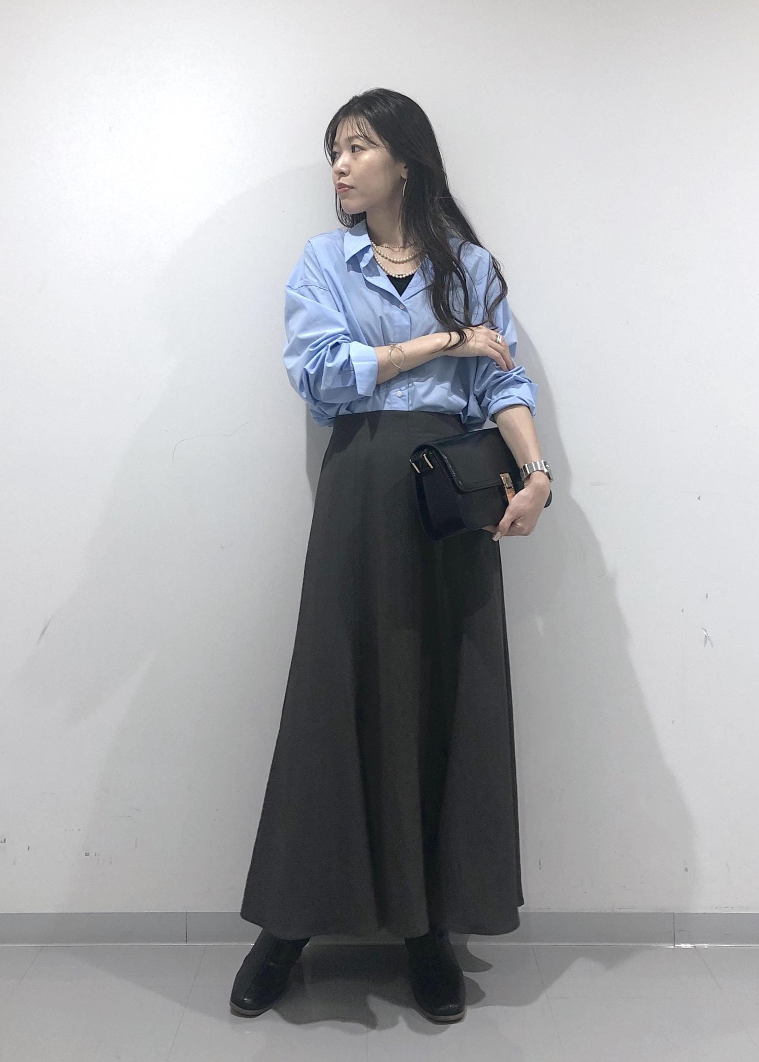 爽やかなきれいなブルーのシャツを1枚でさらっと着、シルエットのきれいなスカートと、秋らしくブーツを合わせたハンサムレディーコーデに仕上げました!