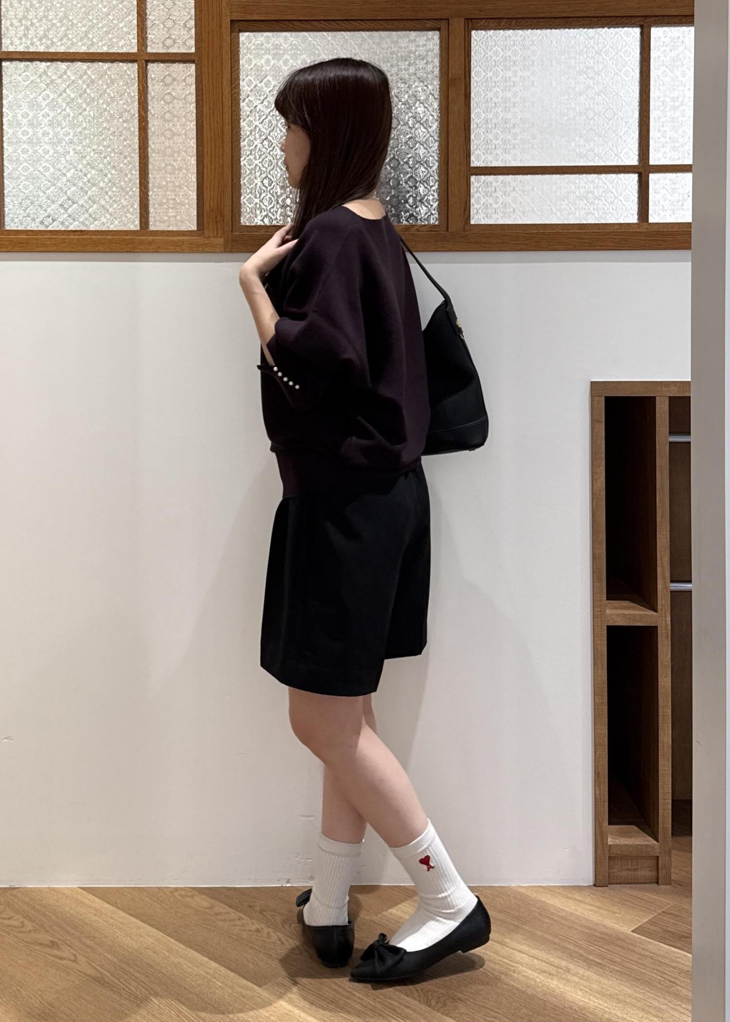 大人らしい落ち着いた色味のニットにハーフパンツを合わせた、ヘルシーさのあるコーディネートです。
