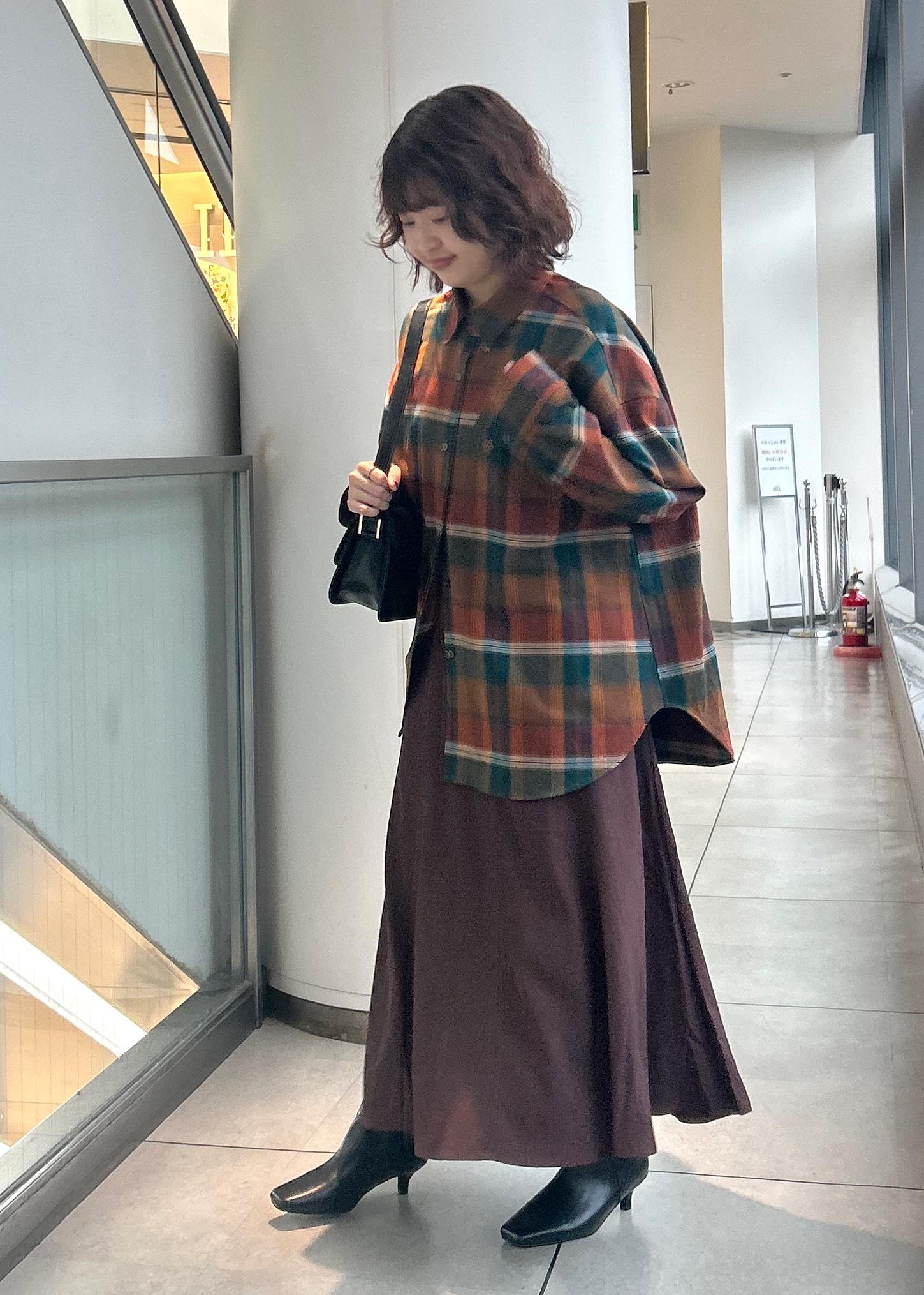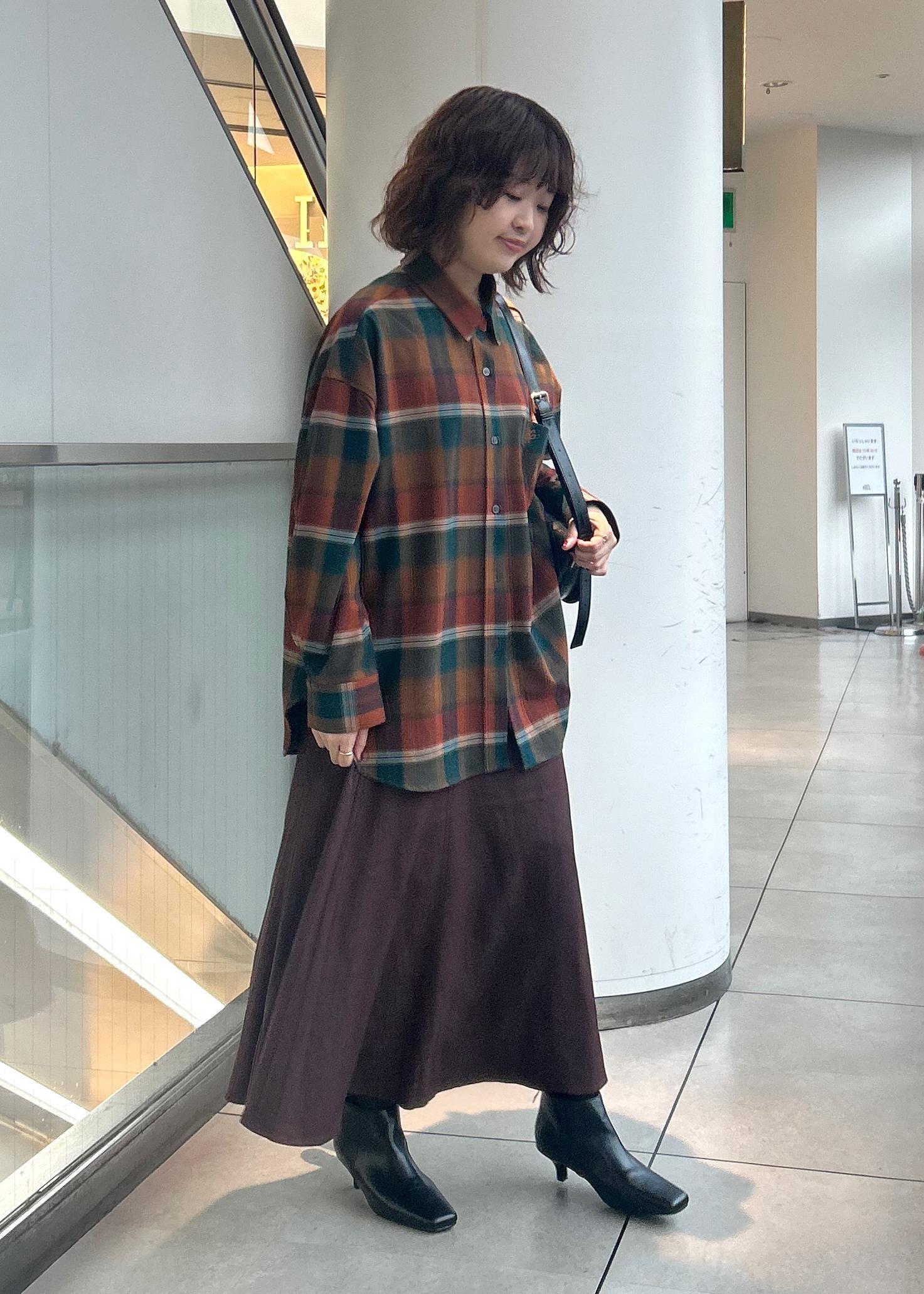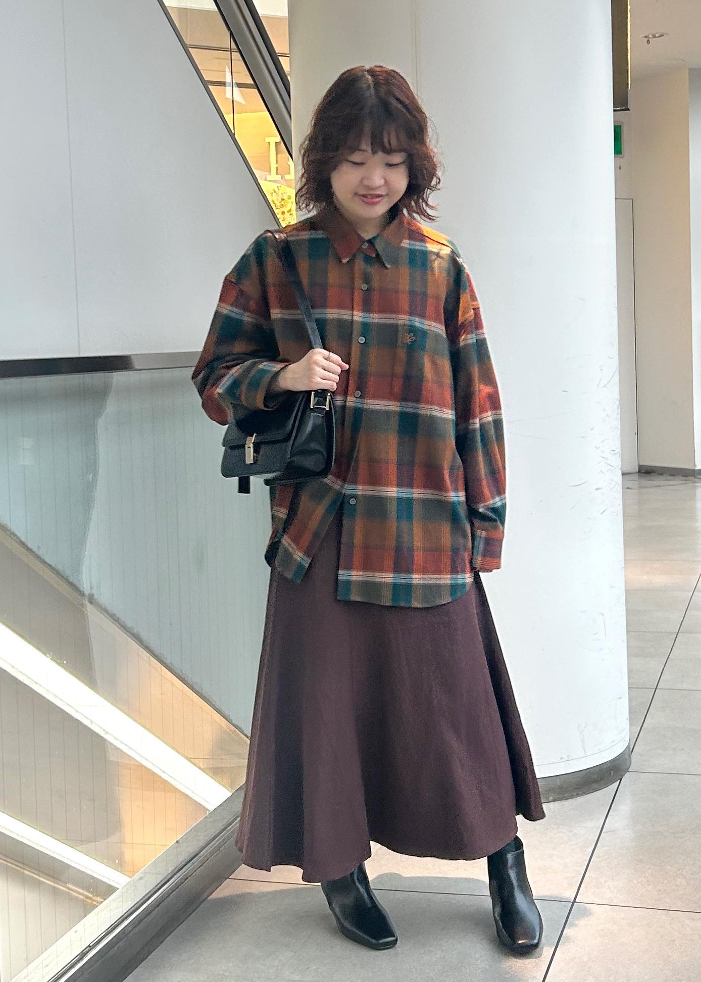 オレンジ色のチェックシャツを着用するだけで、秋らしくレトロ可愛くなります。