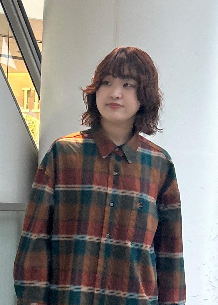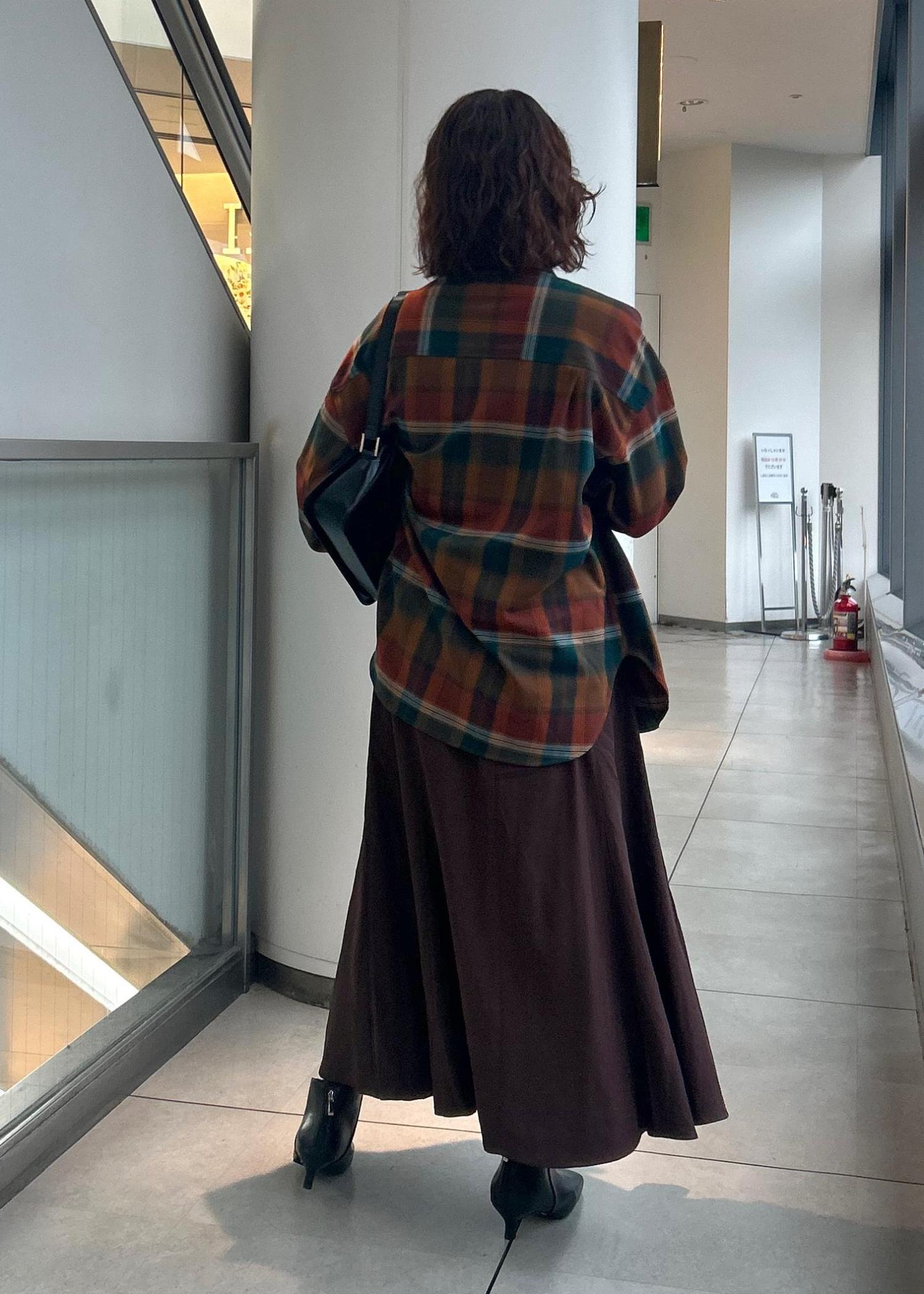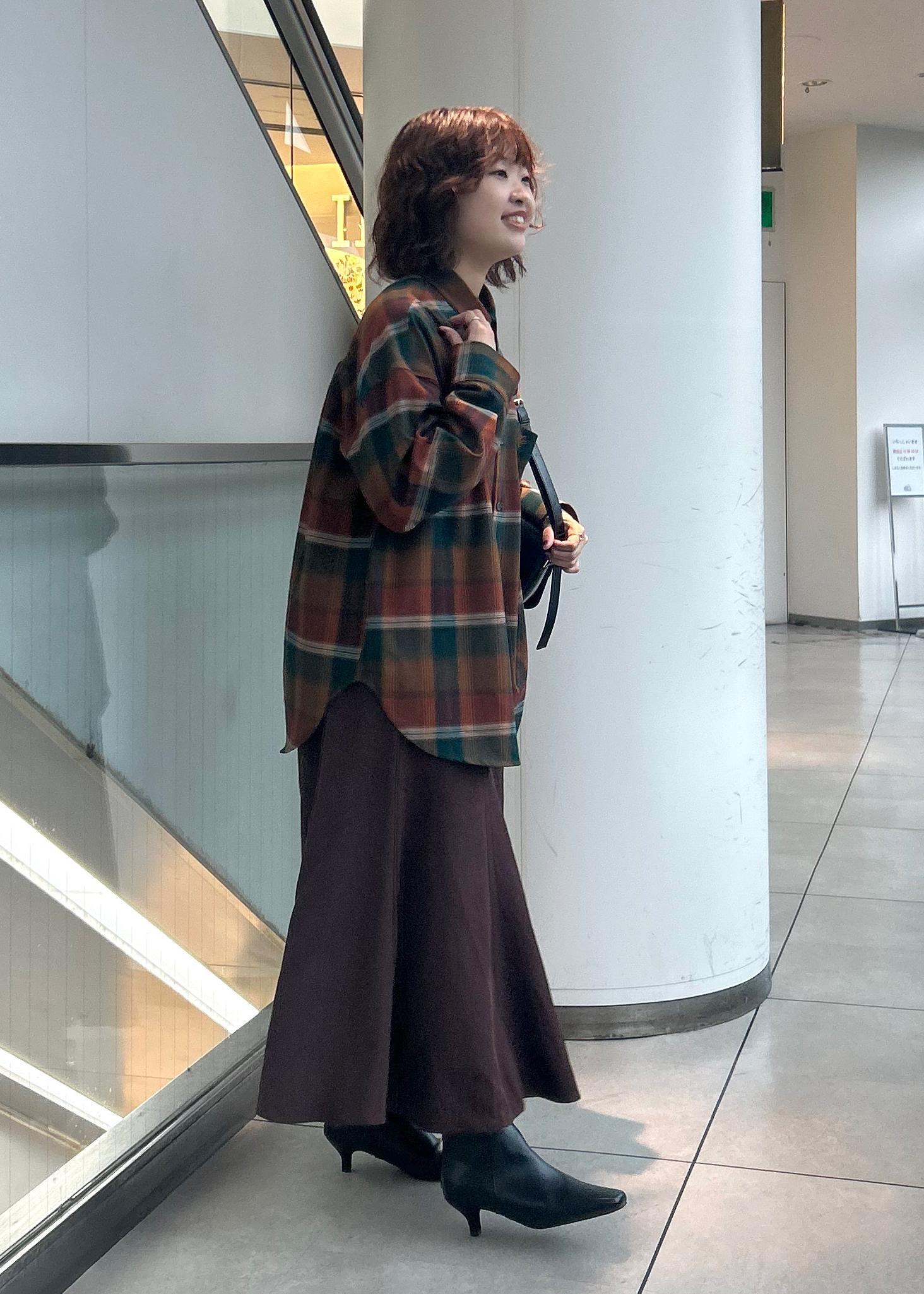 オレンジ色のチェックシャツを着用するだけで、秋らしくレトロ可愛くなります。