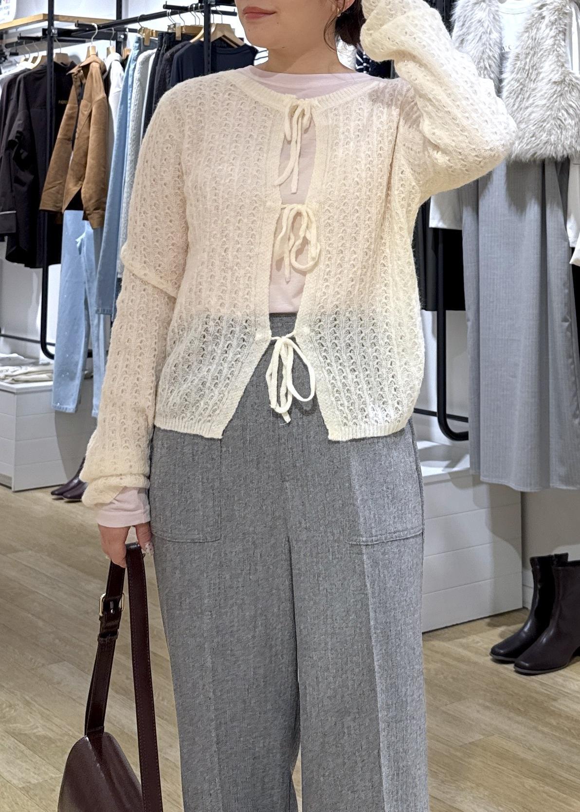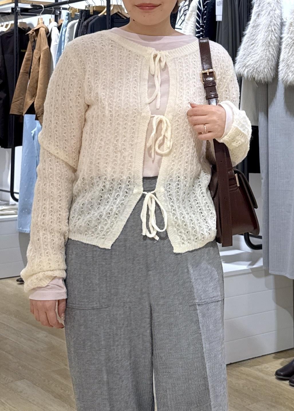 リボンデザインが可愛い透かし編みのカーディガンにピンクのシアートップスをレイヤードして