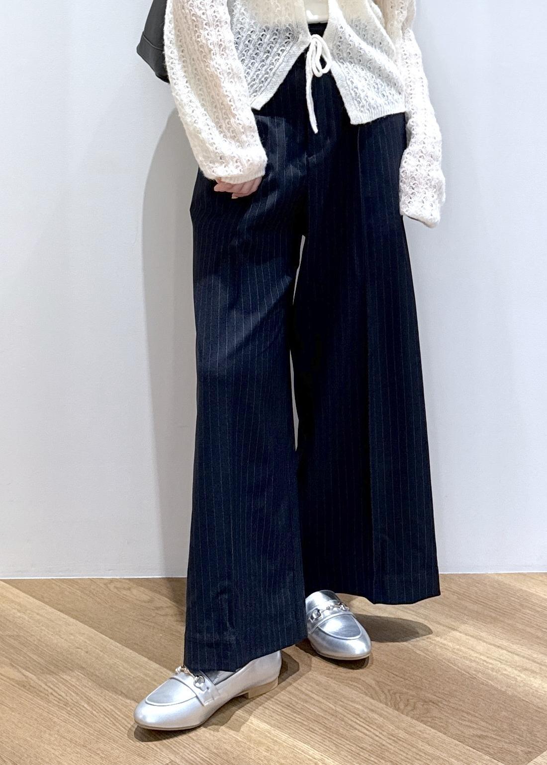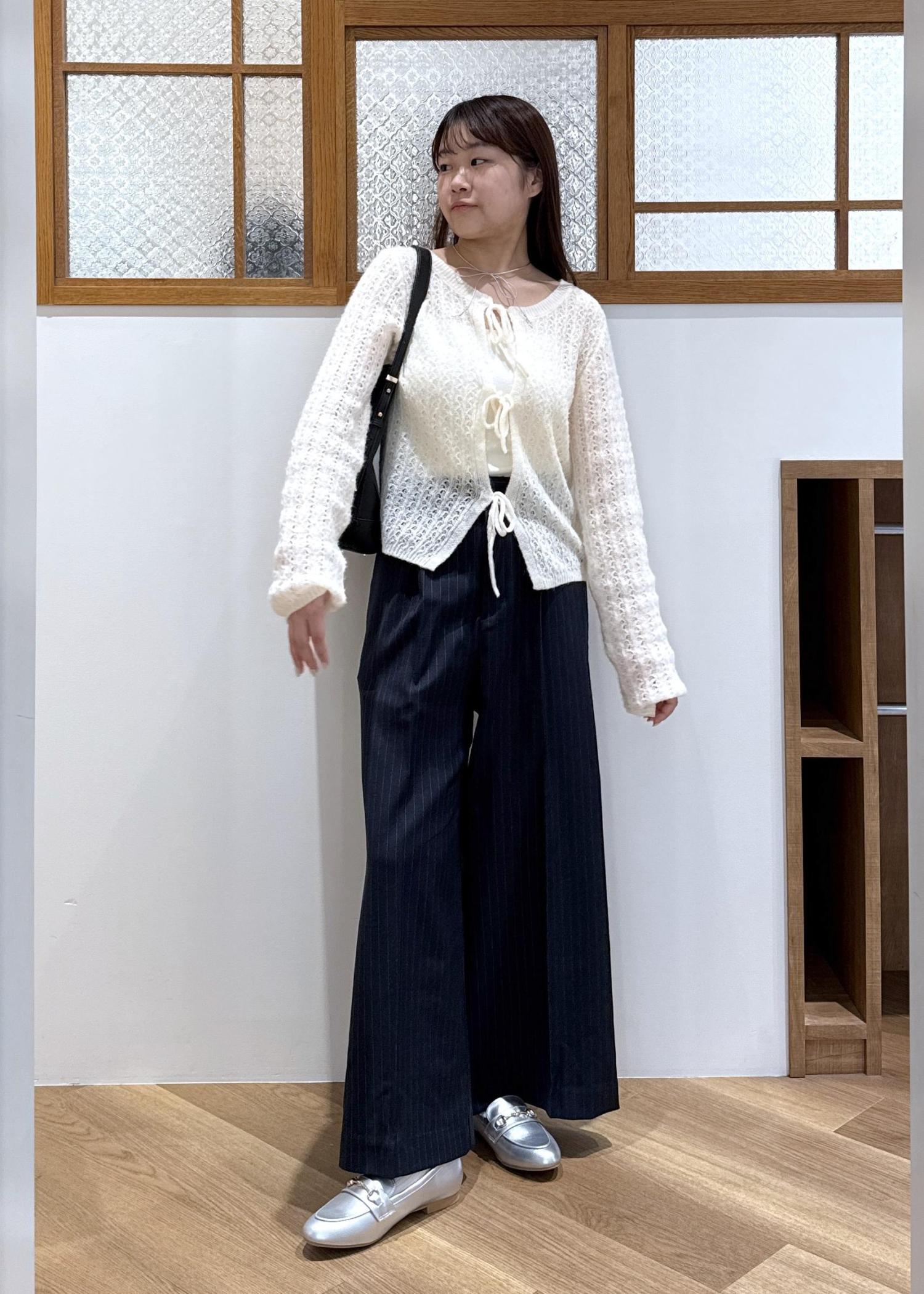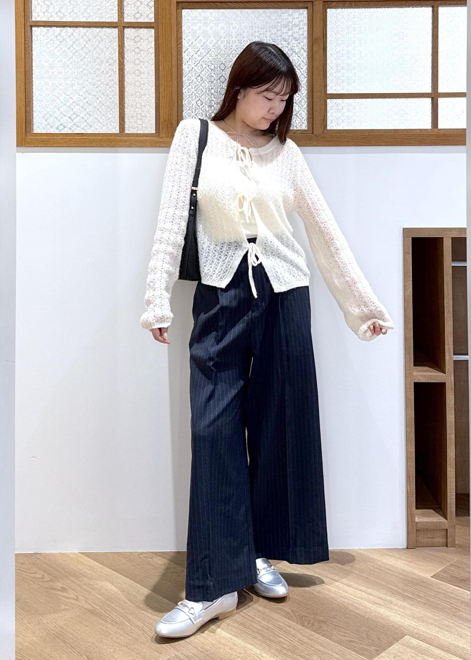 フロントのリボンがポイントのカーディガンにネイビーのストライプ柄パンツを合わせた、トレンド感のあるコーディネートです。