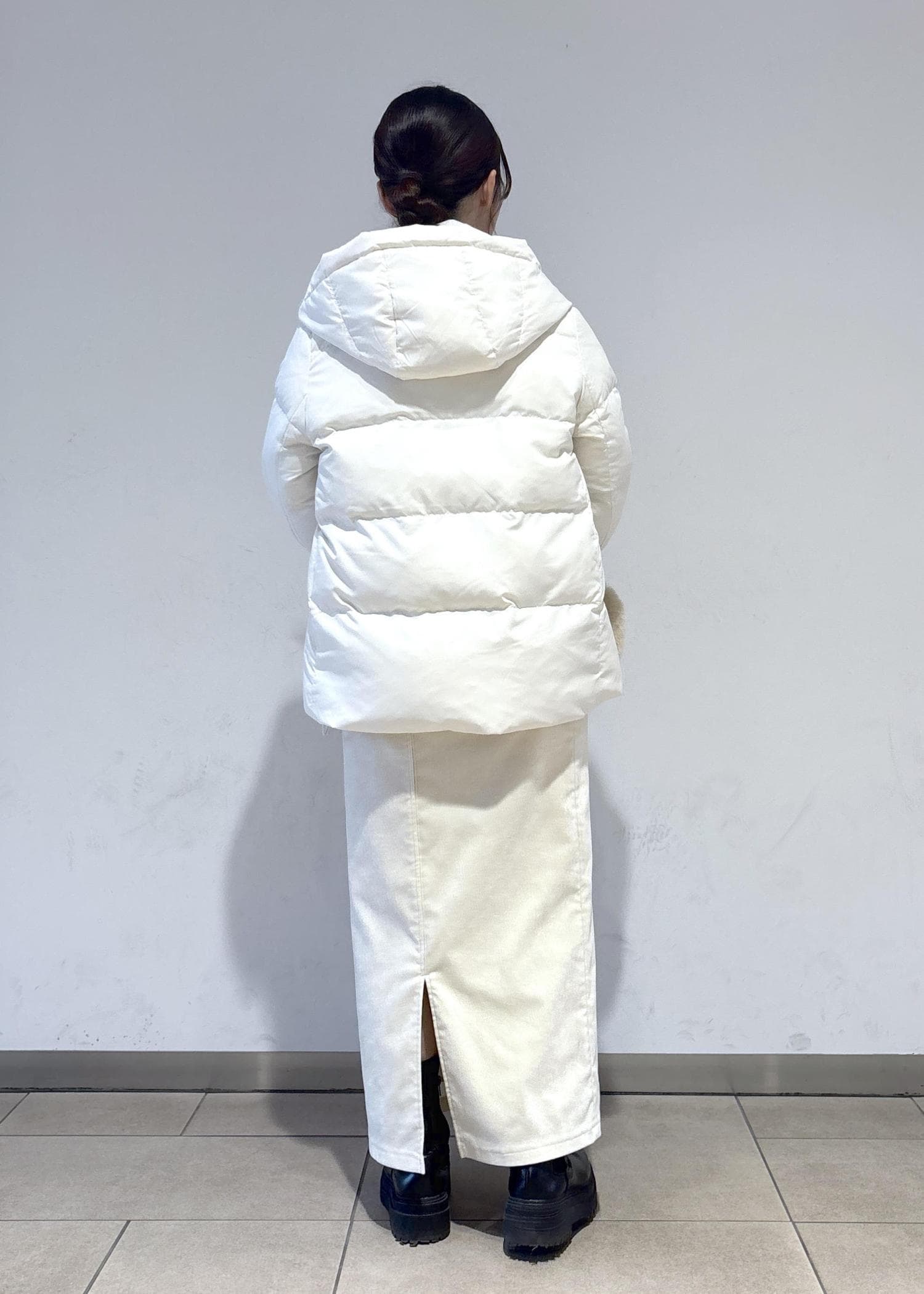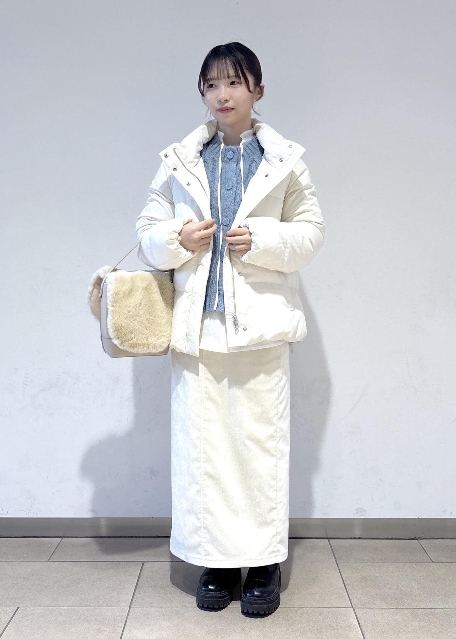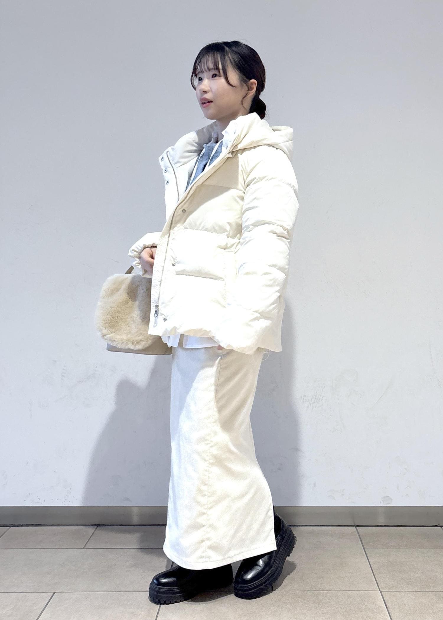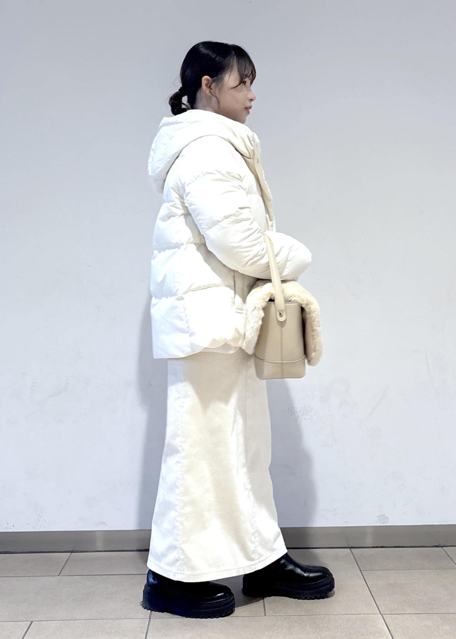 使いやすさ抜群のダウンと合わせて、白で統一感を出しつつ、差し色も入れた冬らしいコーディネートを意識しました。