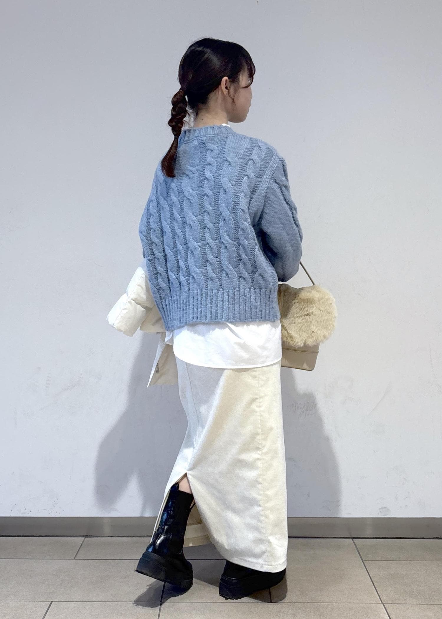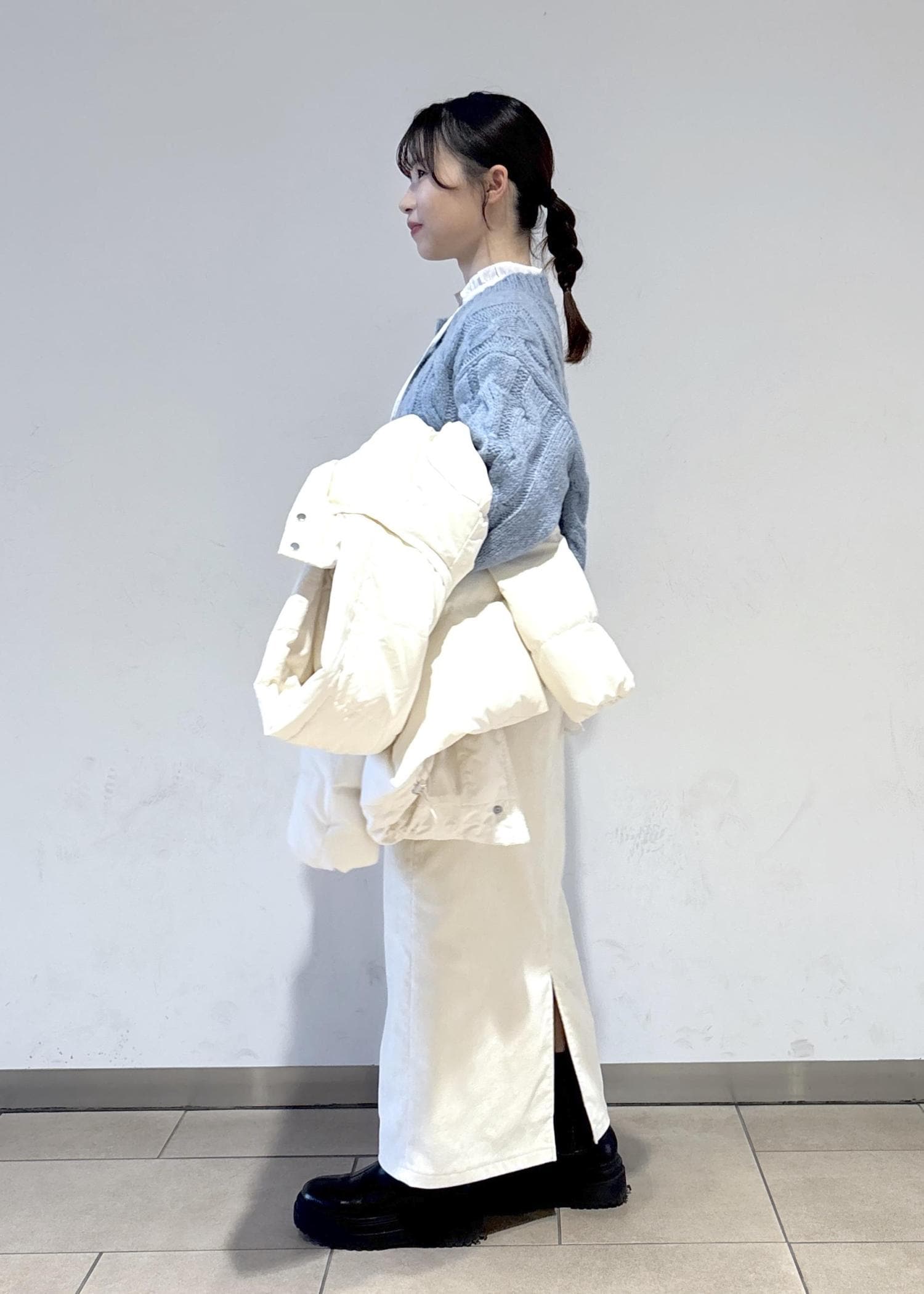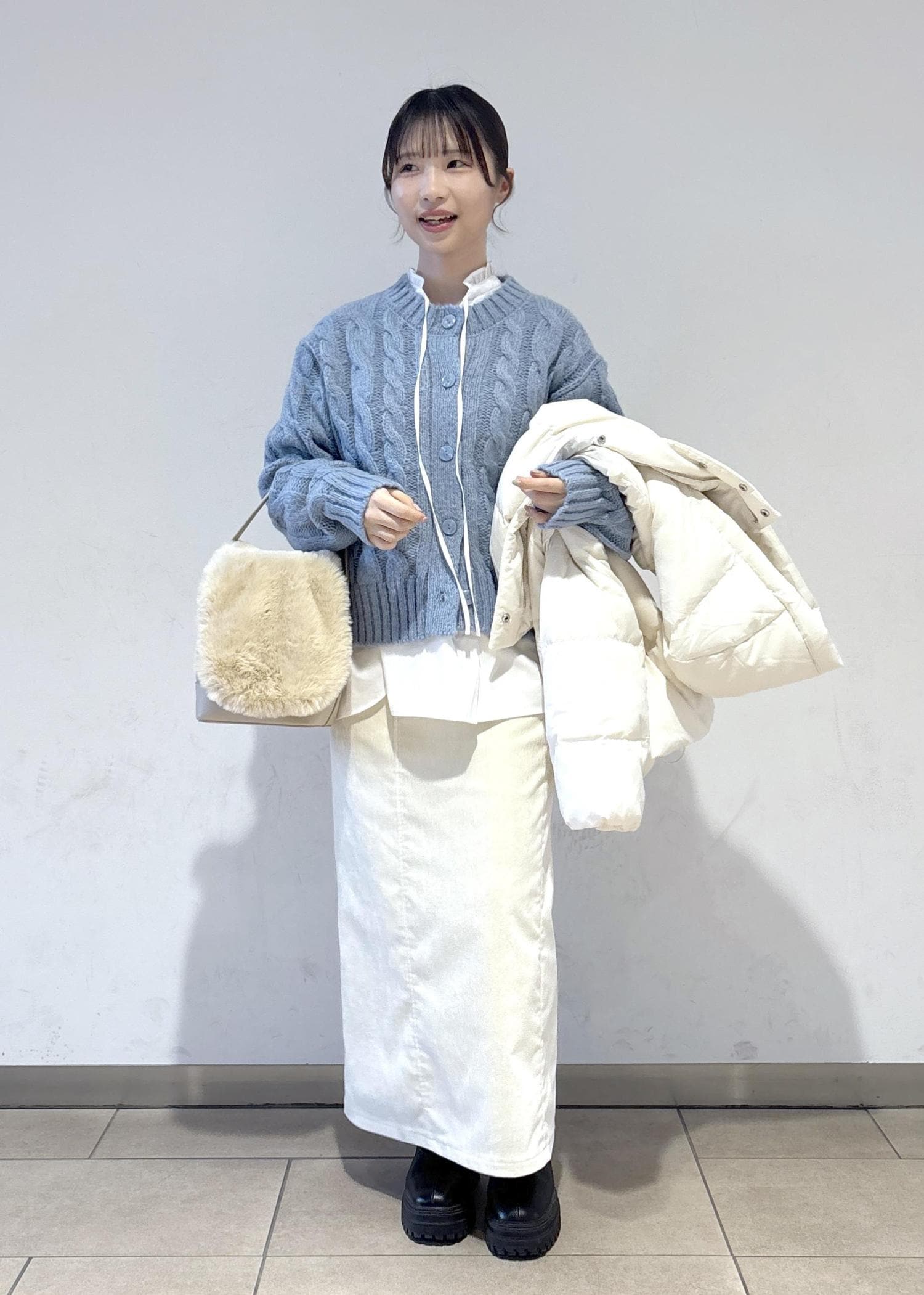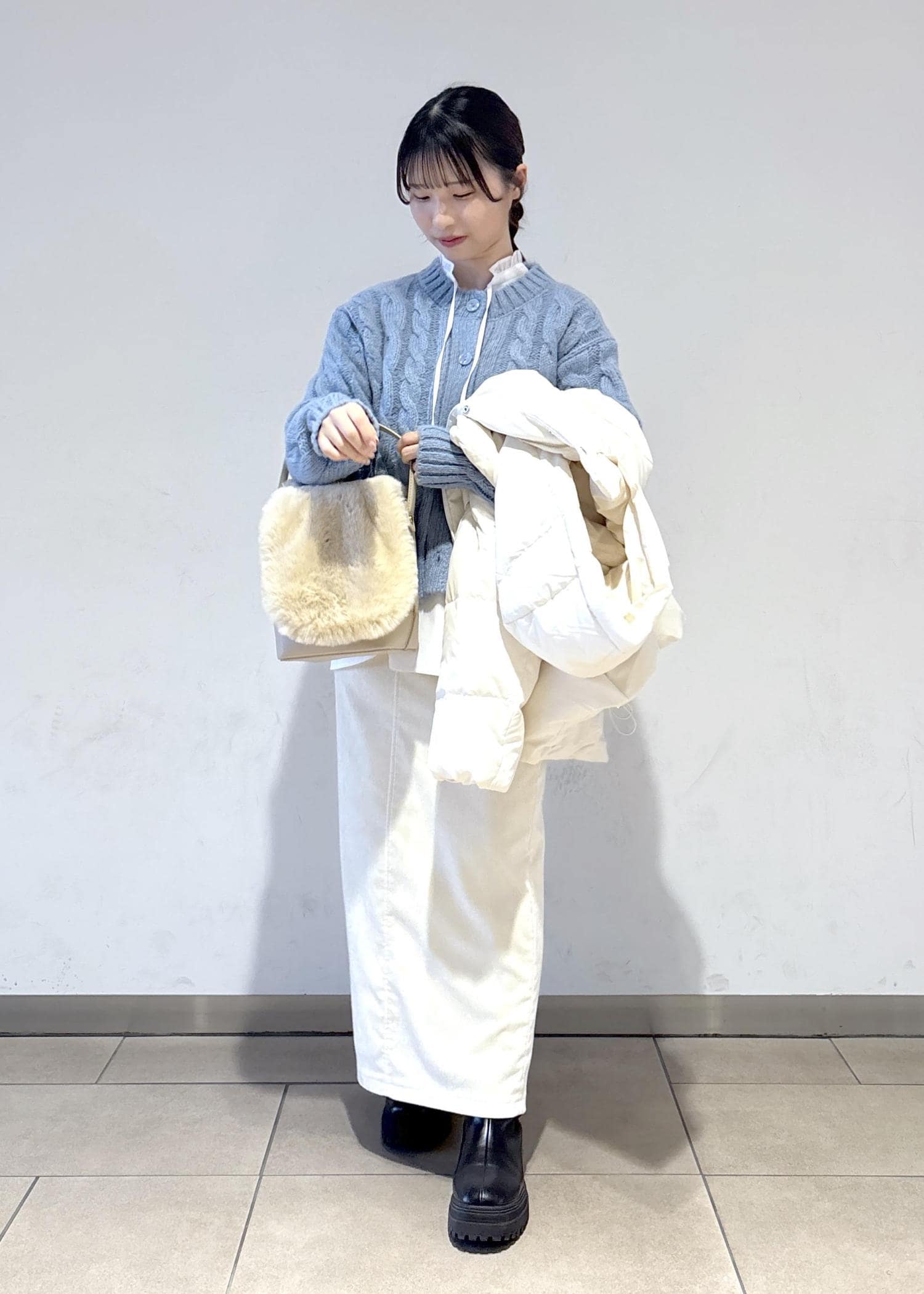 使いやすさ抜群のダウンと合わせて、白で統一感を出しつつ、差し色も入れた冬らしいコーディネートを意識しました。