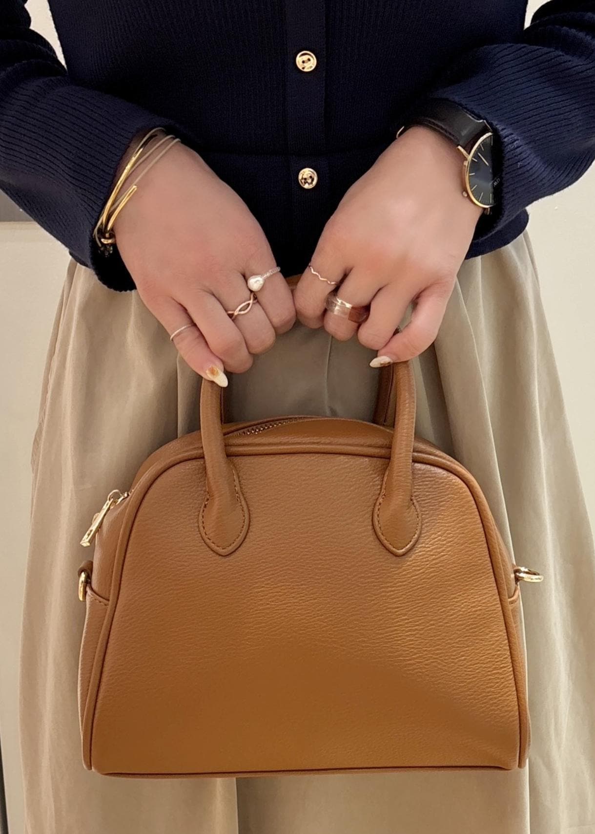 キャメルカラーが綺麗なミドルサイズのボストンバッグは、容量があるので荷物が1つにまとまります。