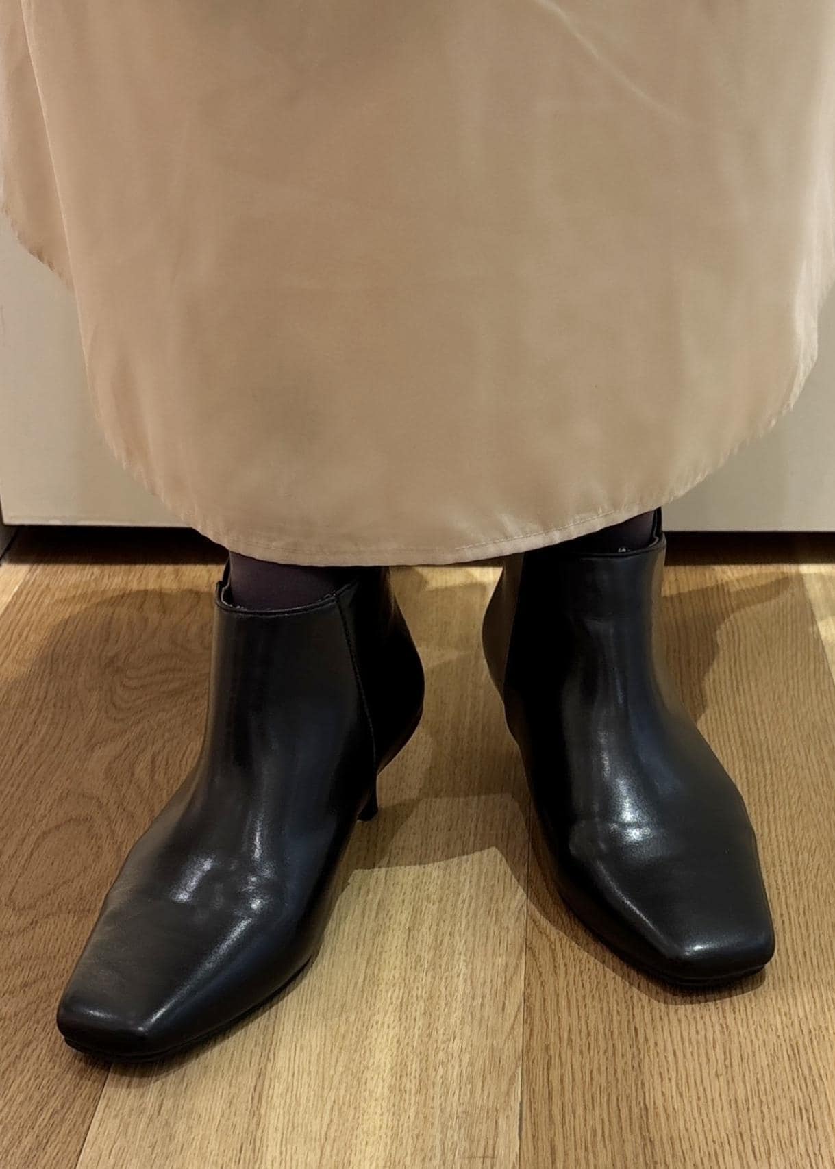 筒丈の低いショートブーツは、スカートとの間に隙間が開くので、足が細見えします。