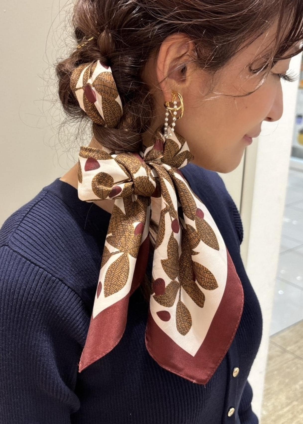 最後に、ブラウン系のリーフ柄スカーフを編み込んでアクセントにしました。