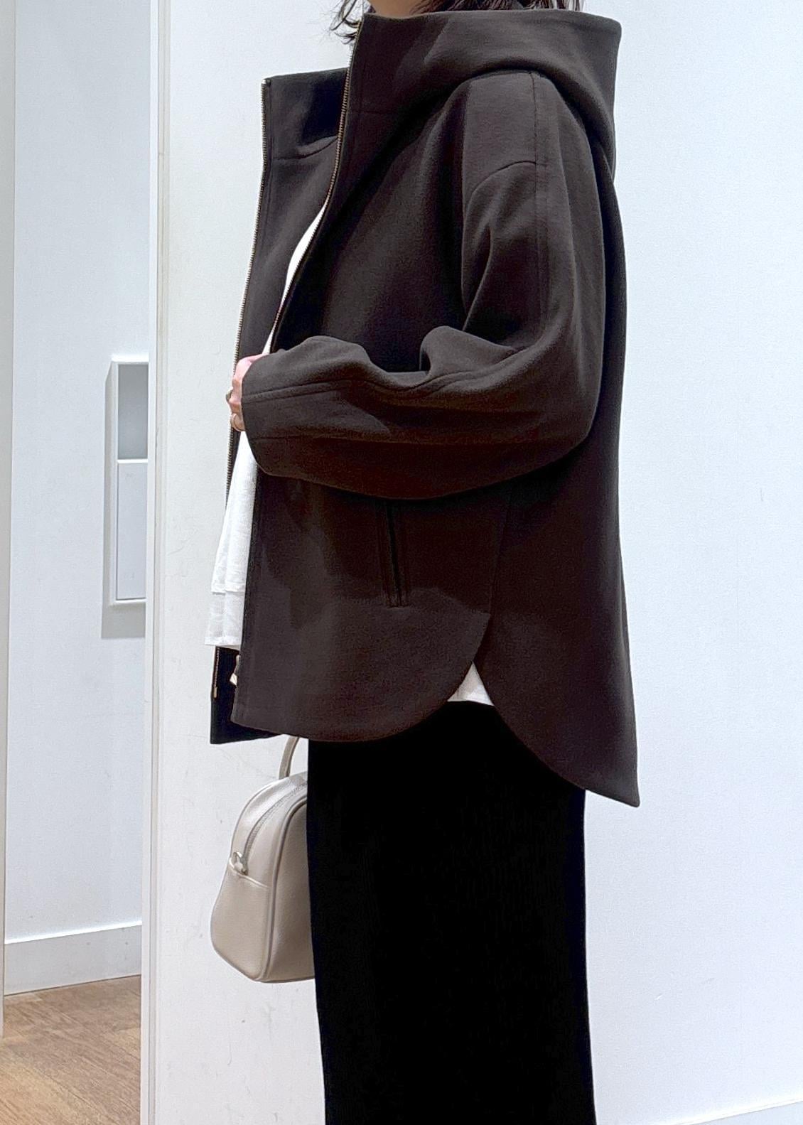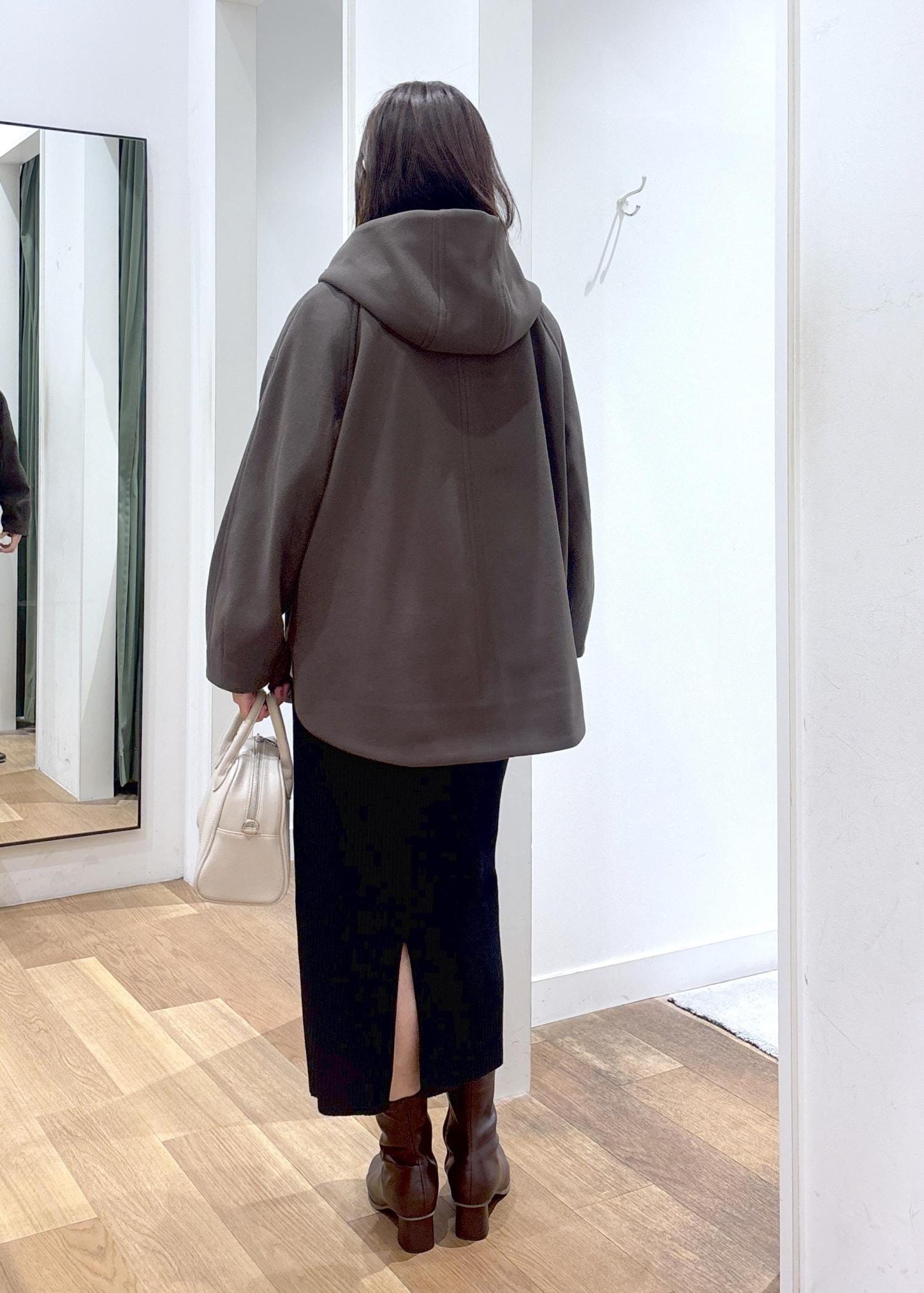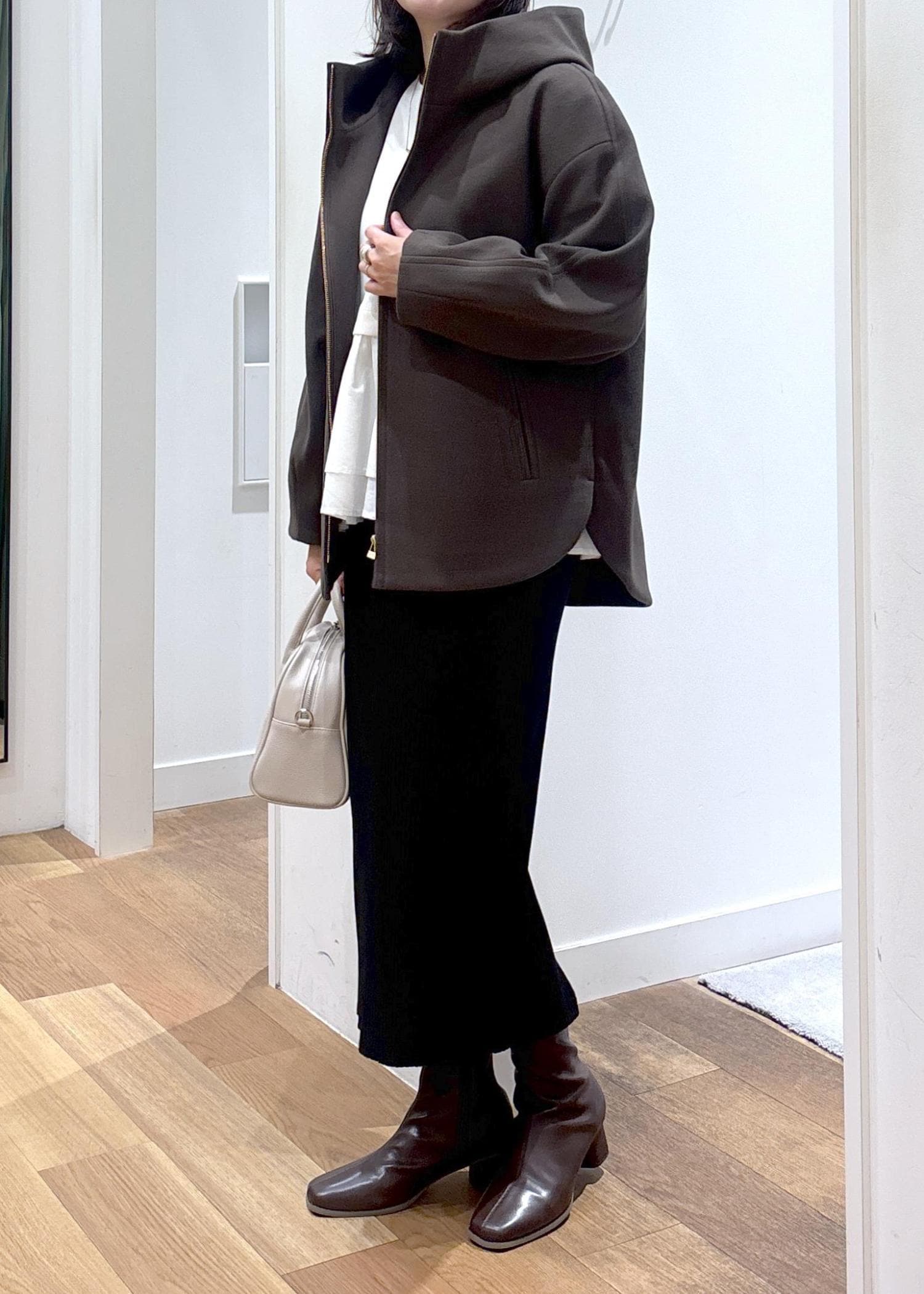 着込めるゆとりもあるので、中に厚地のニットも問題なく着用できます。着丈は前後差があり、後ろはお尻が隠れるくらいの長さです。 -