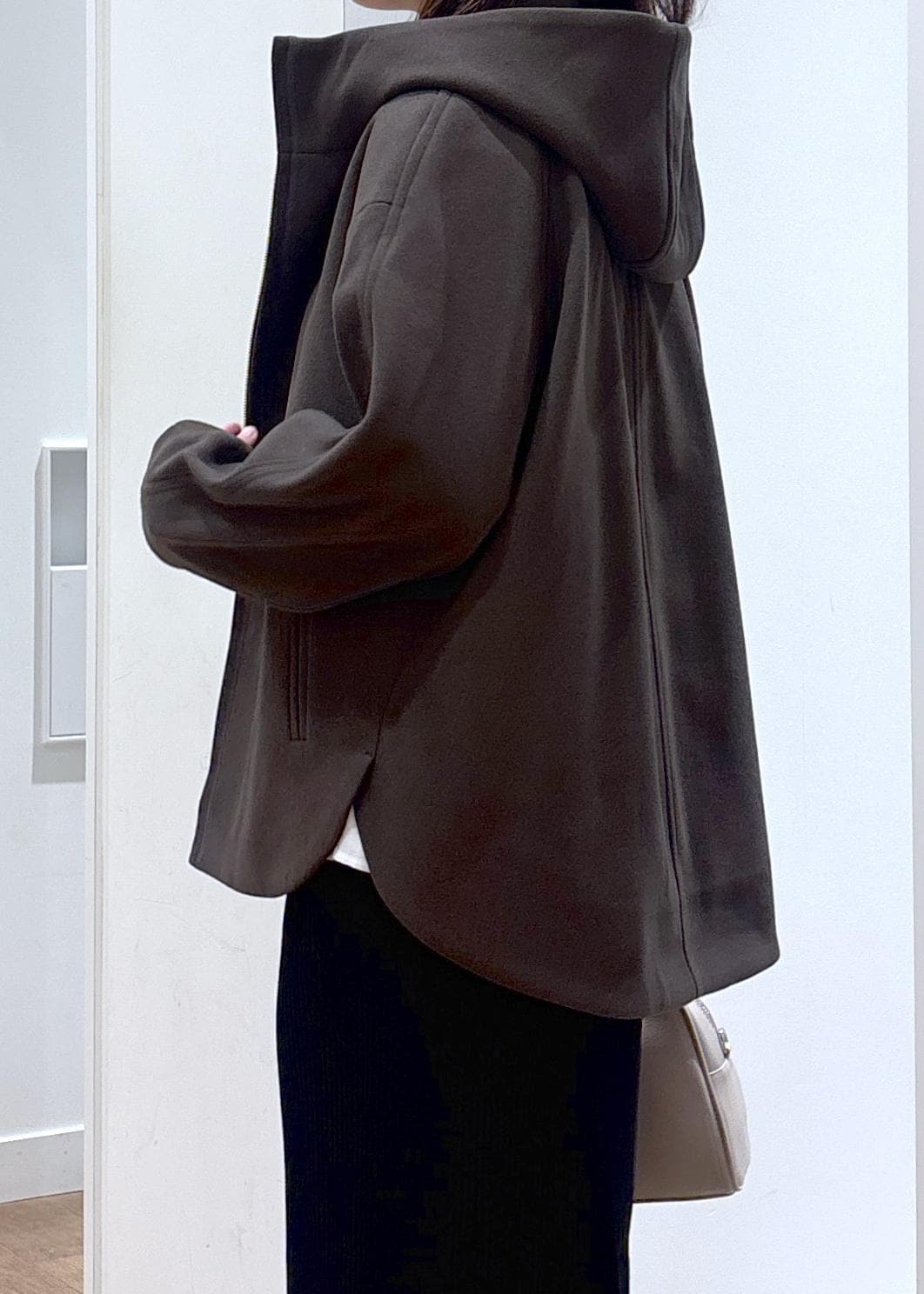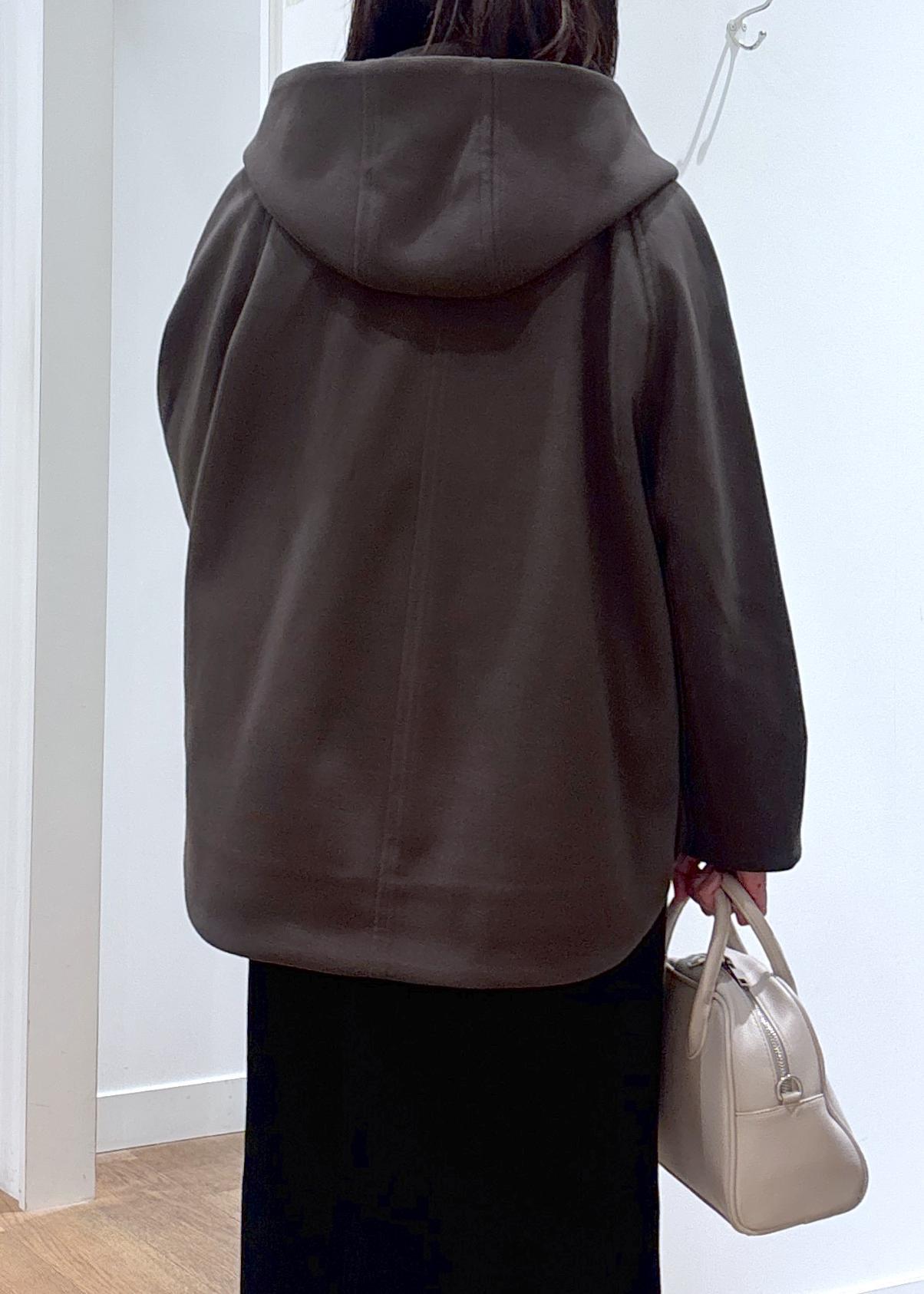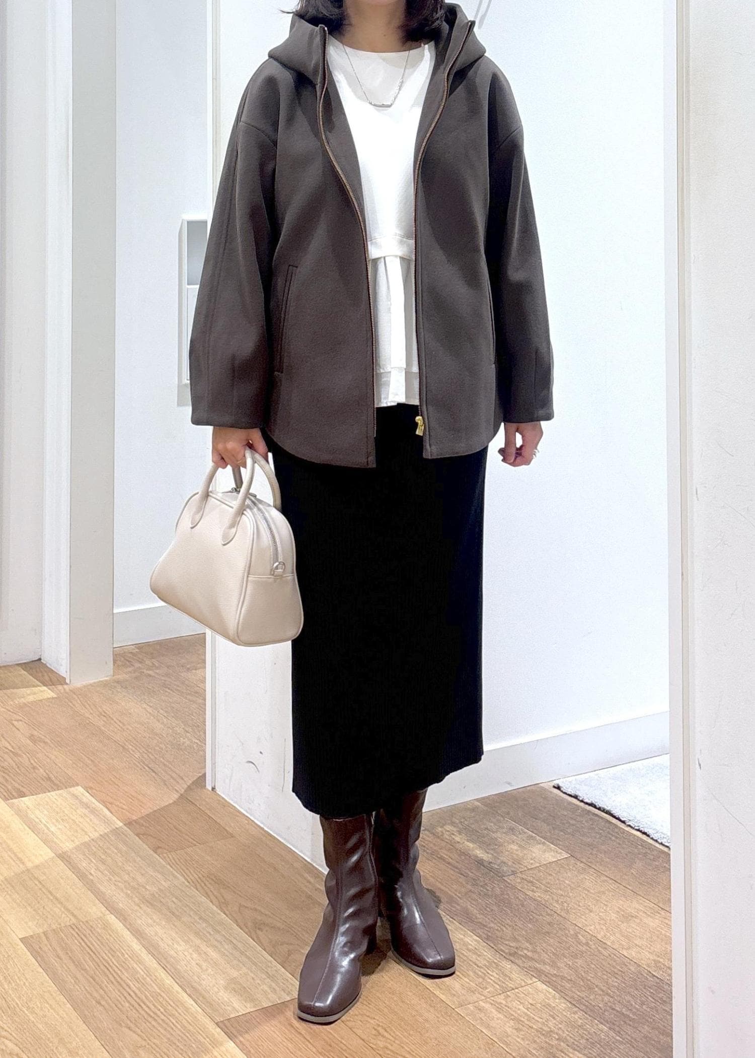 着込めるゆとりもあるので、中に厚地のニットも問題なく着用できます。着丈は前後差があり、後ろはお尻が隠れるくらいの長さです。 -