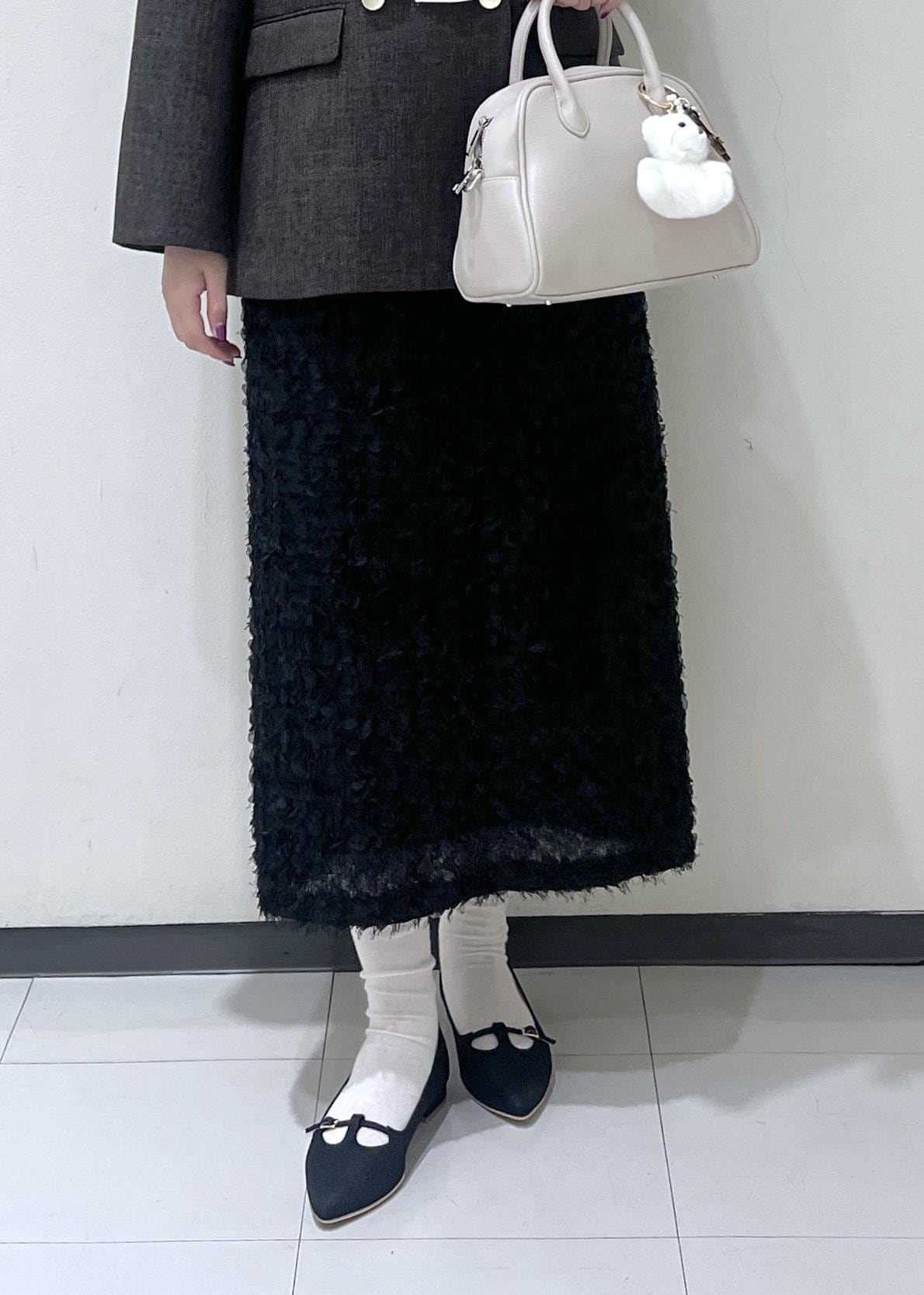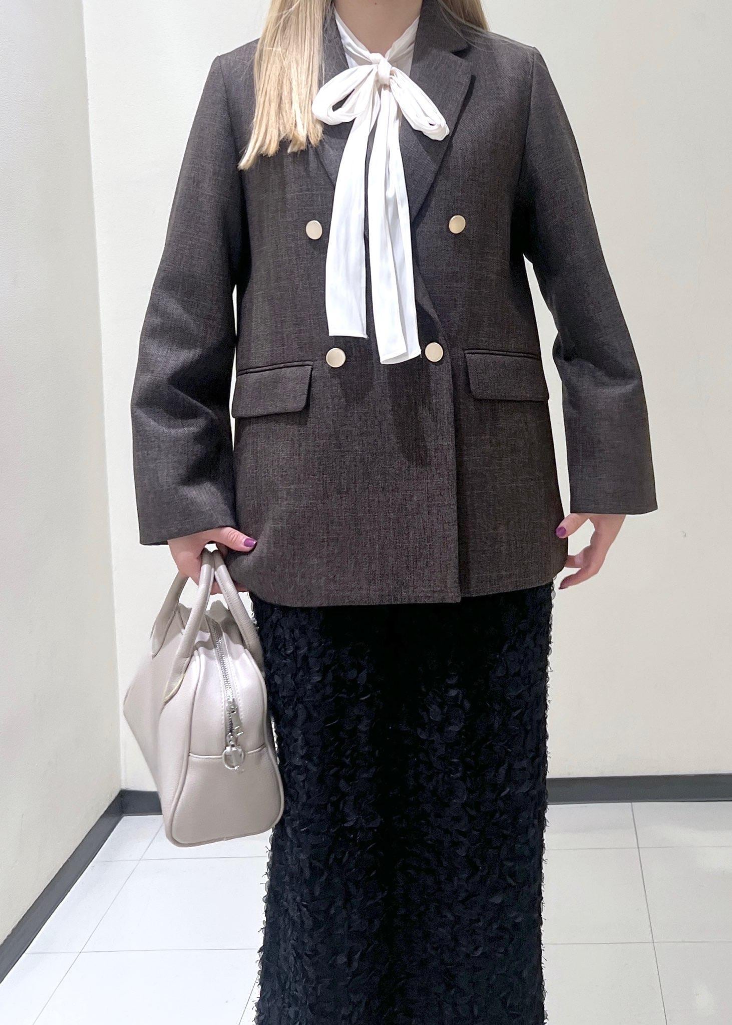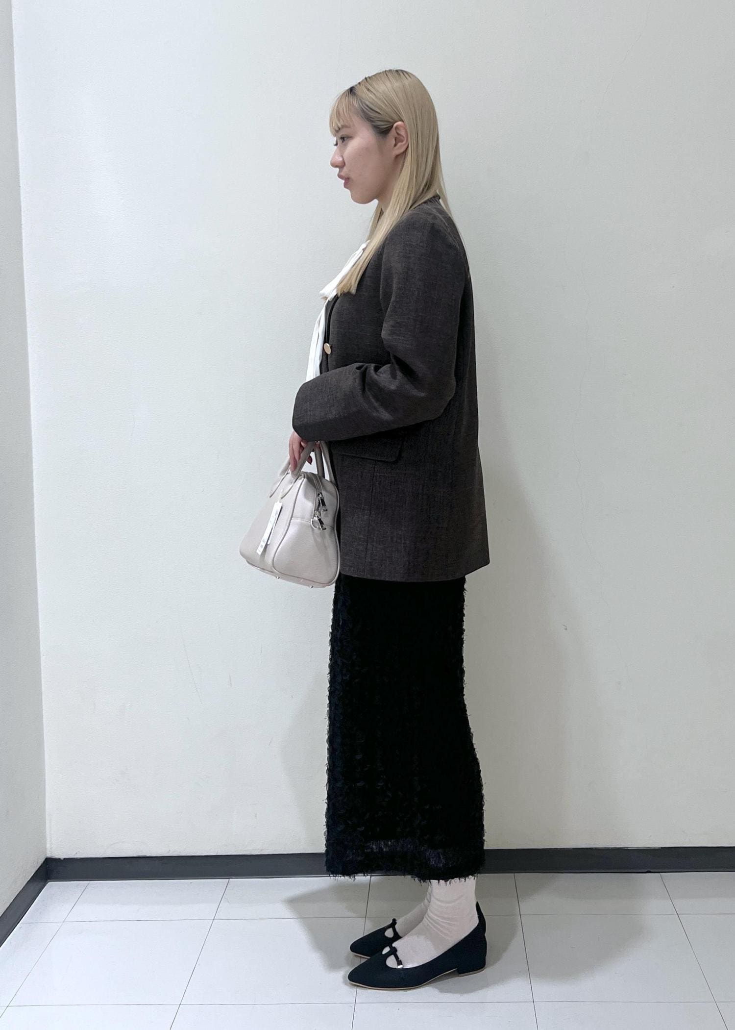 ゆとりがあるオーバーサイズのジャケットなので中をリボンブラウスとアイラインスカートを合わせることできれいめスタイルにしました。
