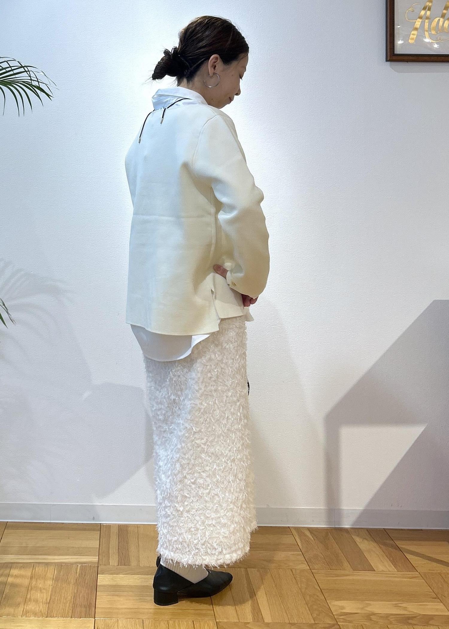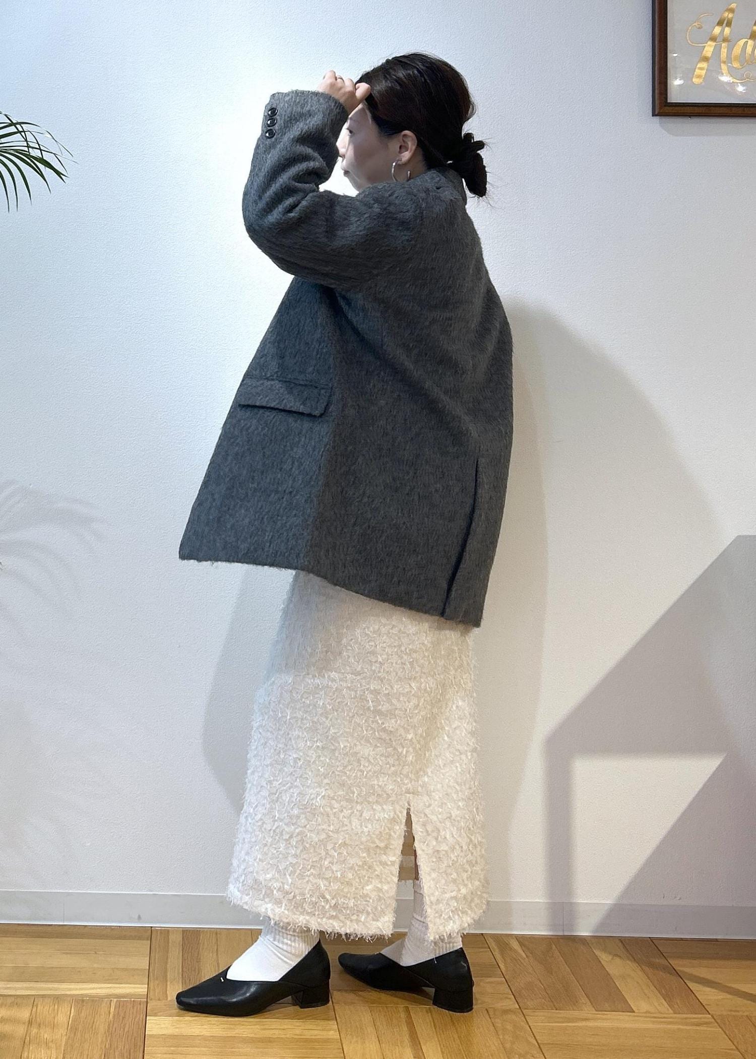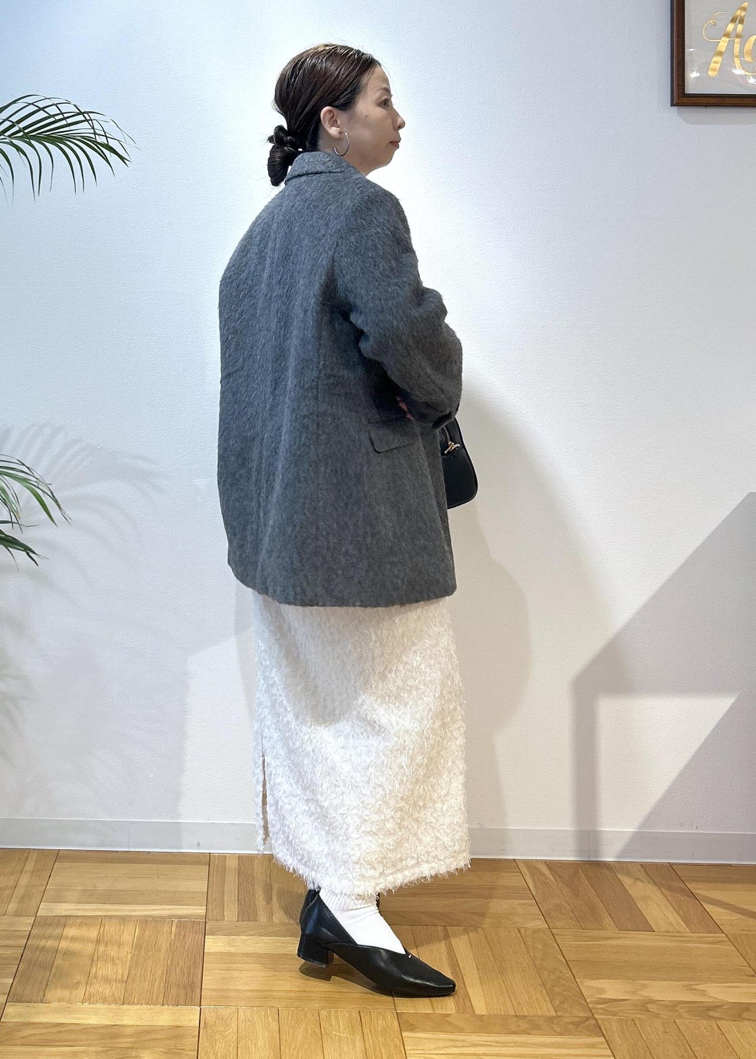ROPÉ PICNICシャギーテーラードジャコットグレー / F¥13,200レビュー袖は、手の甲が隠れる長さです。着丈はお尻がすっぽりかかる丈です。生地は軽いので羽織りやすく、ニットとシャツを重ねて肩まわりは丁度良い感じでした。