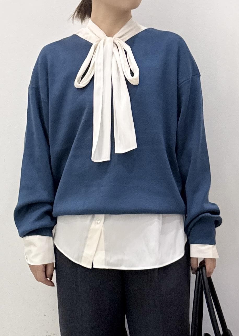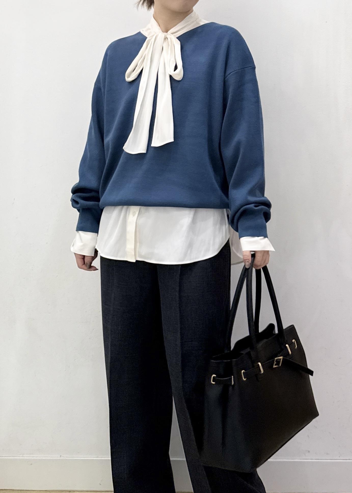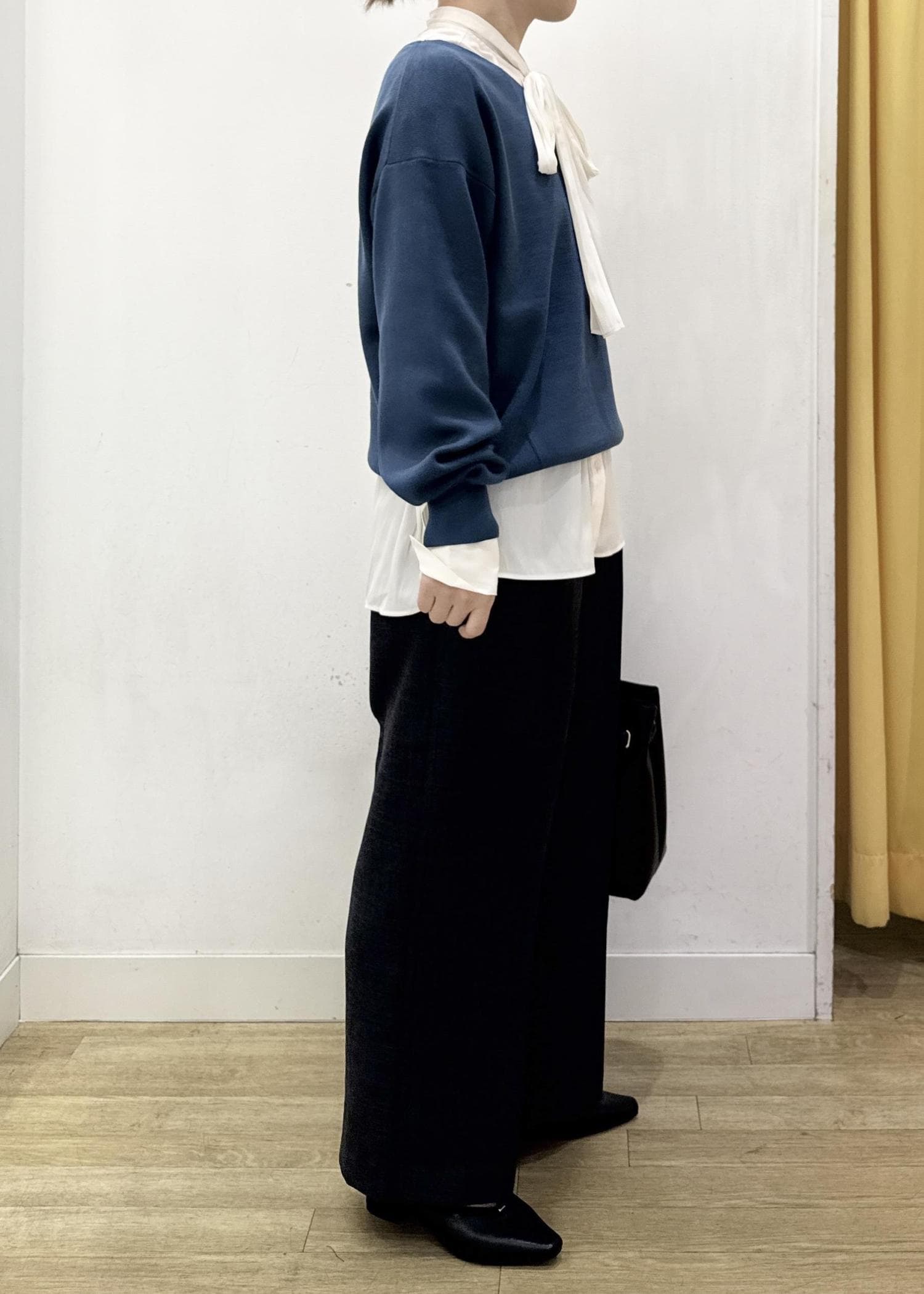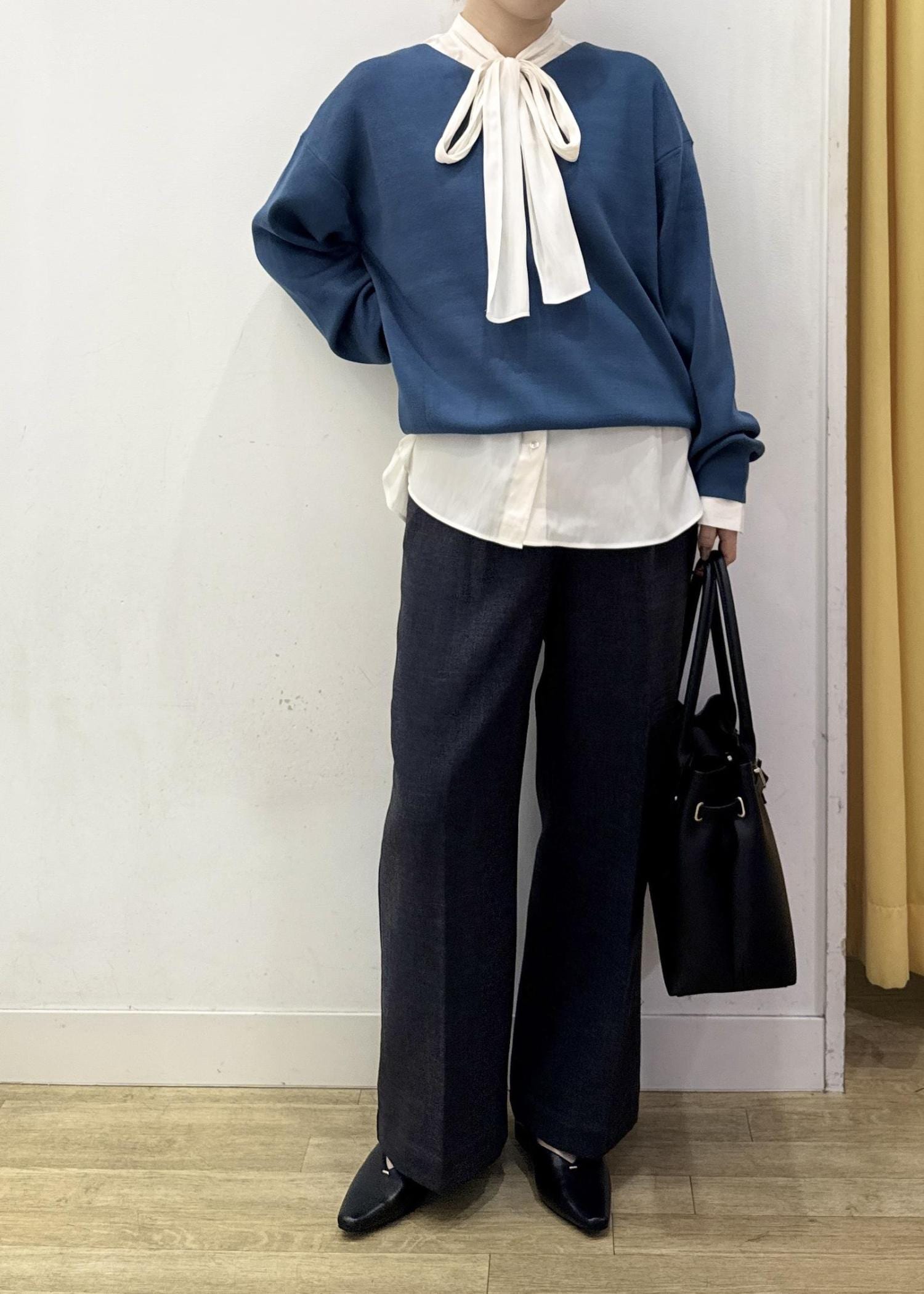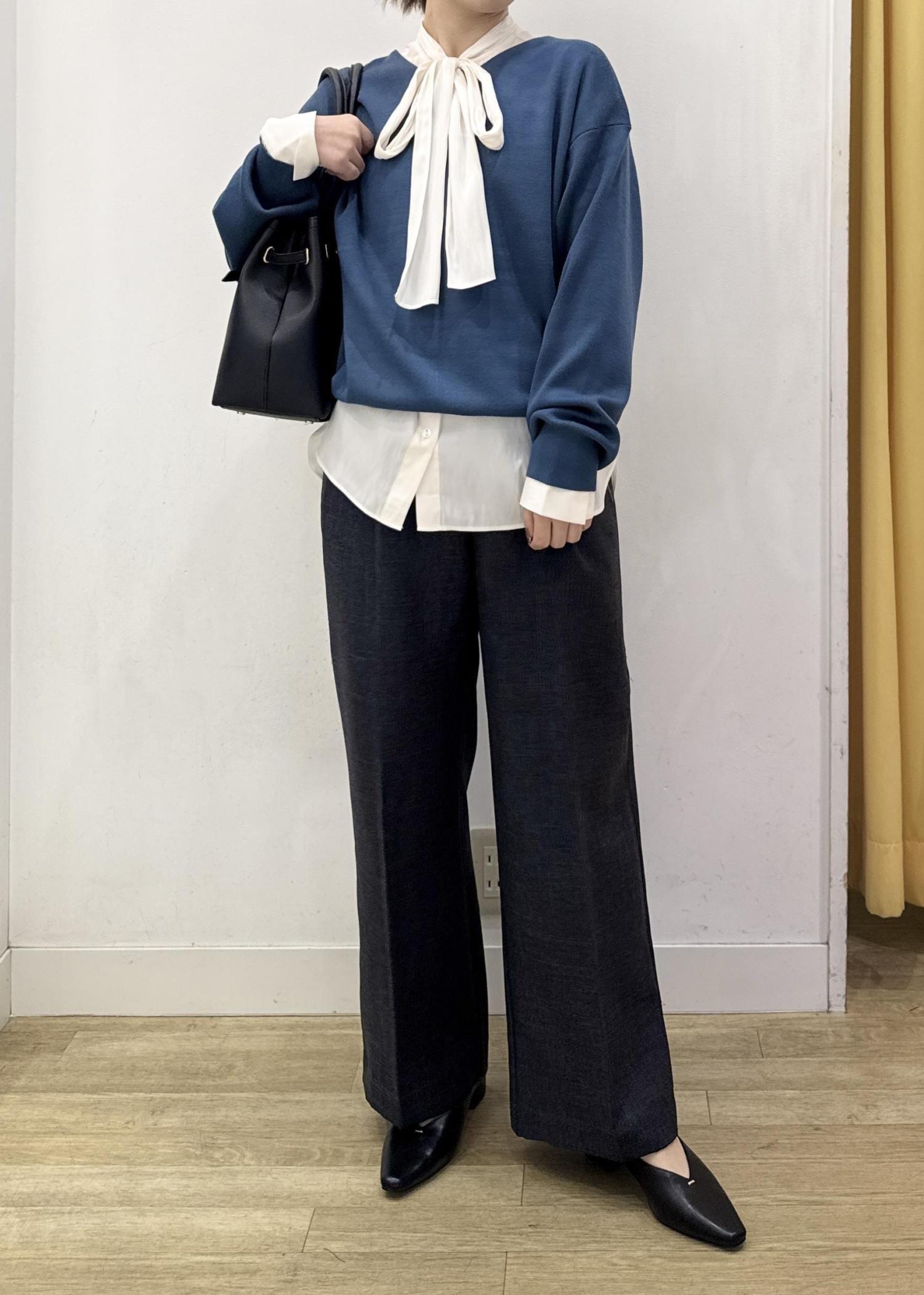 Vネックと袖口、裾のリブがすっきり見せしてくれるシンプルニットは、一枚あると様々なボトムに合わせられるのでオススメ! -