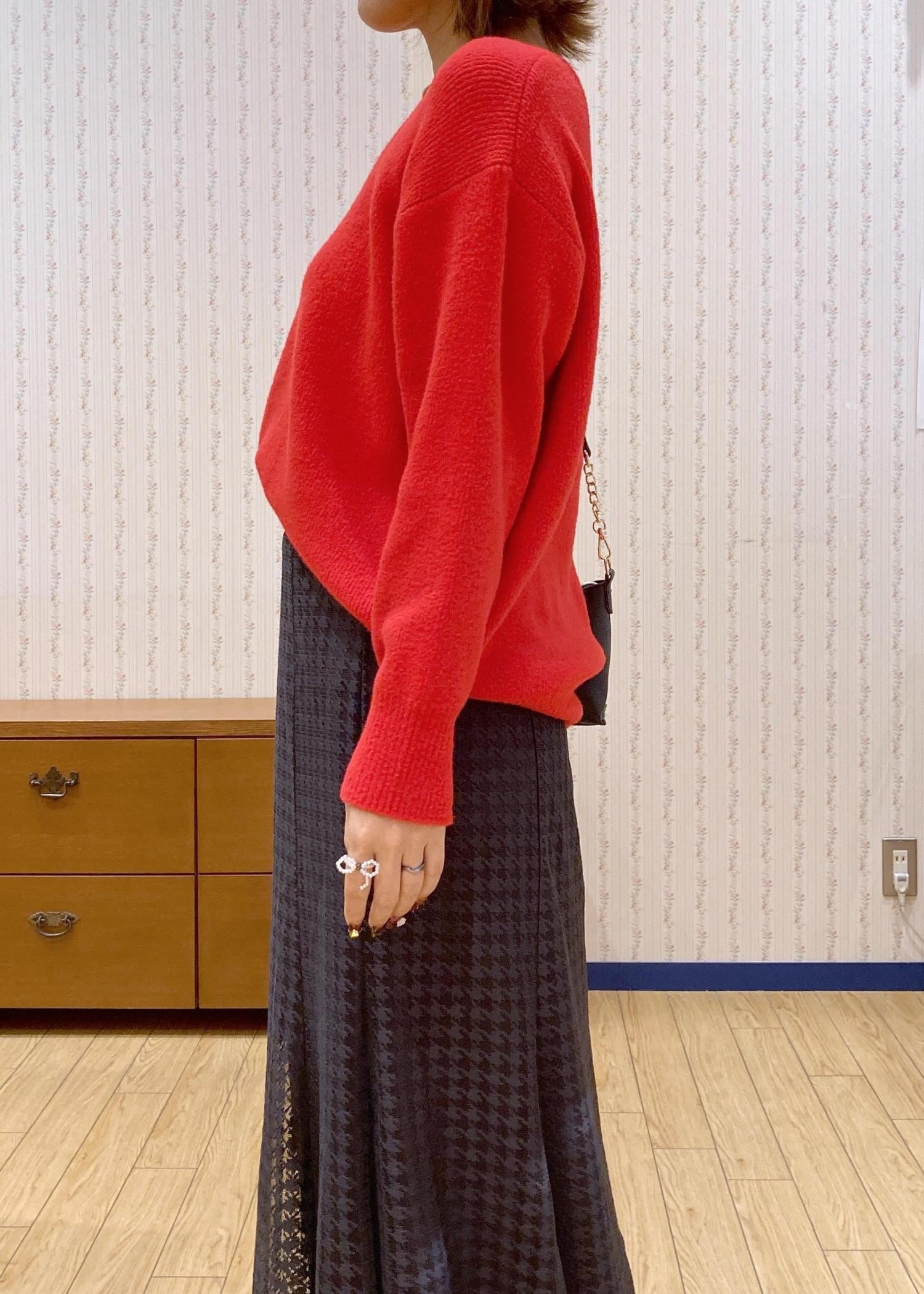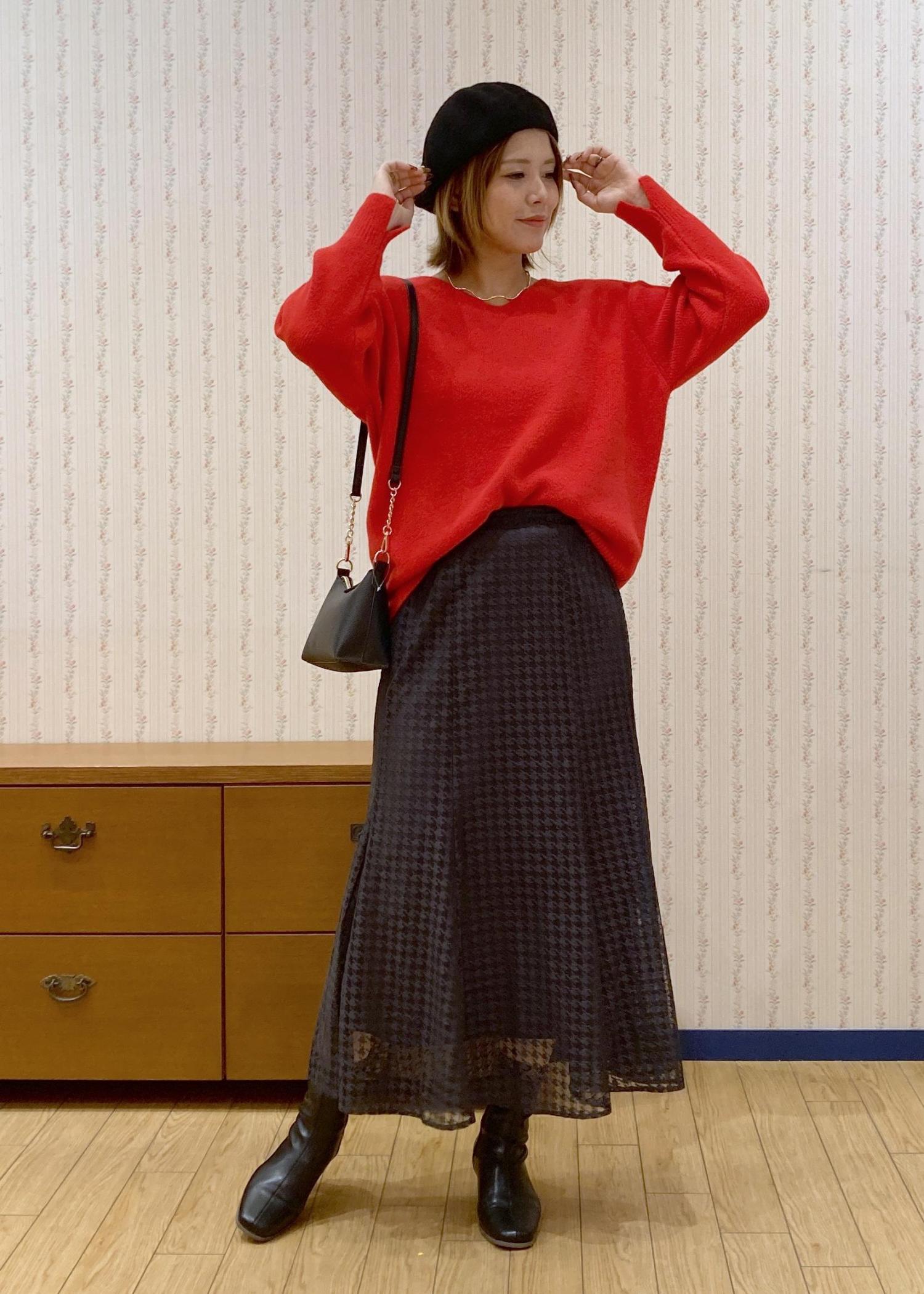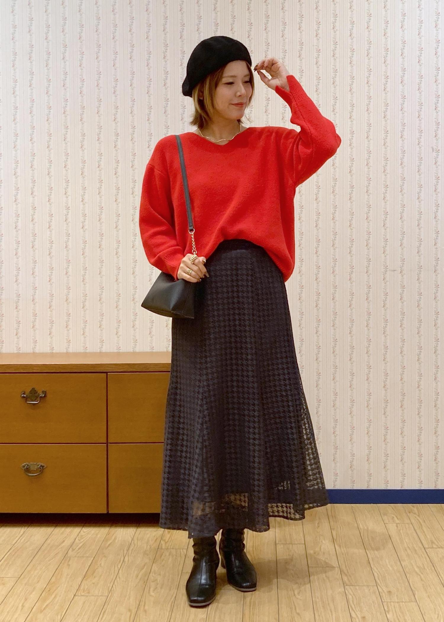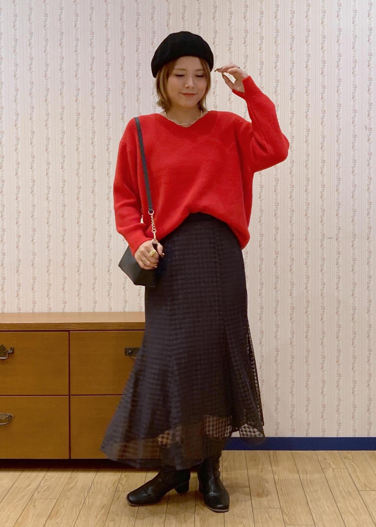 レッドカラーのニットが主役のキレイめカジュアルコーディネートです。