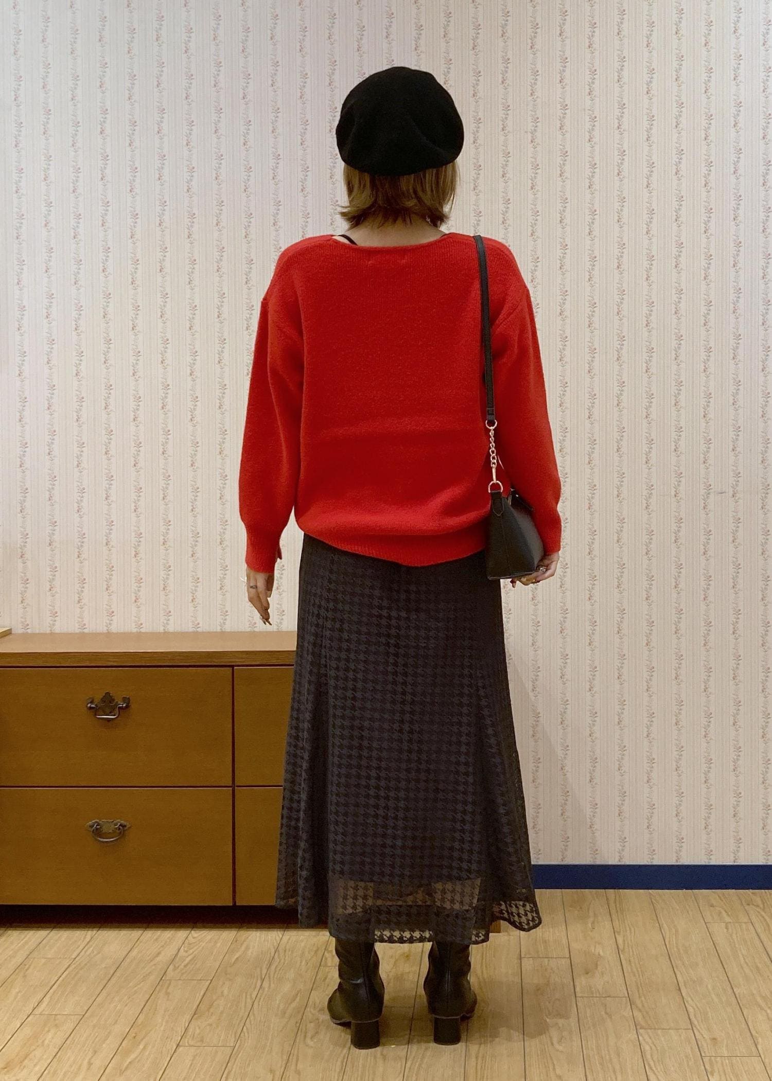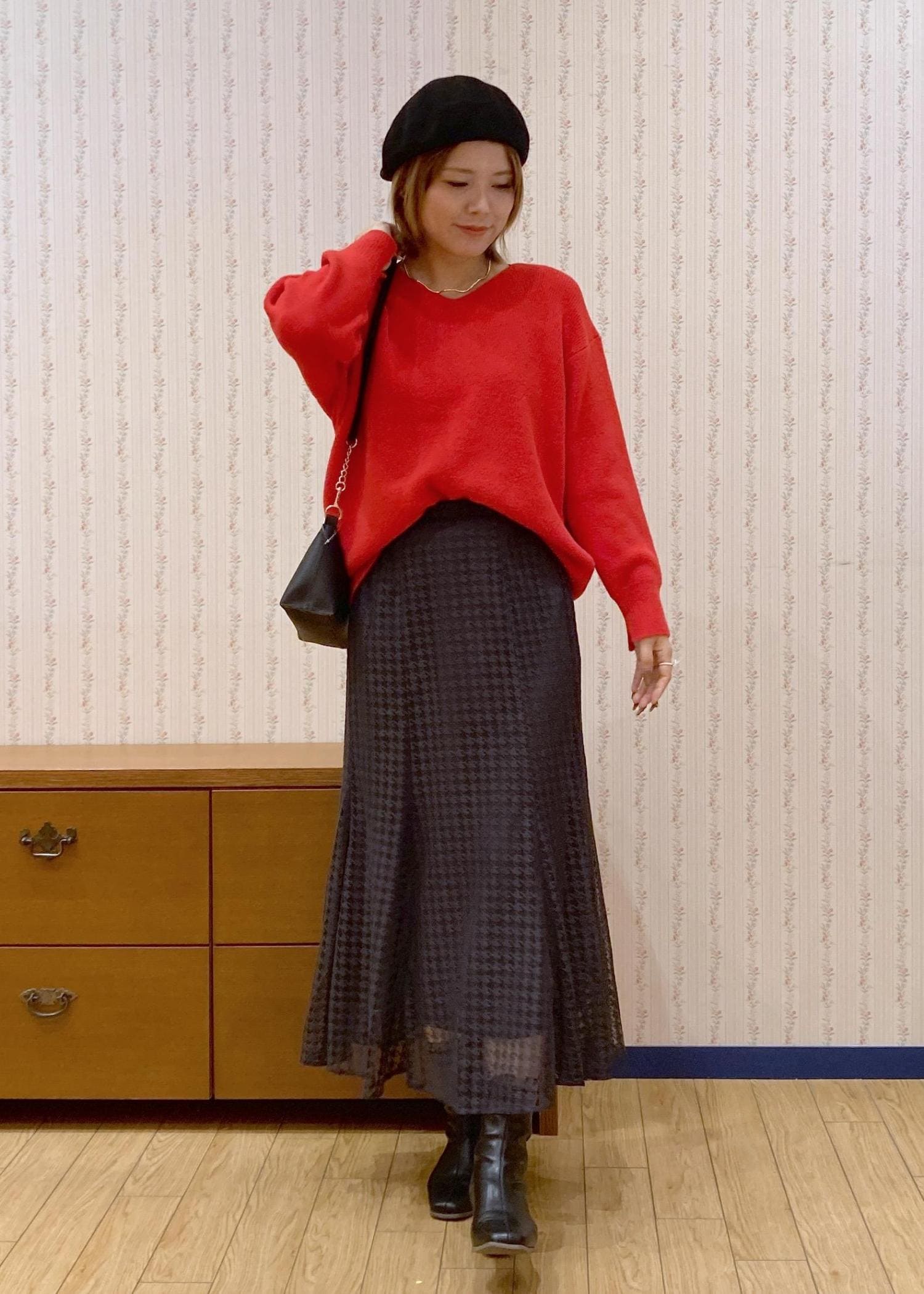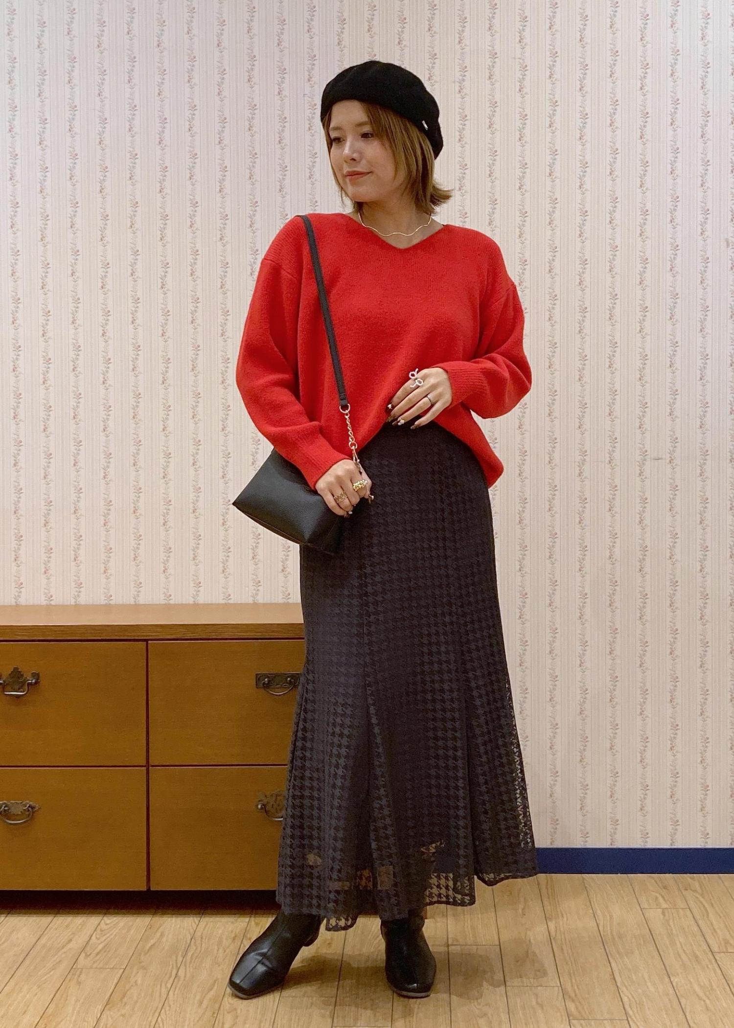 千鳥柄レースのスカートがフェミニンな印象なので、可愛いに寄りすぎないようにニット以外はブラック系でまとめて大人可愛くコーディネートしました!