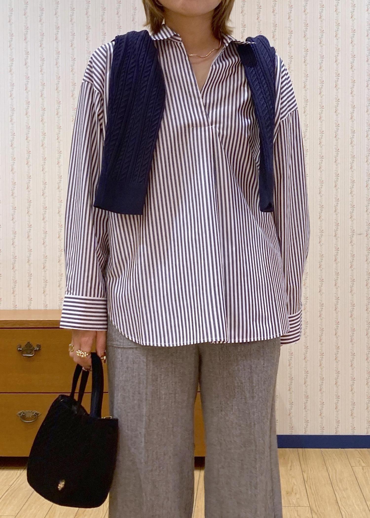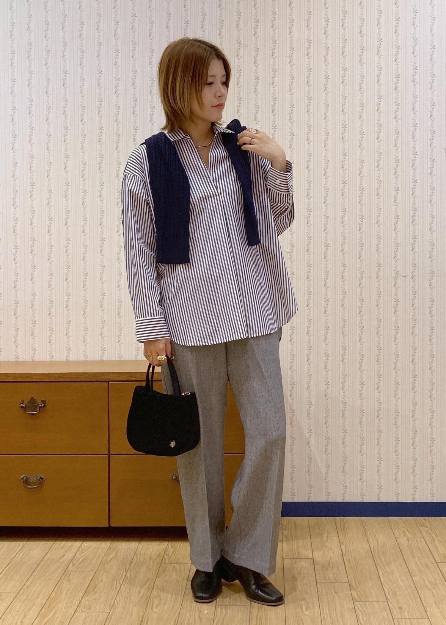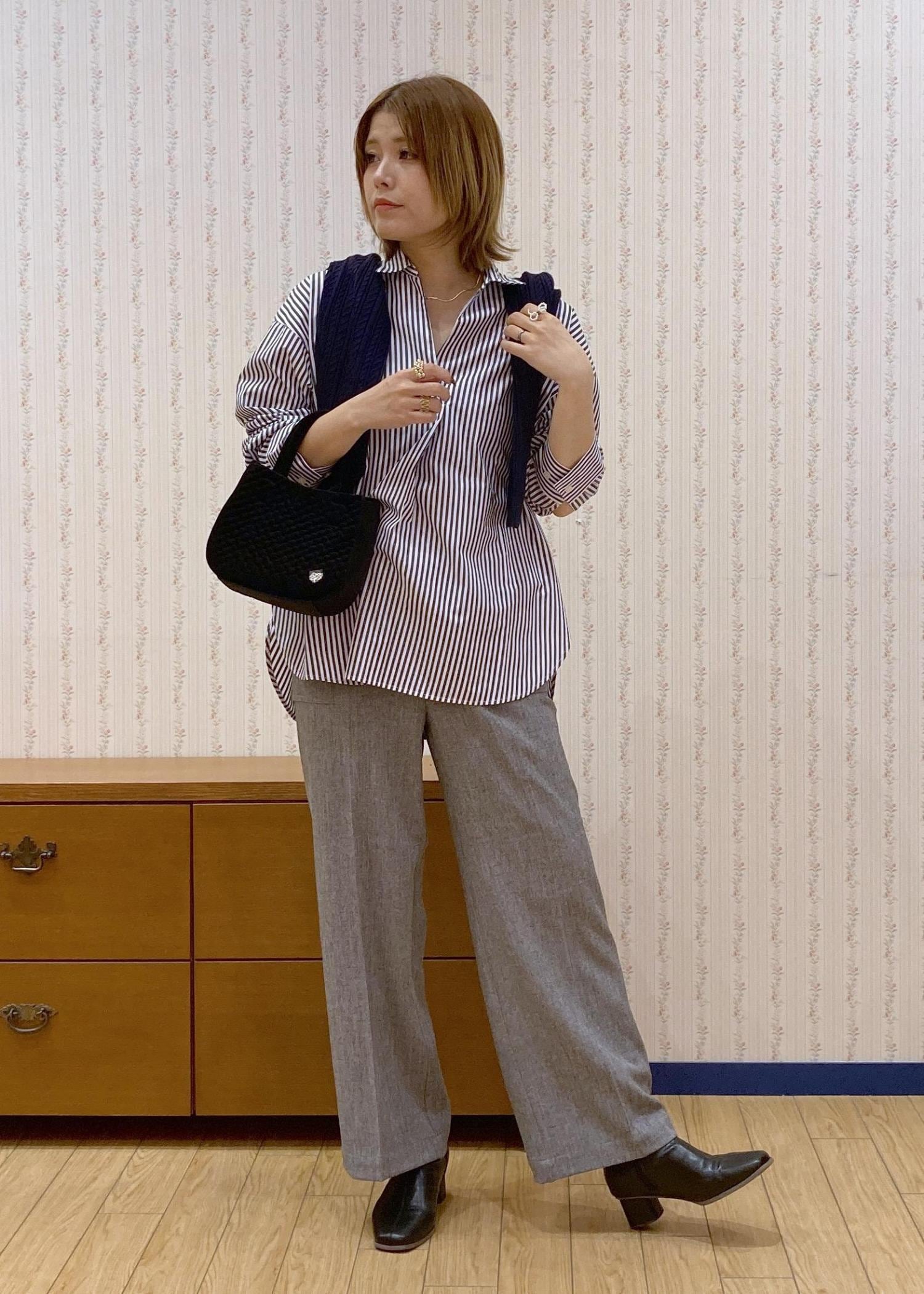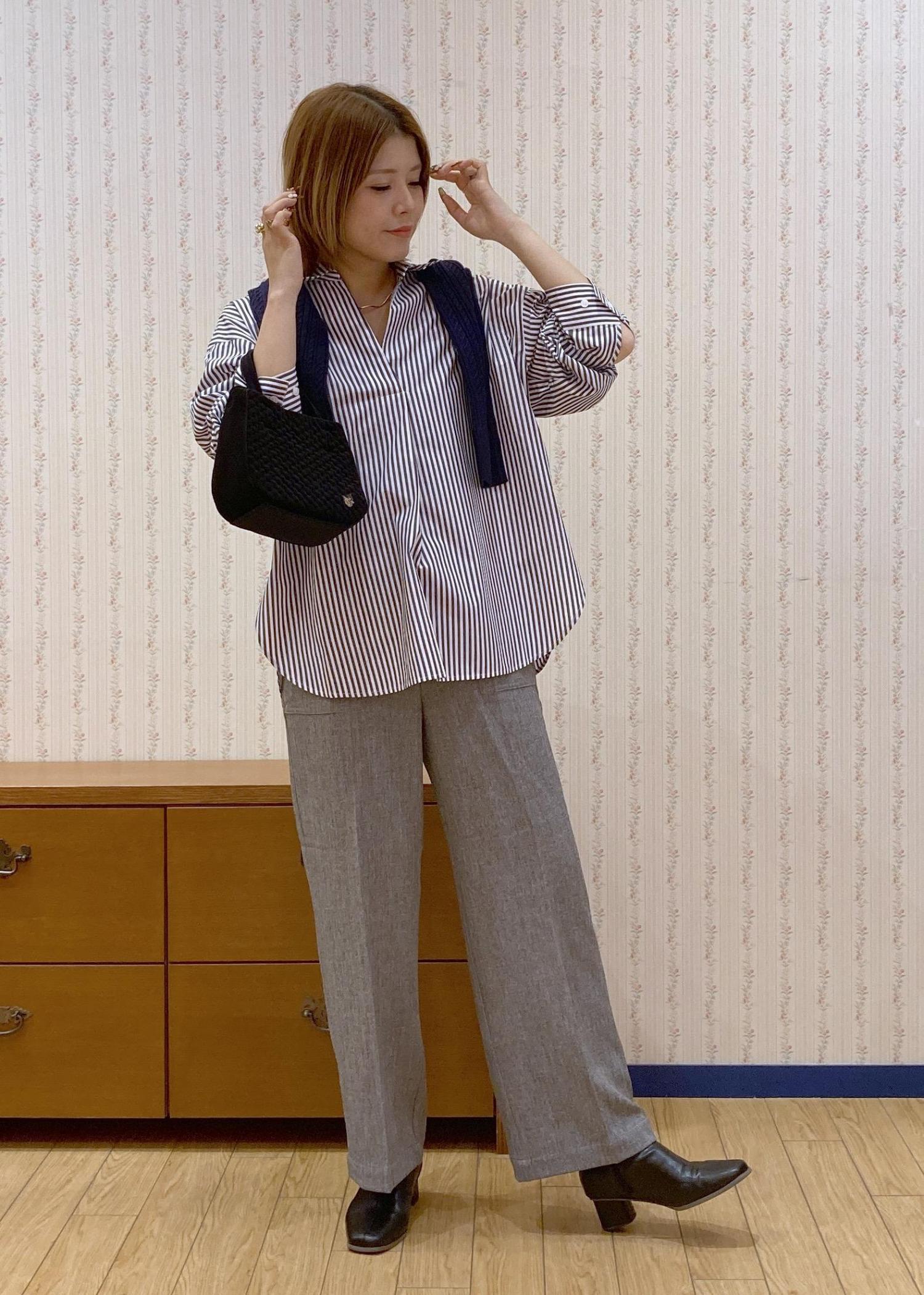 スキッパーシャツで首元をスッキリ見せて、肩がけカーディガンで目線を高くしてスタイルアップを狙ってます!