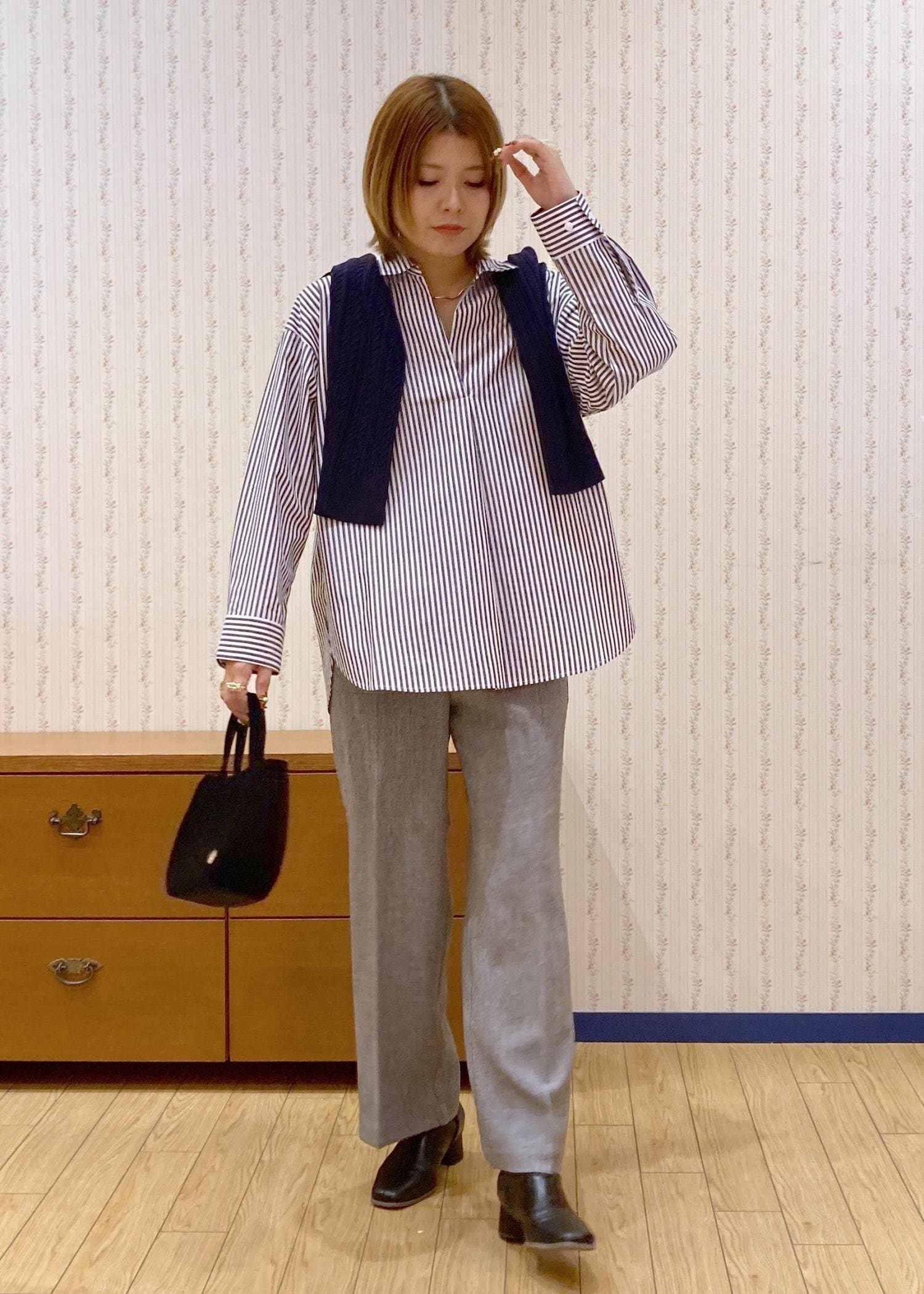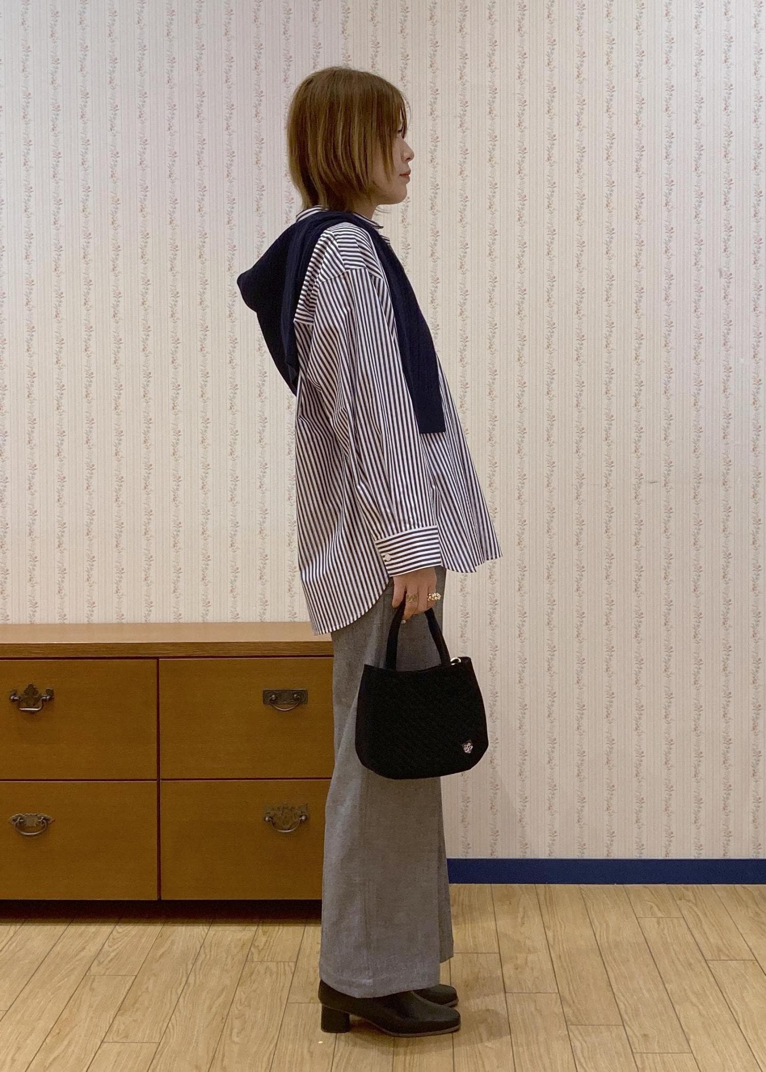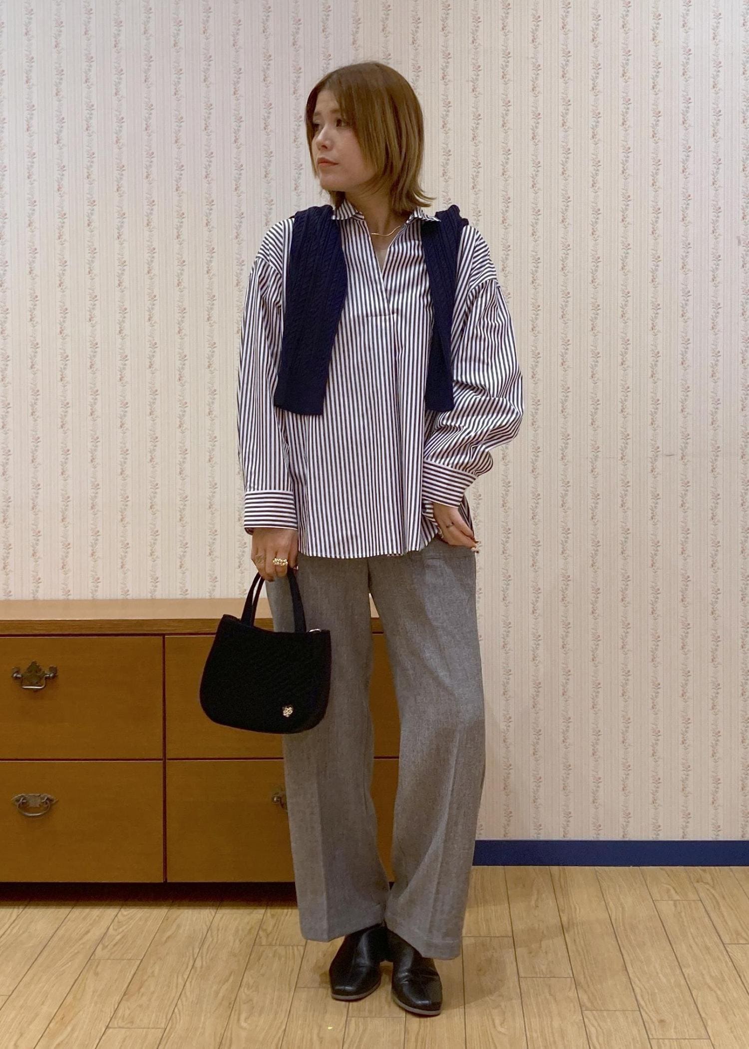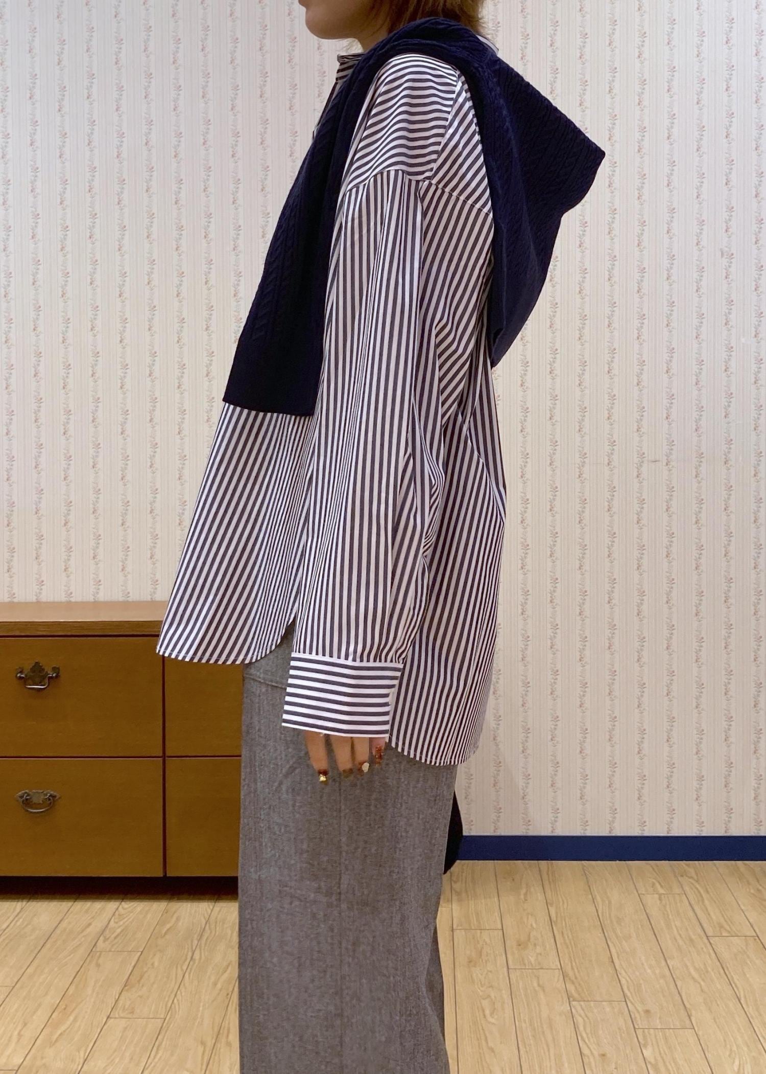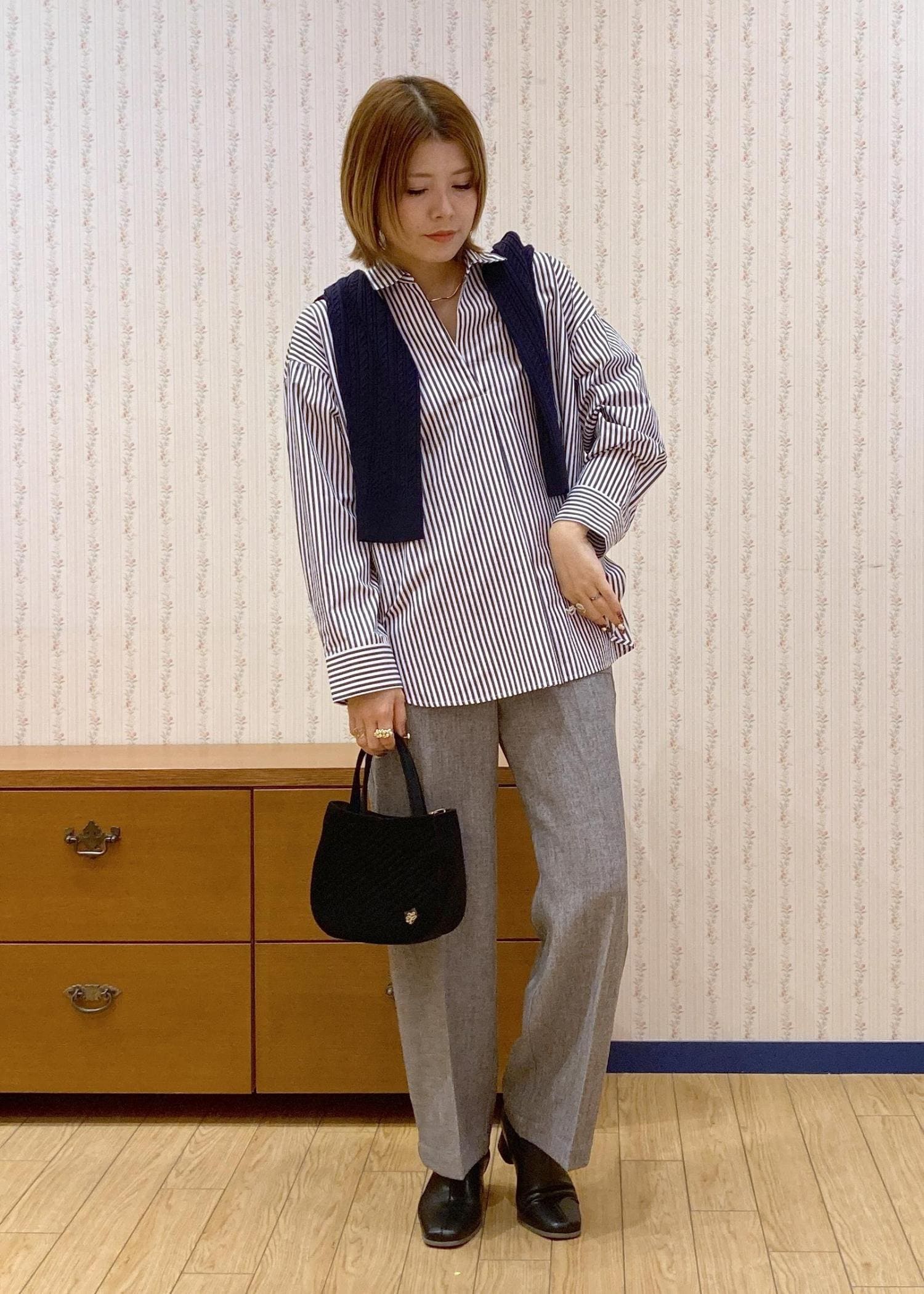 スキッパーシャツで首元をスッキリ見せて、肩がけカーディガンで目線を高くしてスタイルアップを狙ってます!