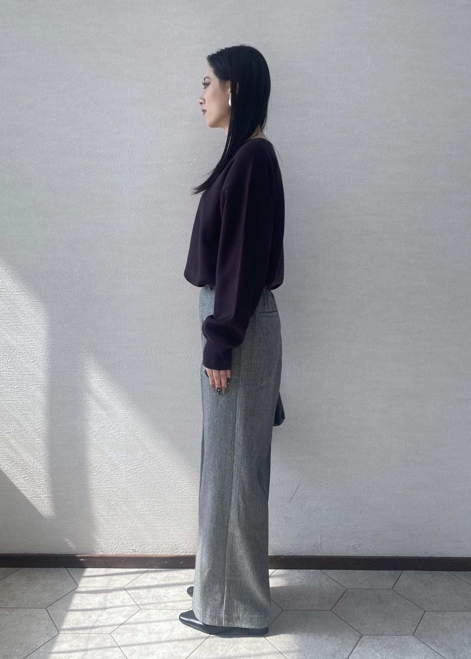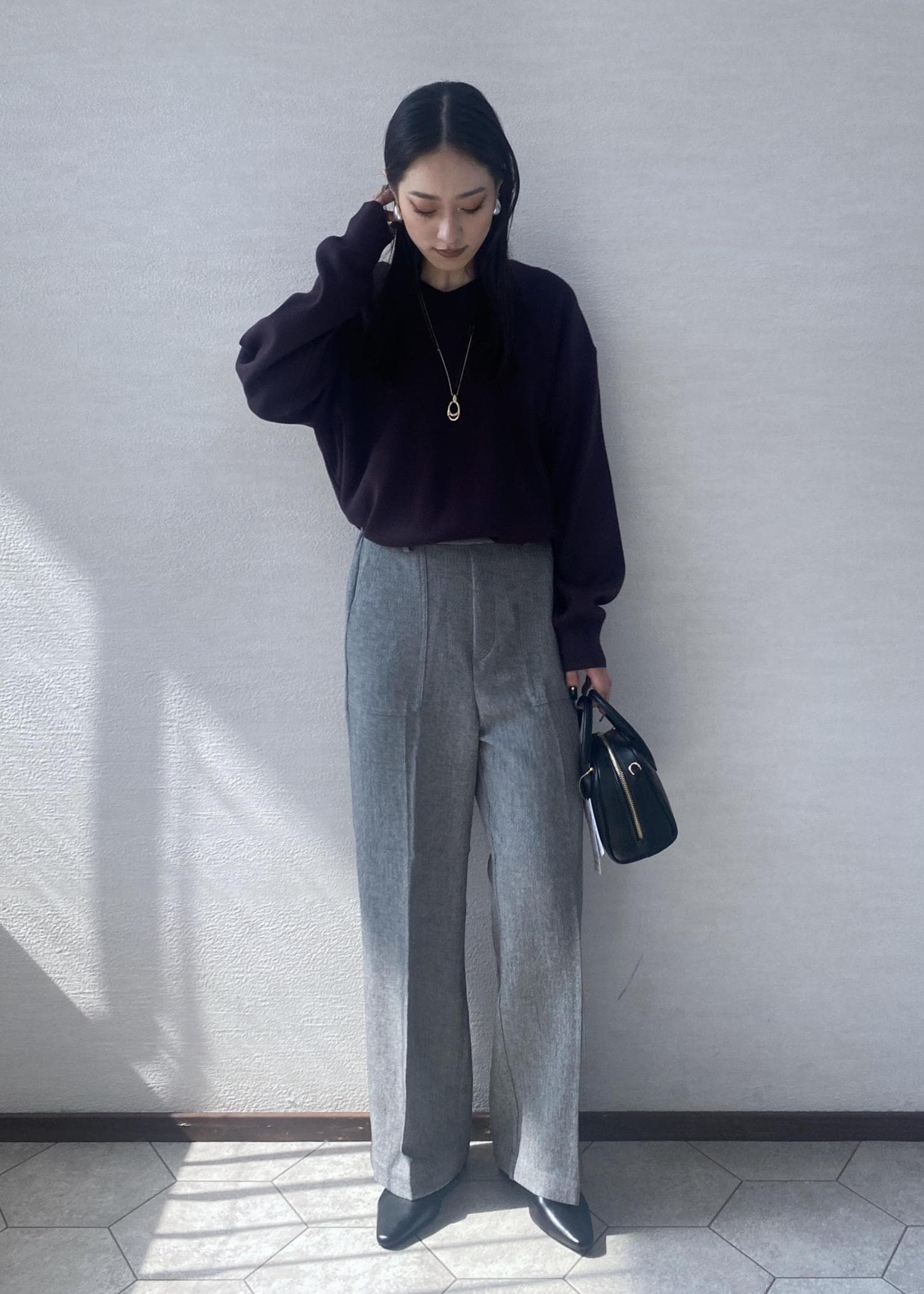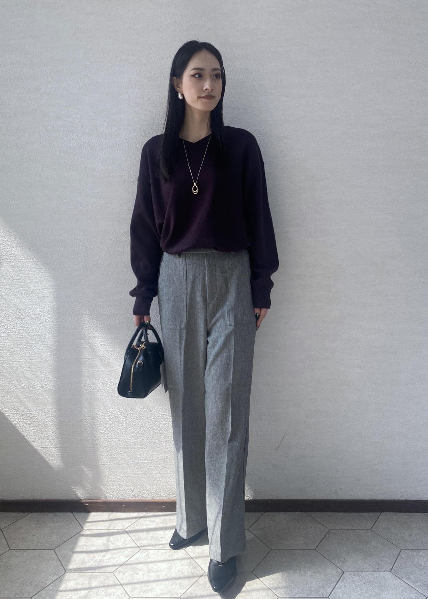柔らかい素材感のVネックニットにベイカーパンツを合わせたキレイめなコーディネートです。