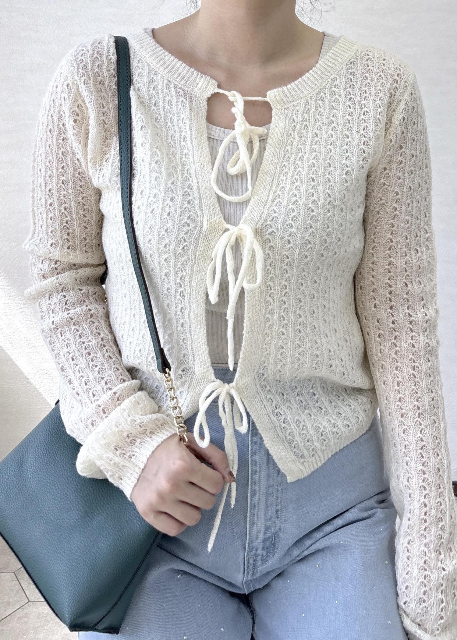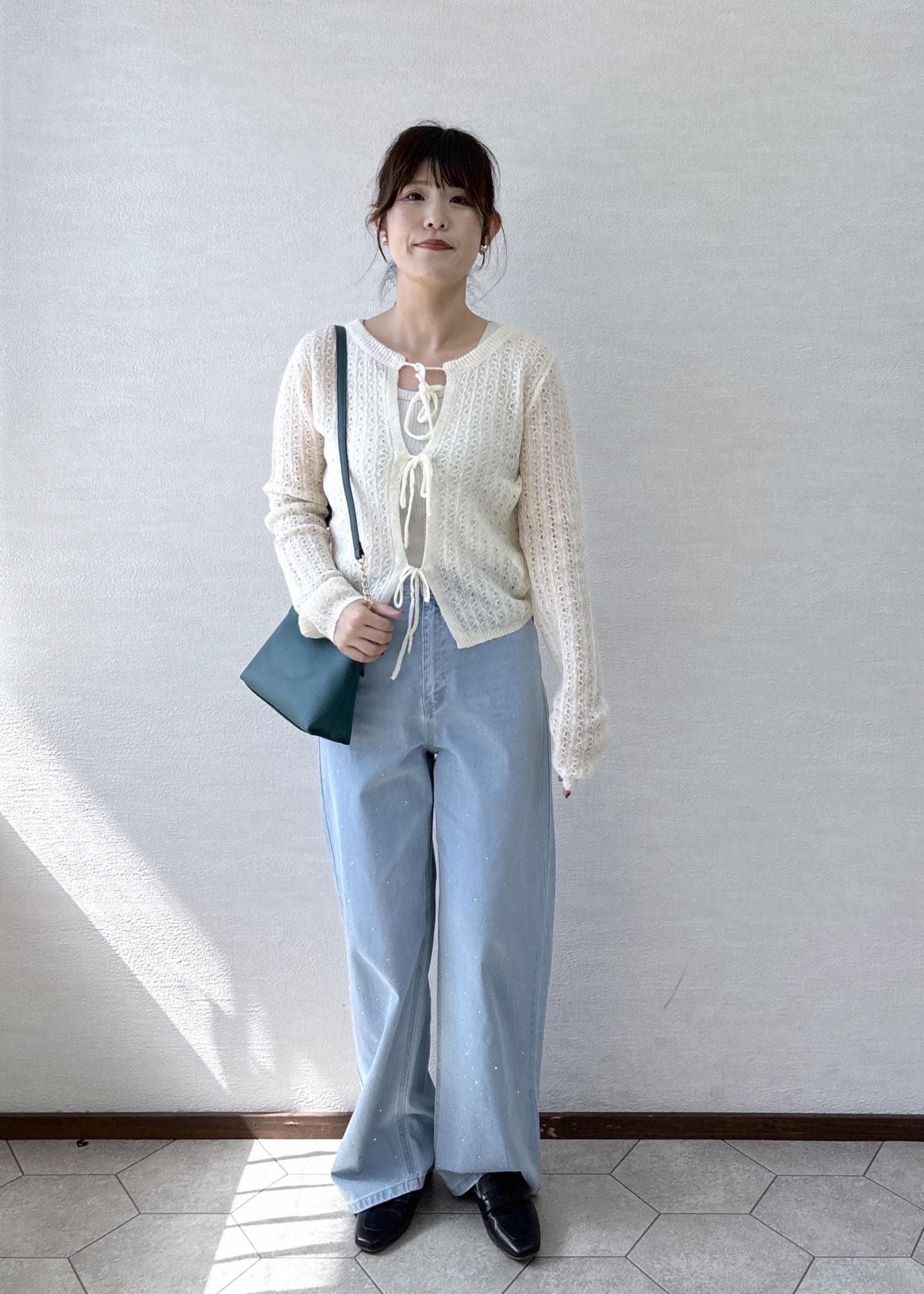 薄手のニットをデニムですっきりあわせた動きやすいカジュアルコーデです。