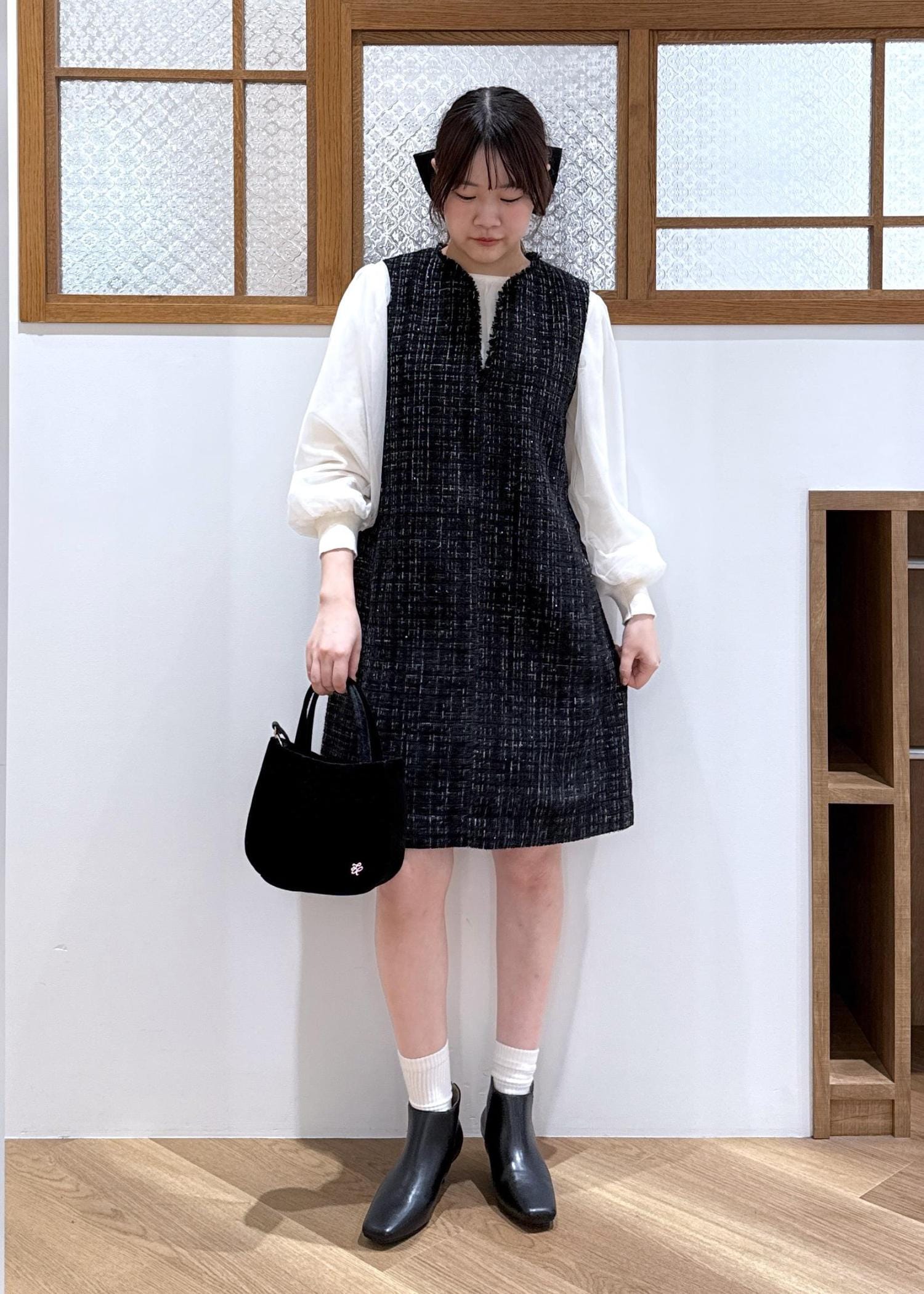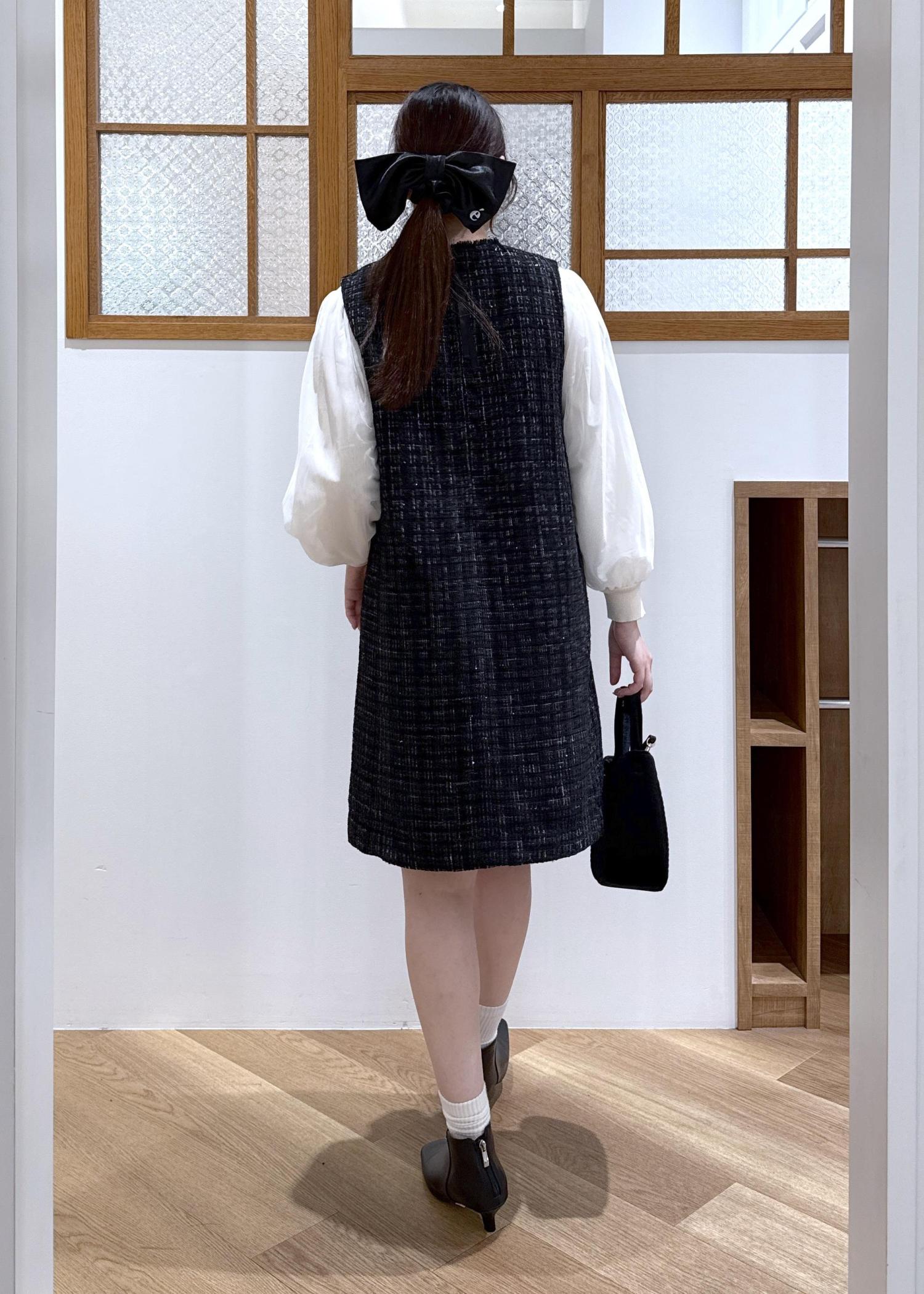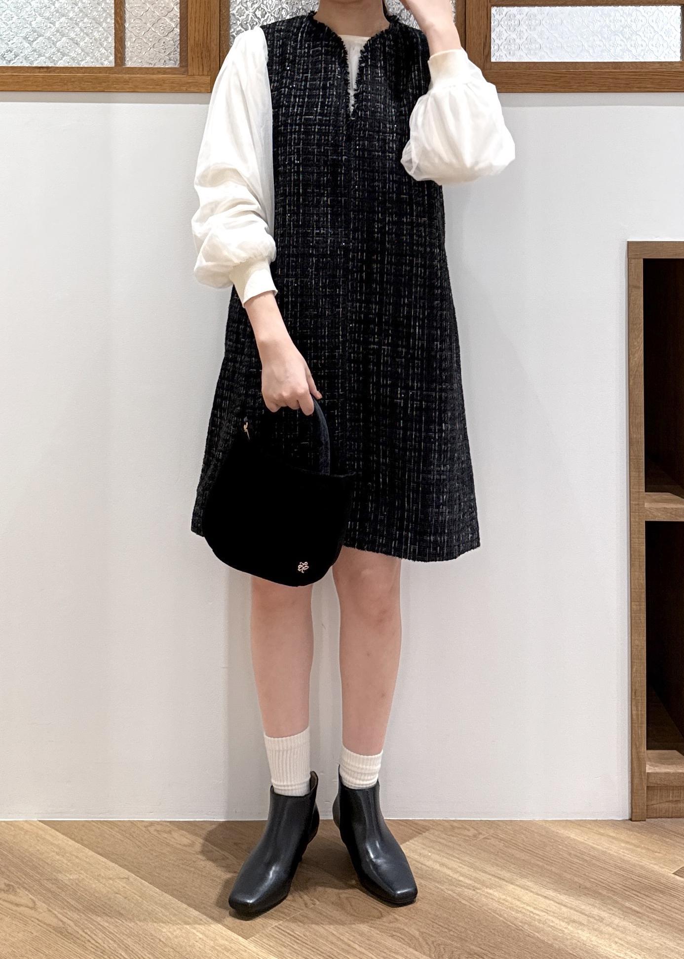 膝上丈のツイードのワンピースにチュールのインナーを合わせたガーリーコーデです。