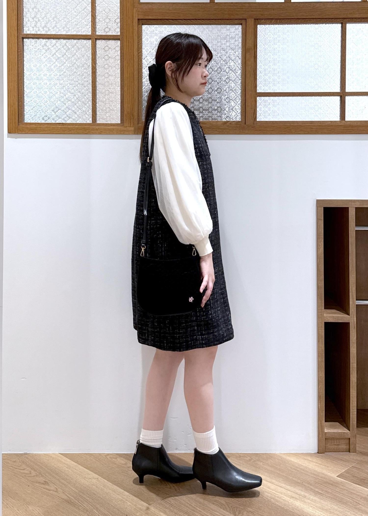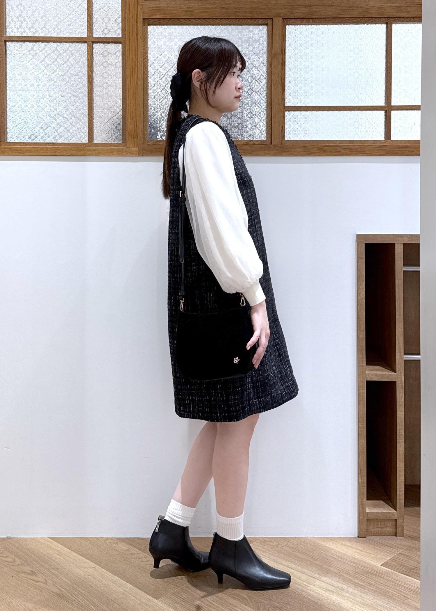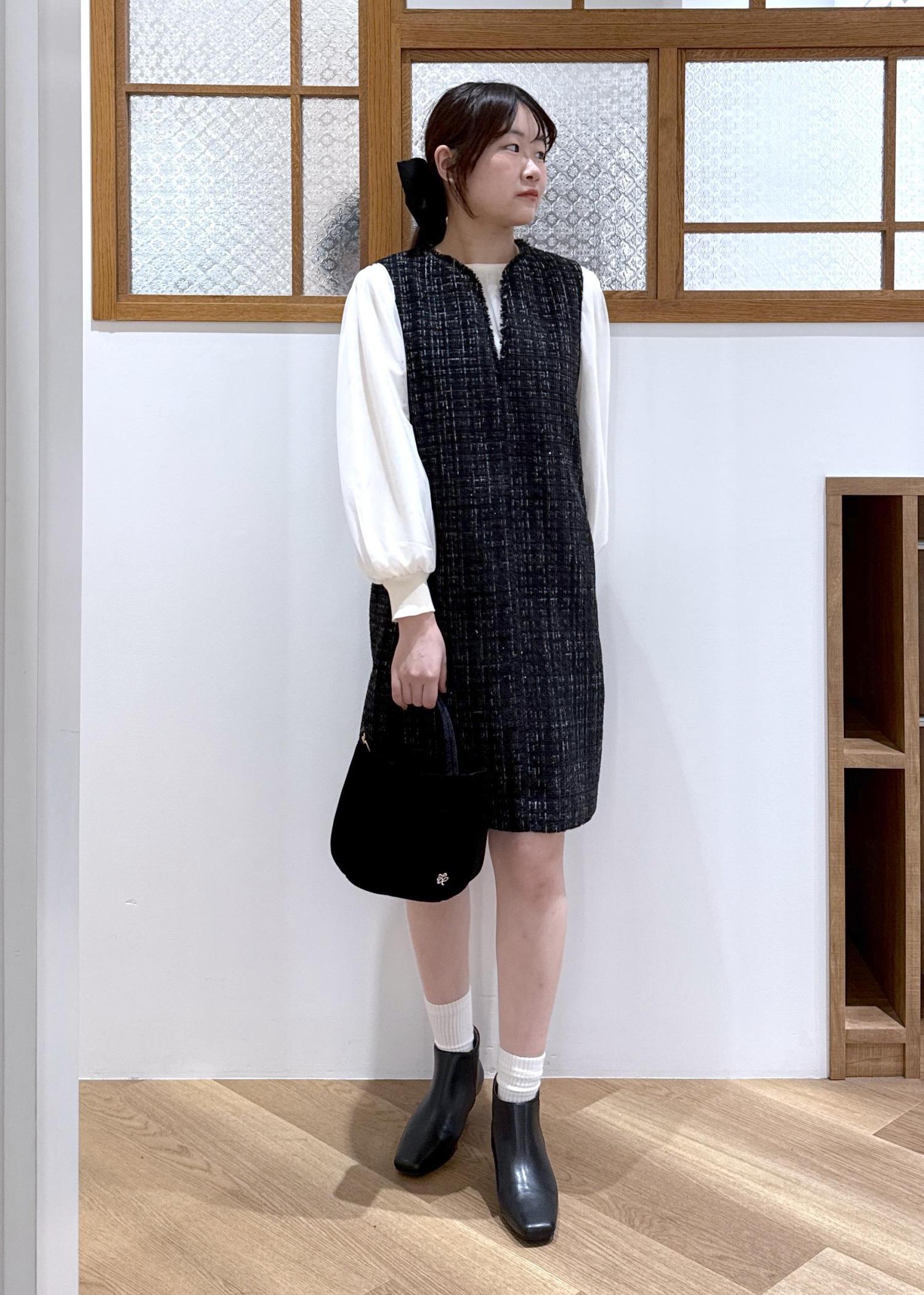 膝上丈のツイードのワンピースにチュールのインナーを合わせたガーリーコーデです。