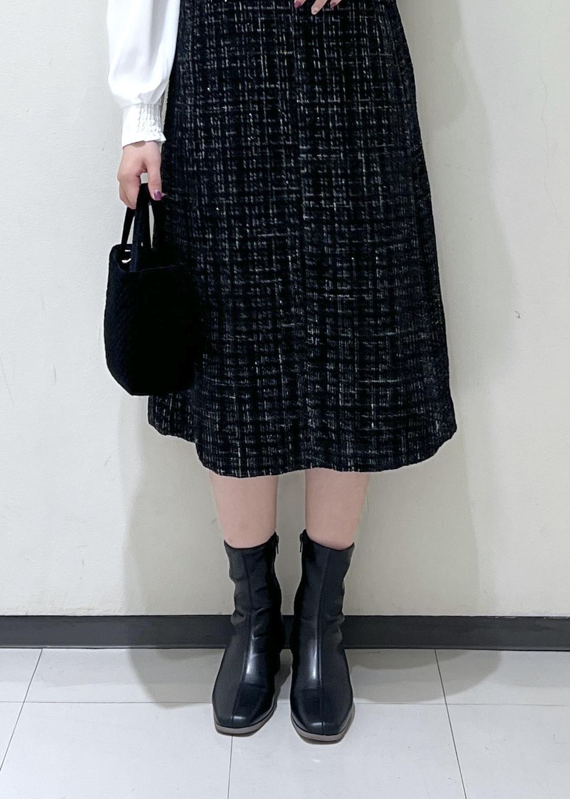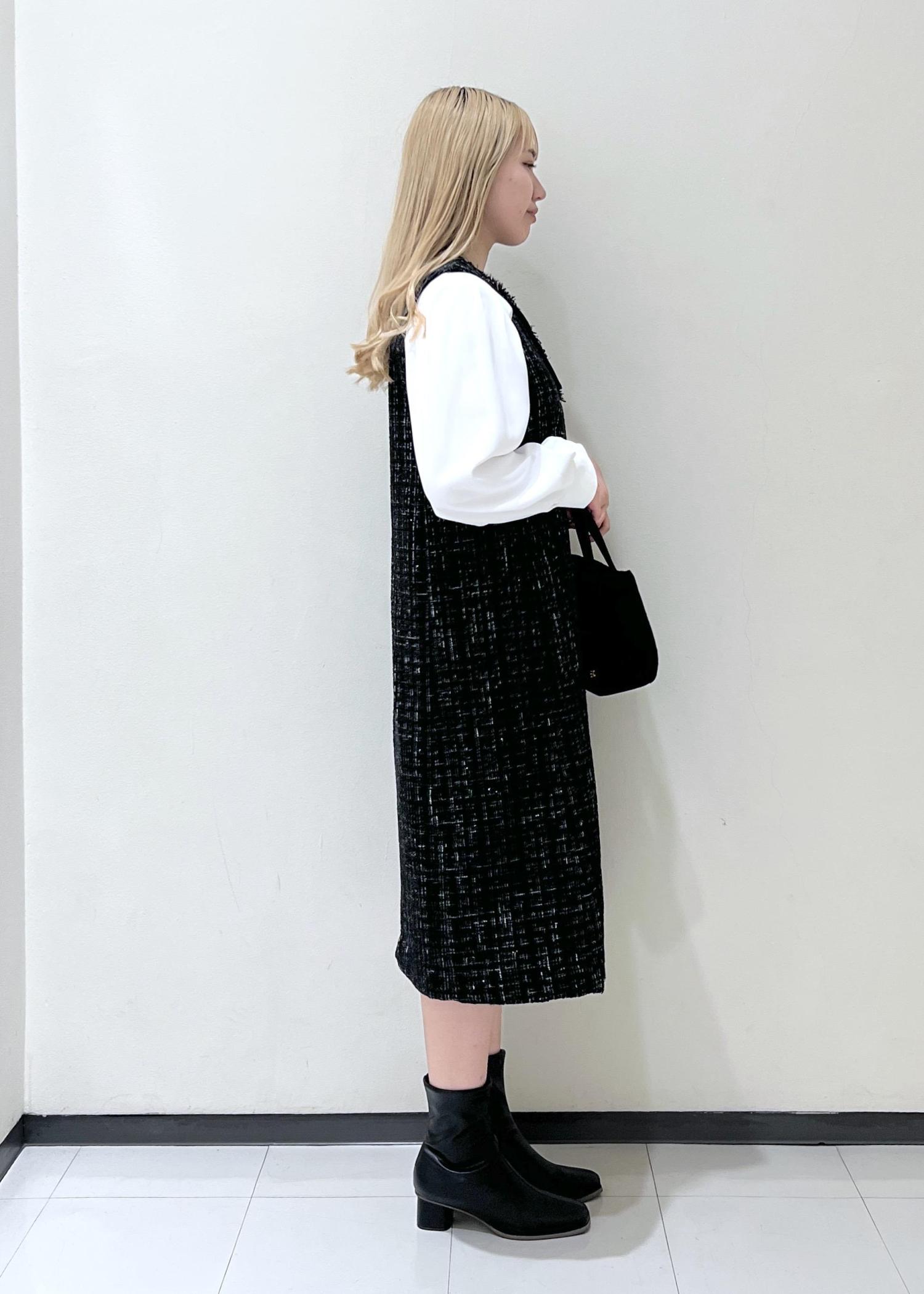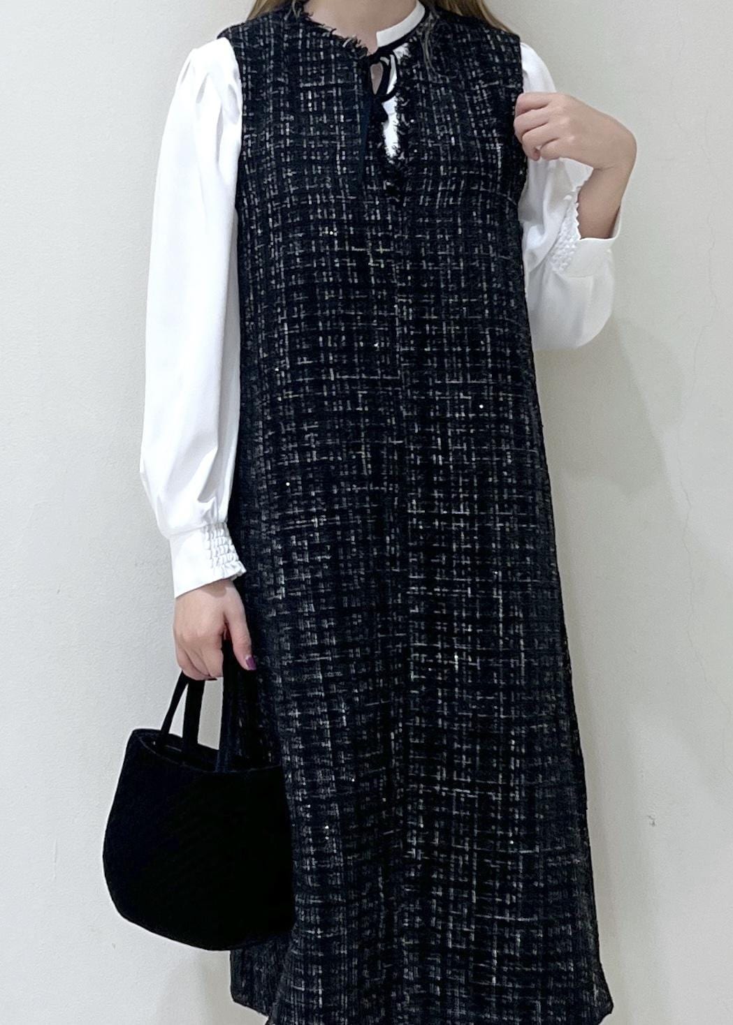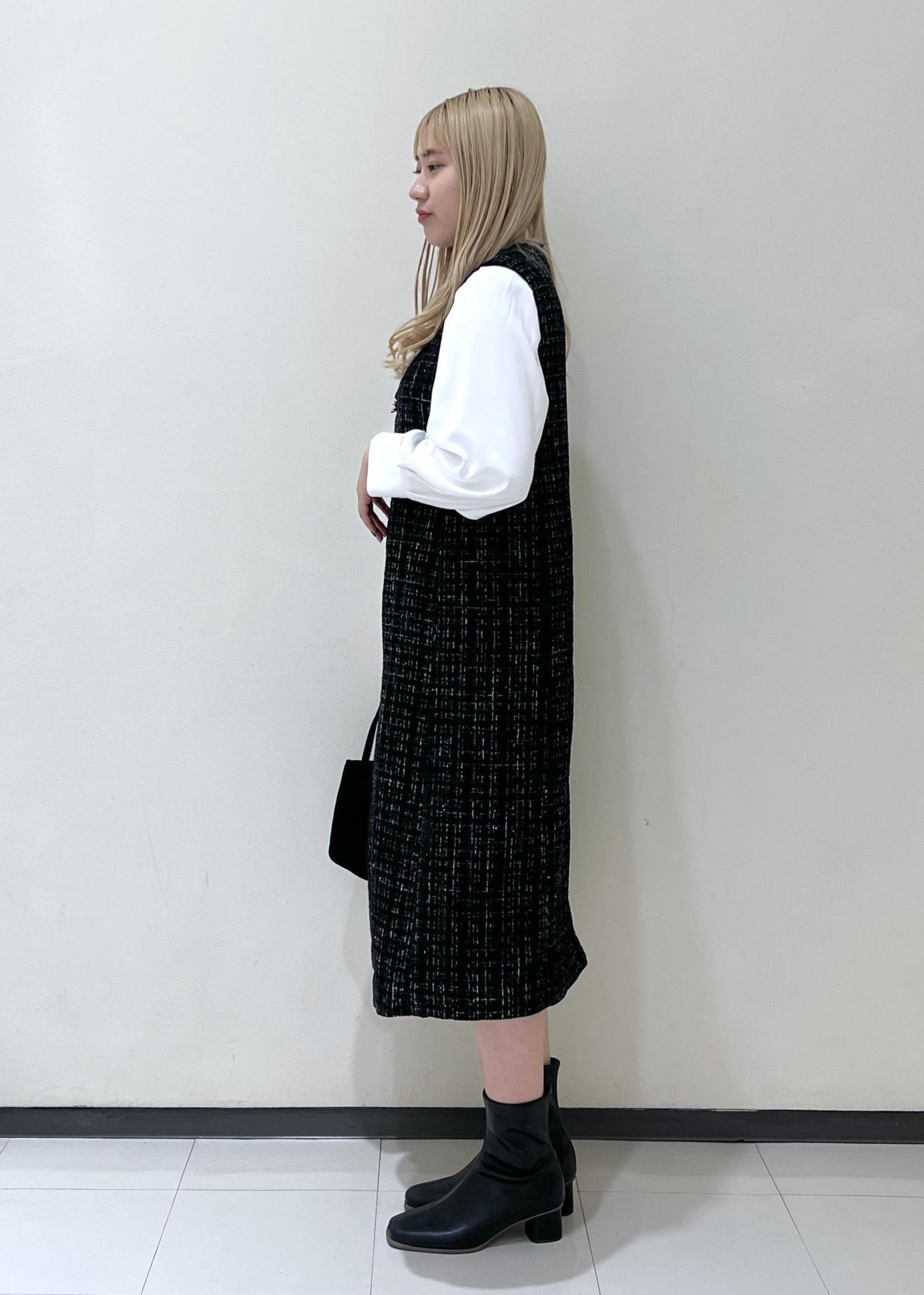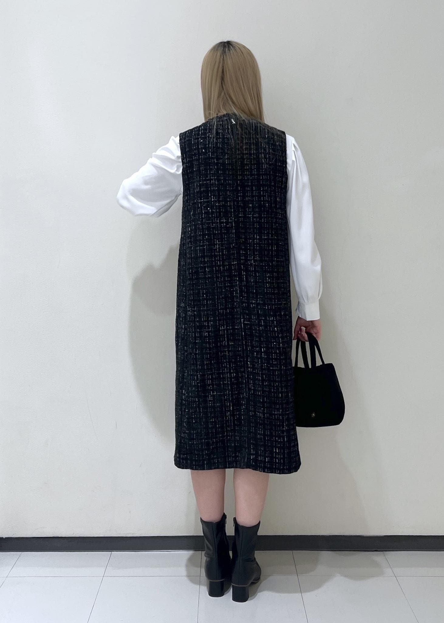 ツイード生地のワンピースは上品さもありカジュアルさもあるのでオンオフ問わずお召いただけます!