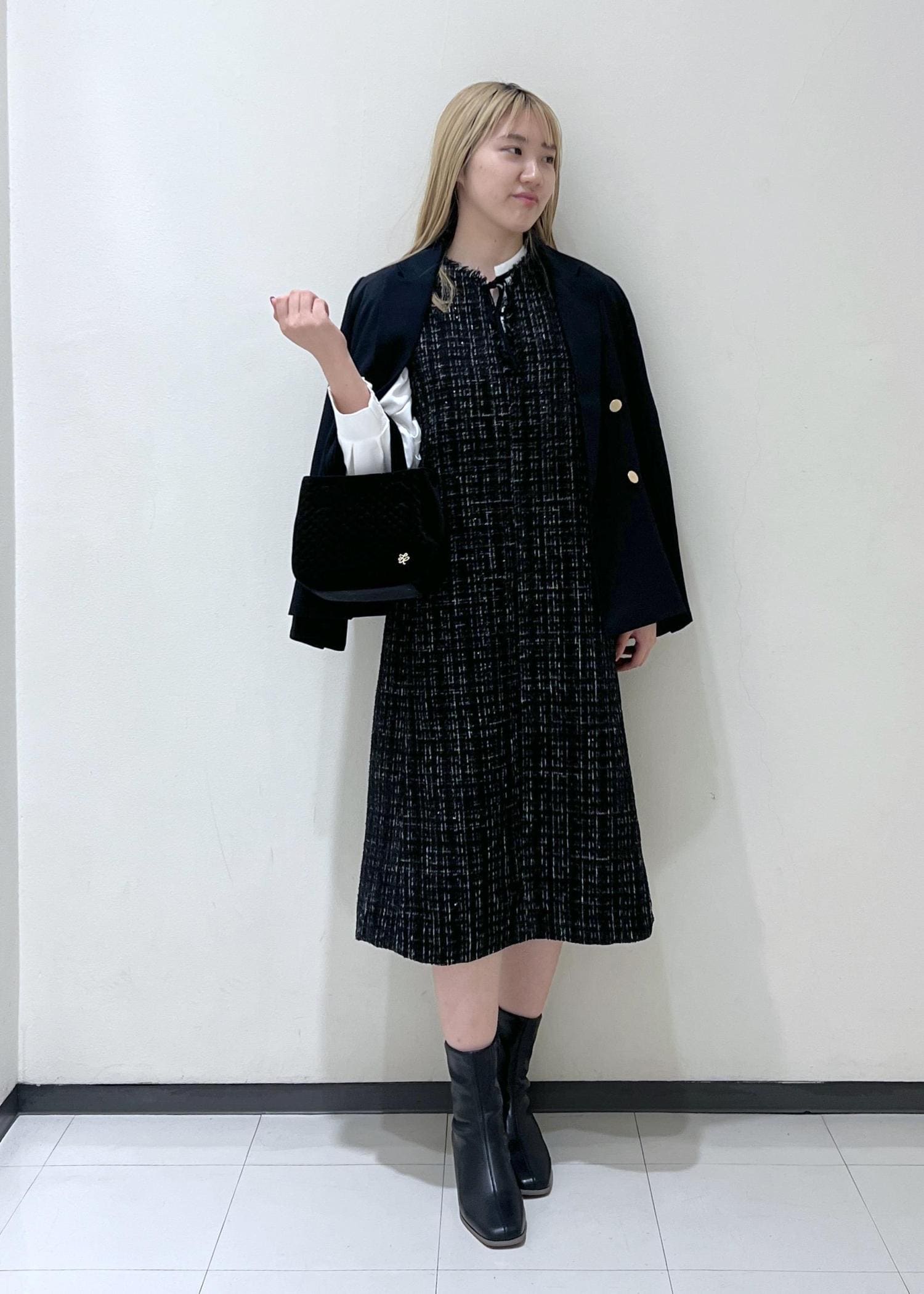 ツイードのワンピースにリボンのブラウスを合わせて女性らしい上品なコーディネートにしました。