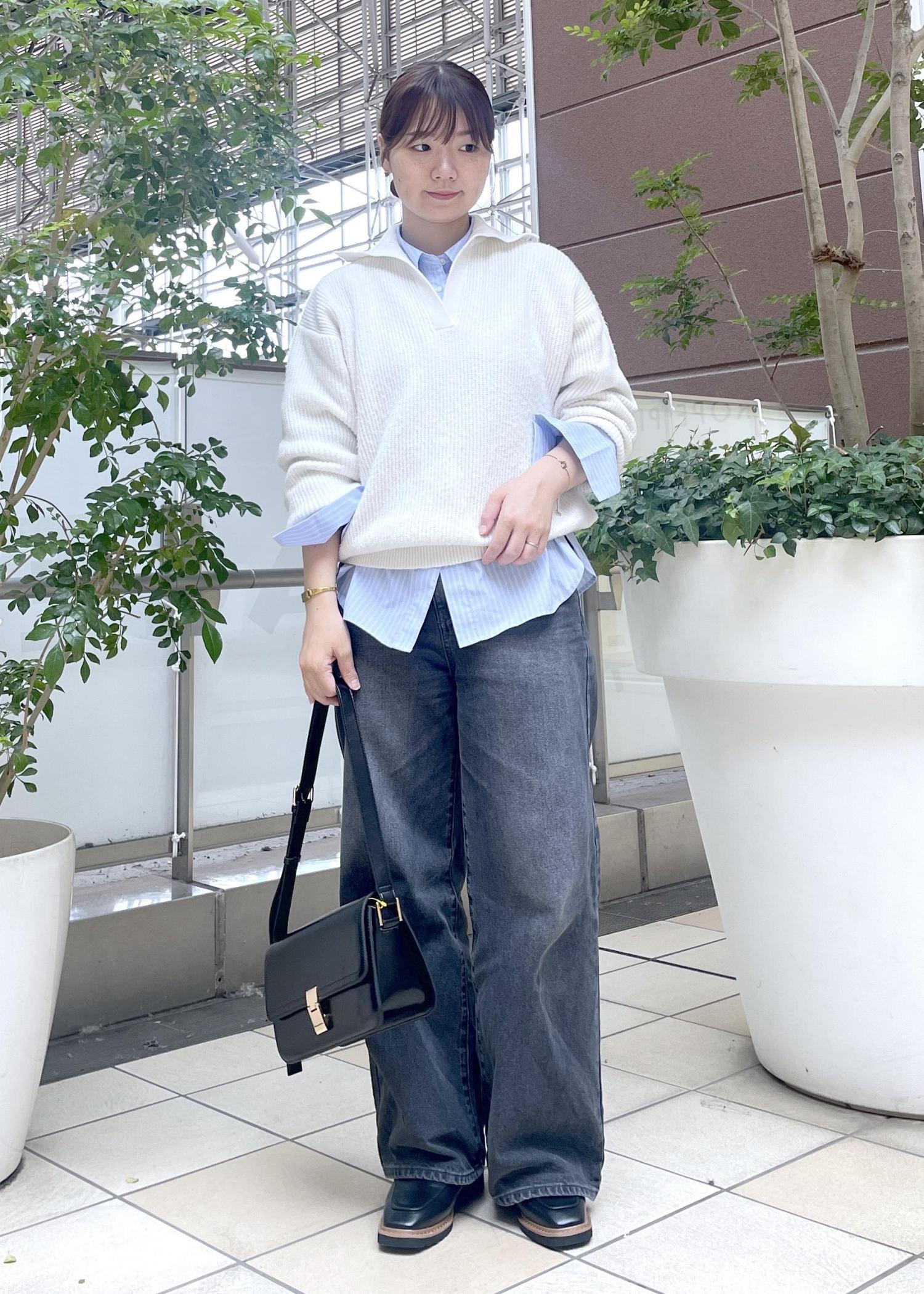 白のニットにブルーのストライプシャツとデニムを合わせた爽やかなコーデです。