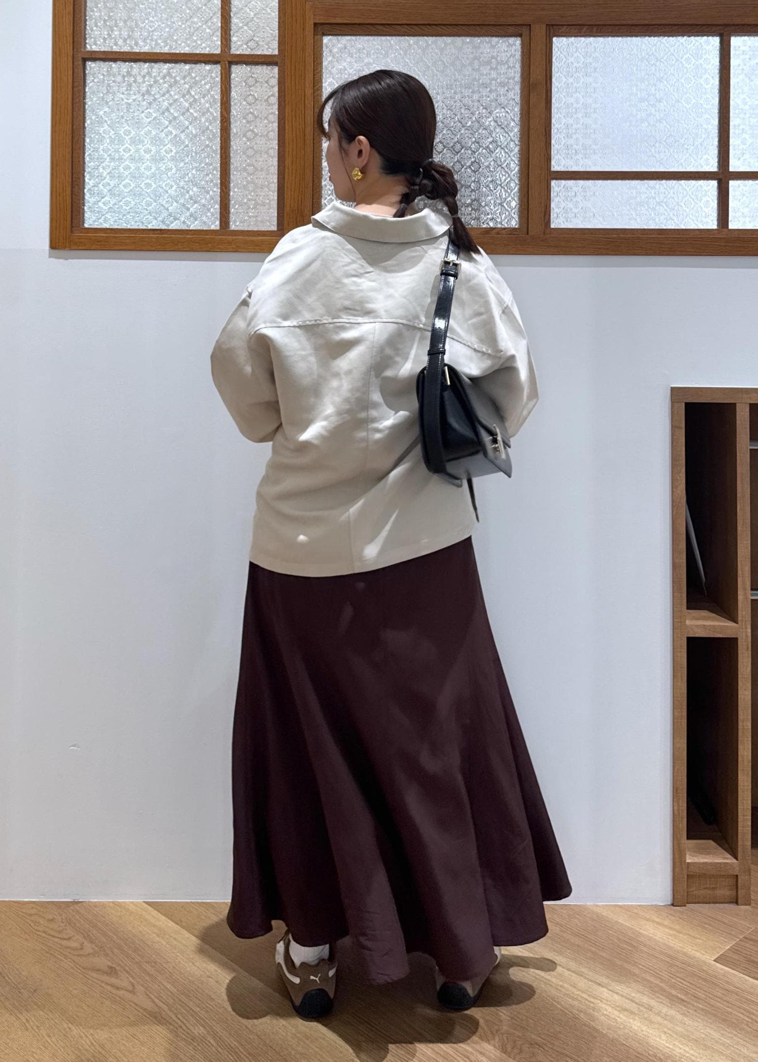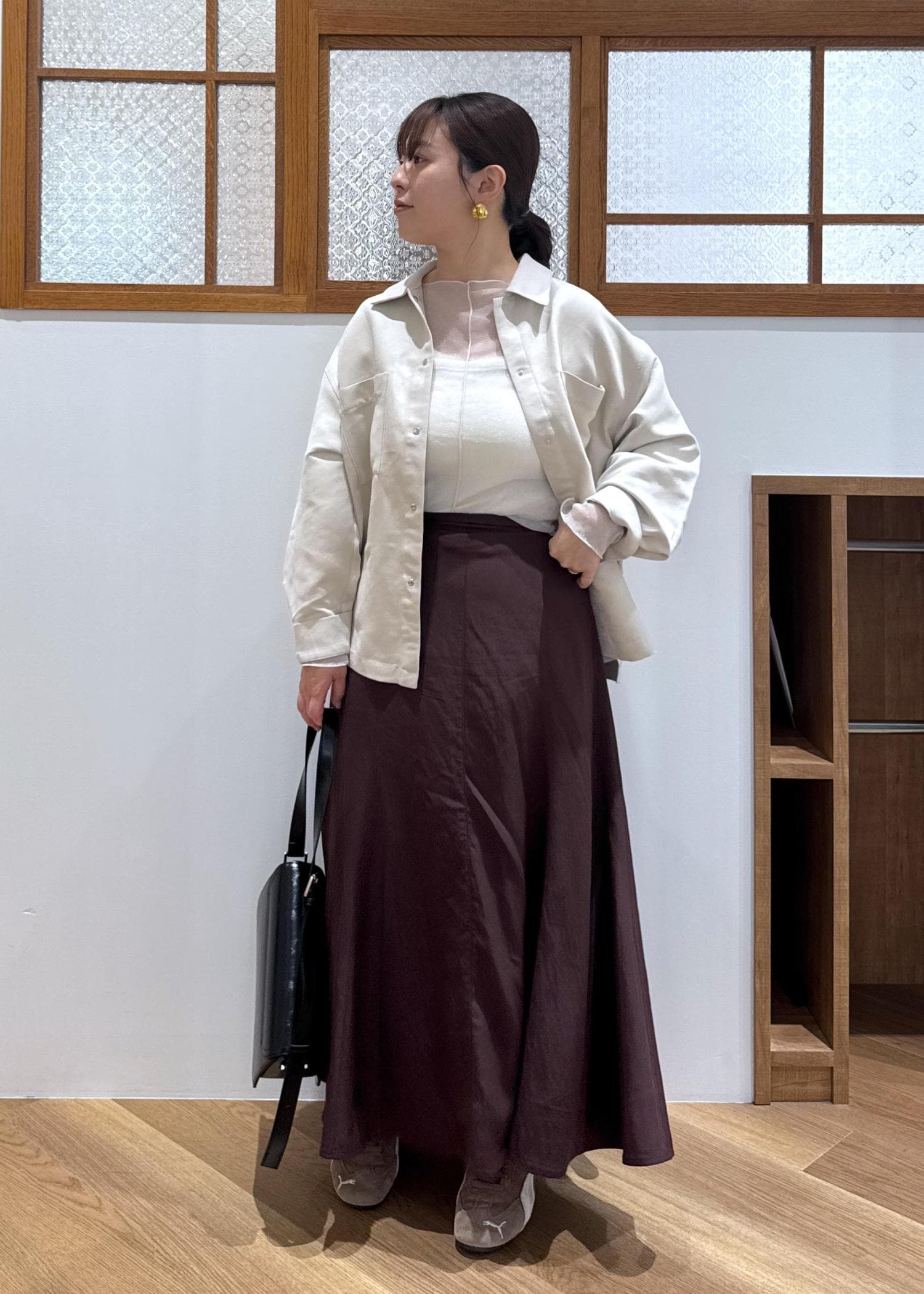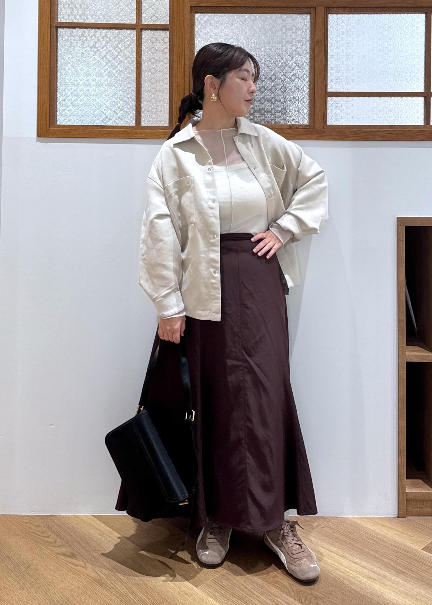 ROPÉ PICNICフィブリルマーメイドフレアスカートワイン / M¥6,490レビュー後ろゴムハイウエストのデザイン。長め、お尻周りカバー目的でMサイズ着用。フレアとマーメイドのmixシルエットなので、154cmでもバランスがとりやすく、それでいてドレッサーすぎないおしゃれさが作れます。