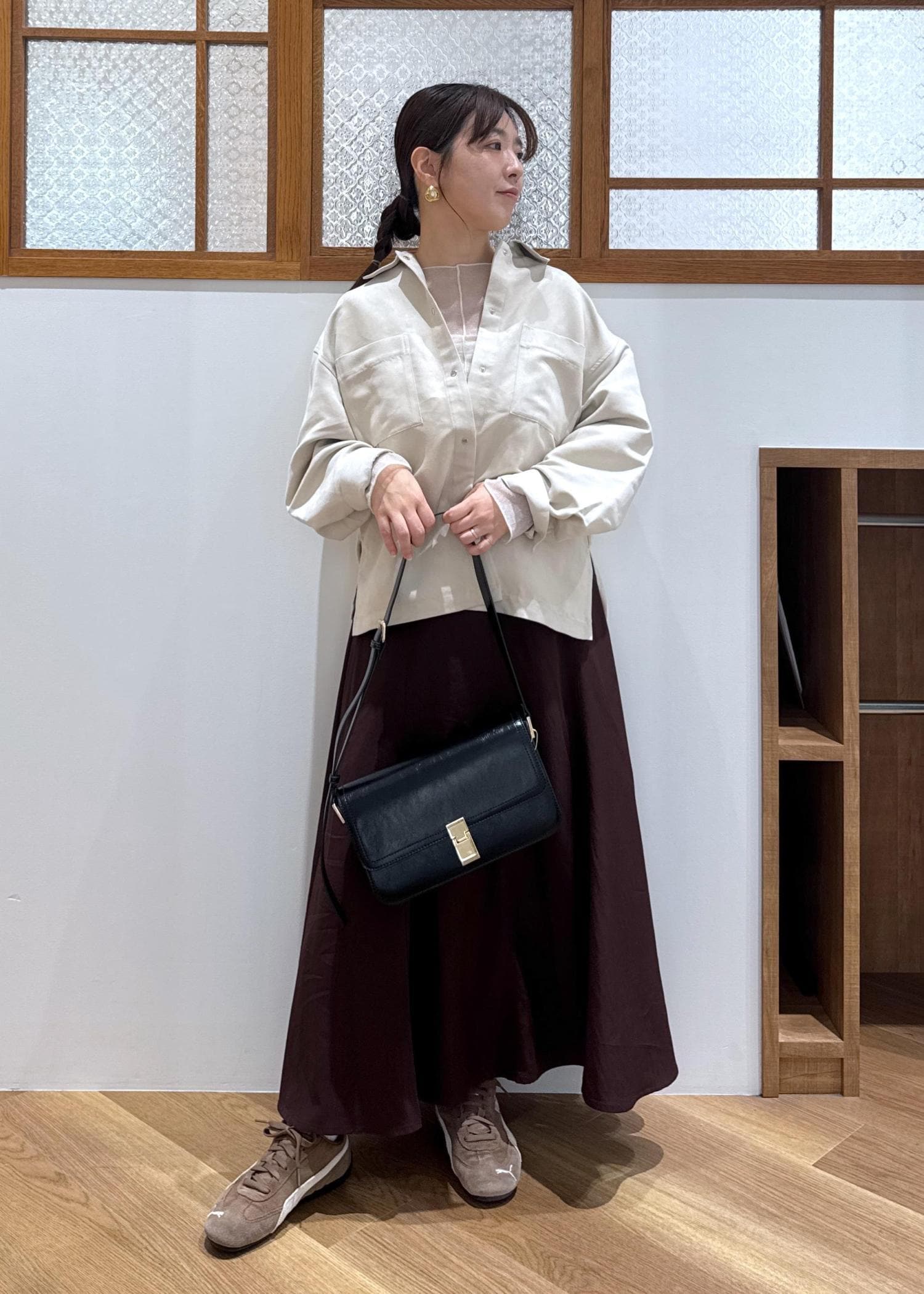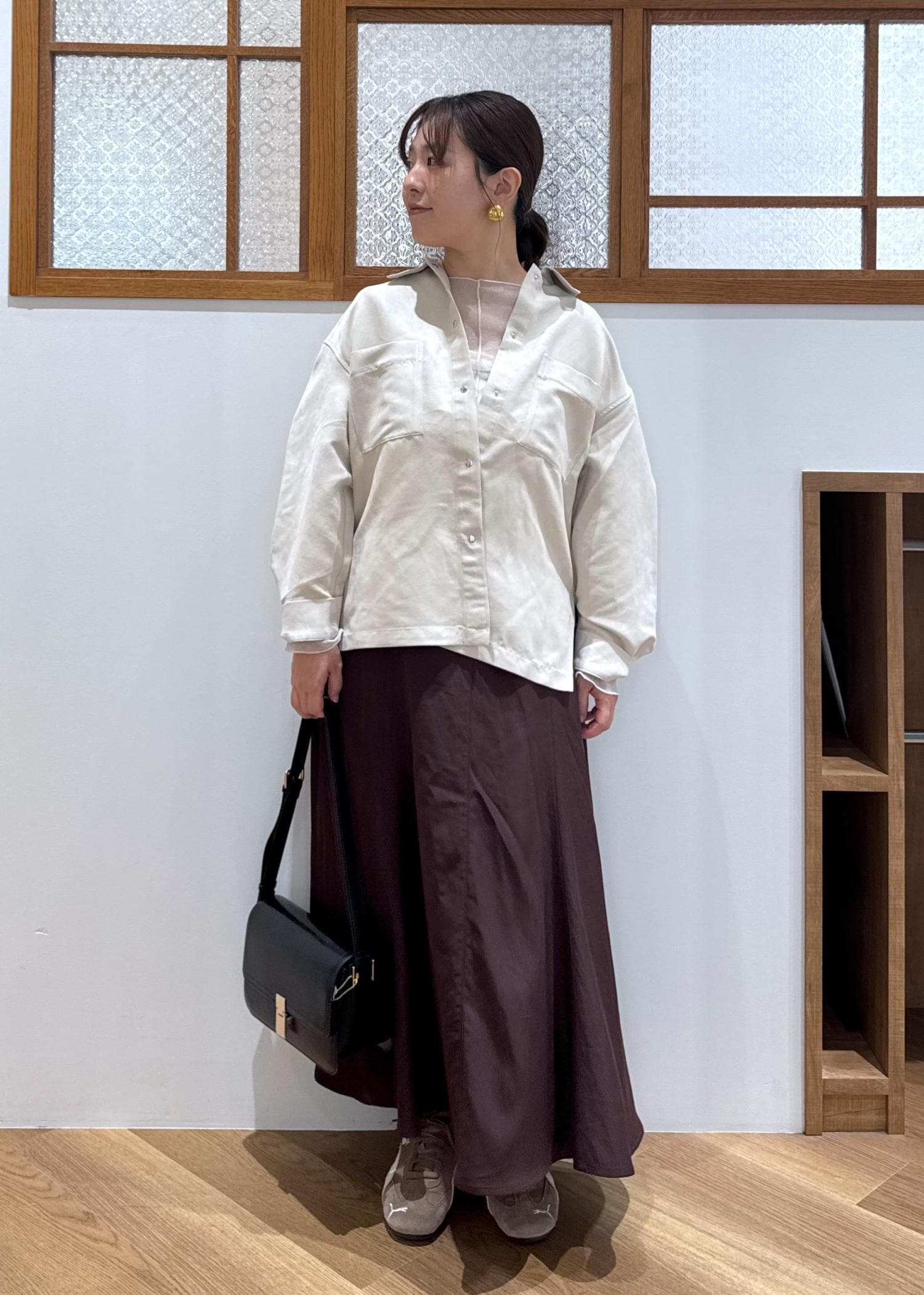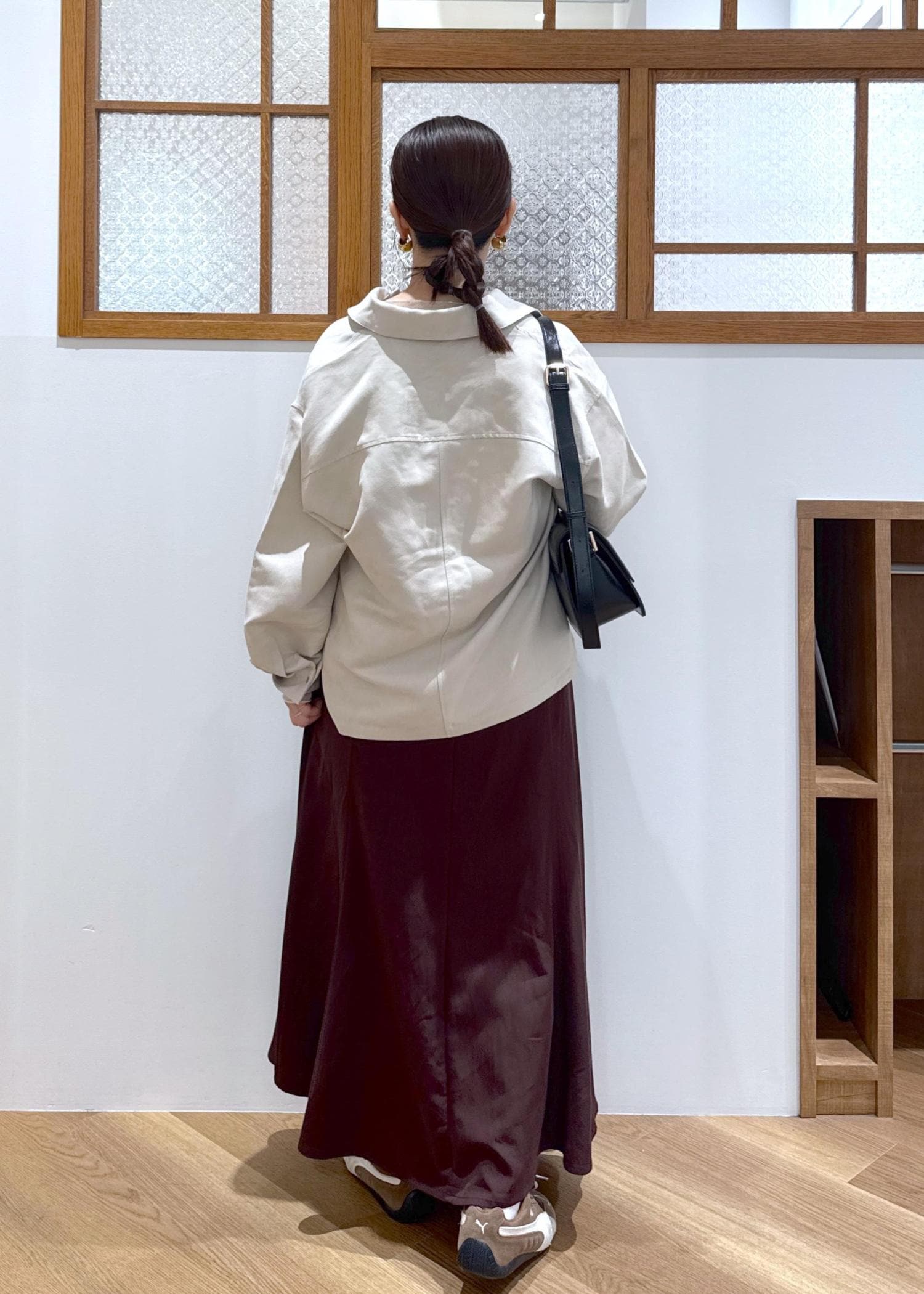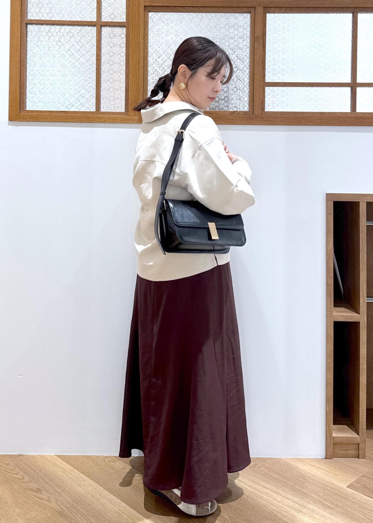 ROPÉ PICNICフィブリルマーメイドフレアスカートワイン / M¥6,490レビュー後ろゴムハイウエストのデザイン。長め、お尻周りカバー目的でMサイズ着用。フレアとマーメイドのmixシルエットなので、154cmでもバランスがとりやすく、それでいてドレッサーすぎないおしゃれさが作れます。