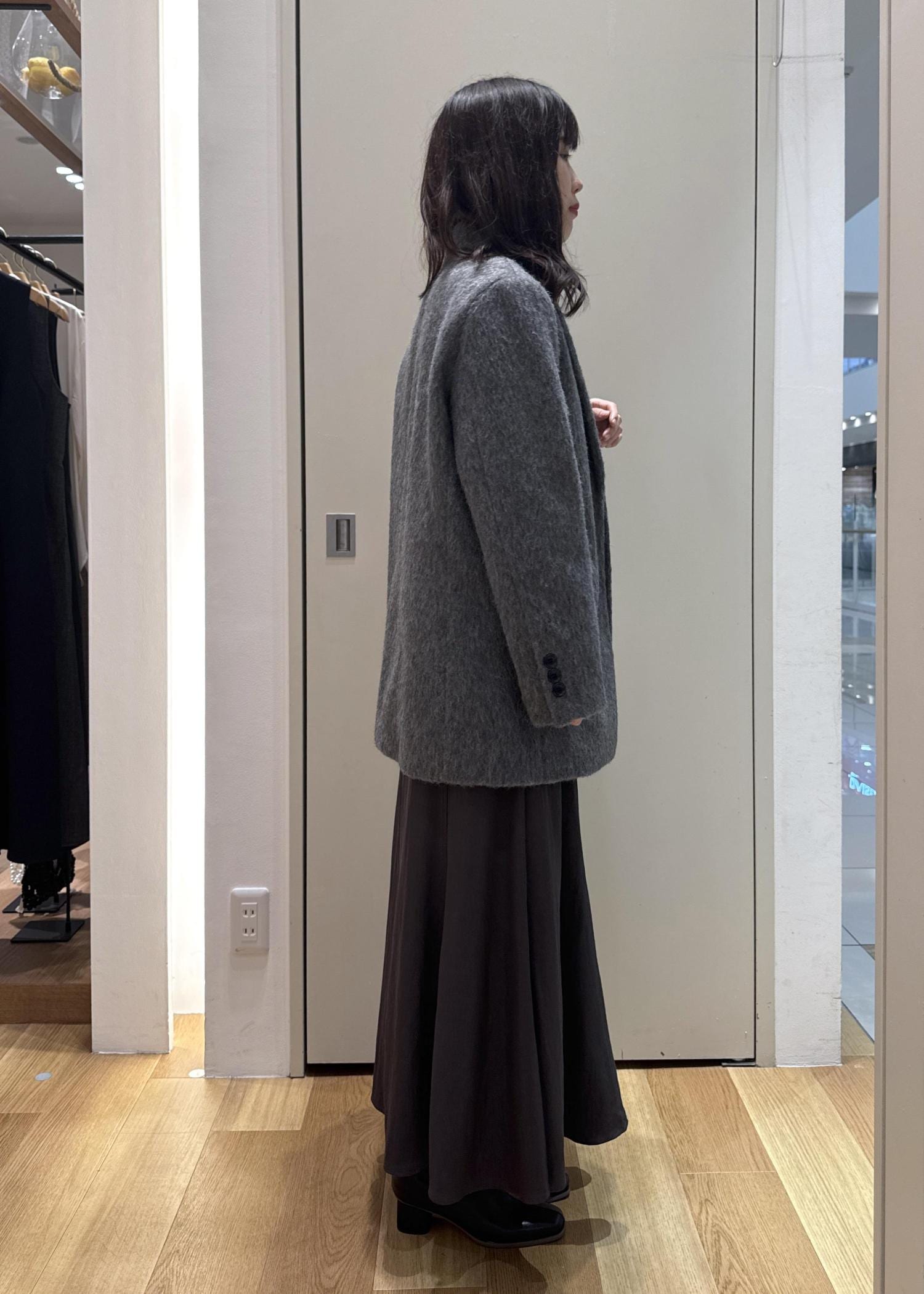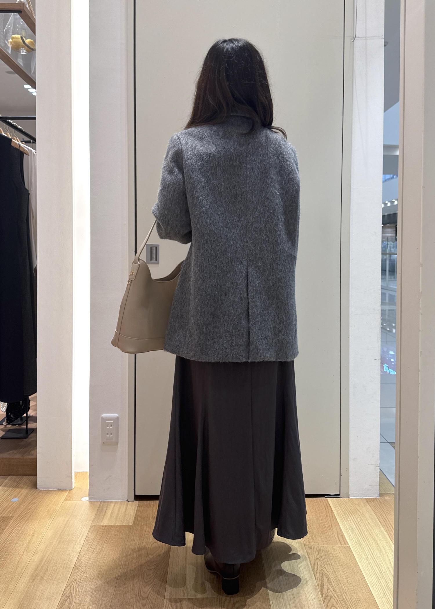 ジャケットのようなコート=ジャコットに、きれいめなマーメイドスカートを合わせたきれいめコーデです。