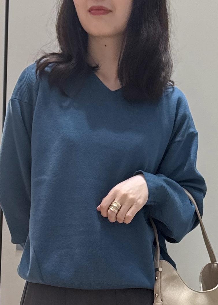 中のニットはロペピクニックでも人気のVネックニットを選び、ジャコットを脱ぐとすっきりとしたスタイリングに仕上げました。