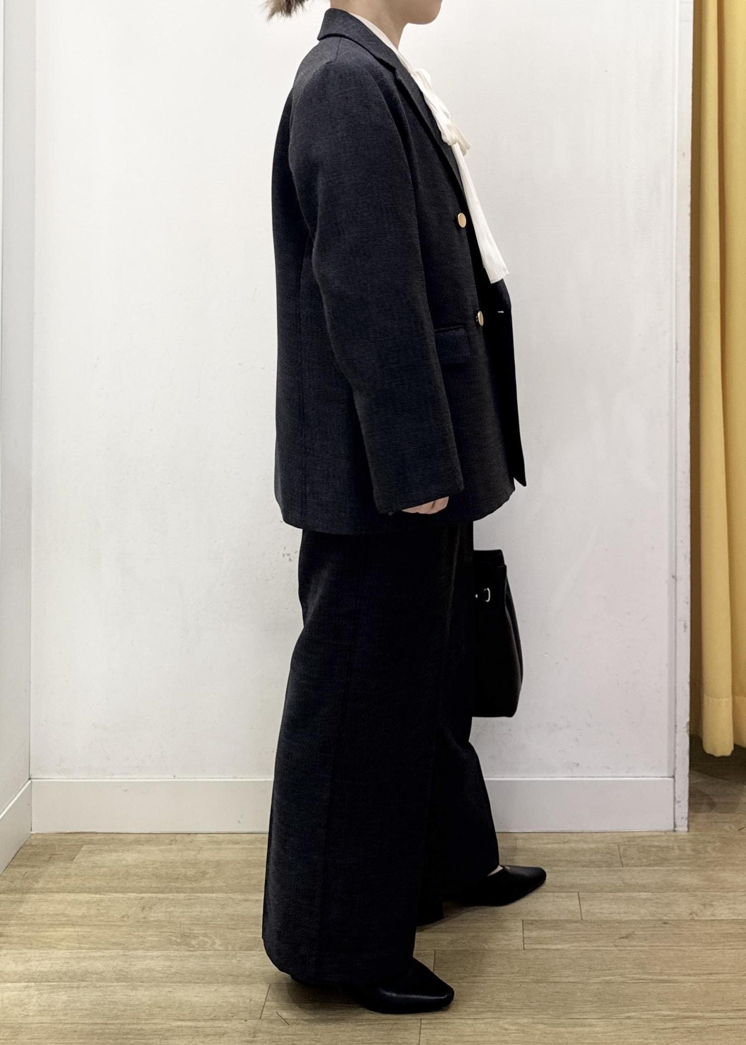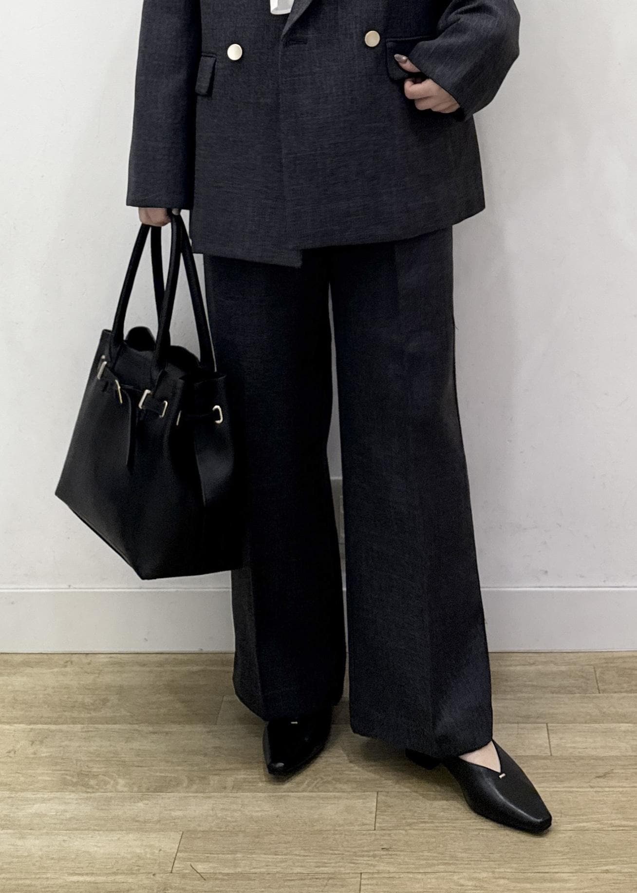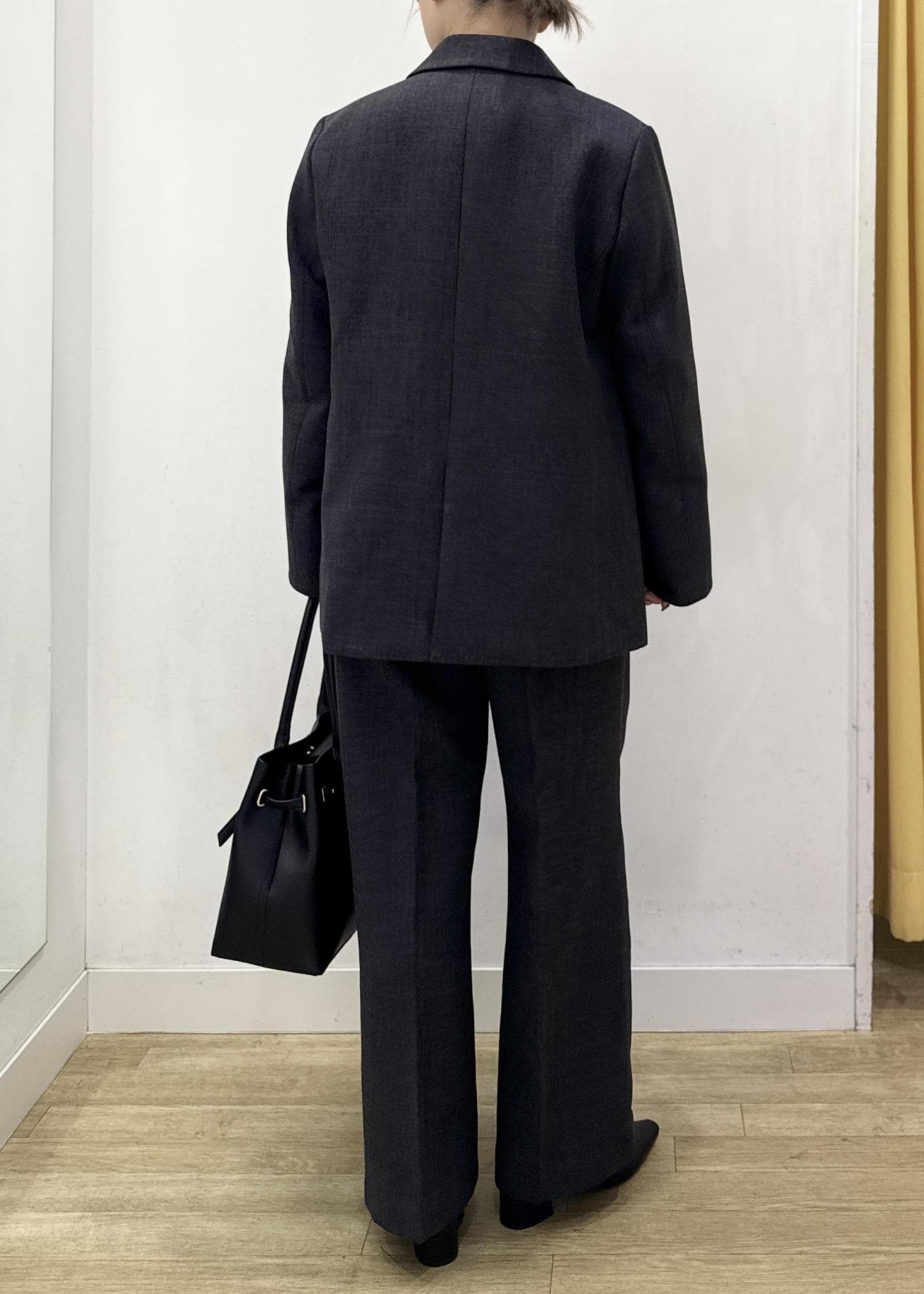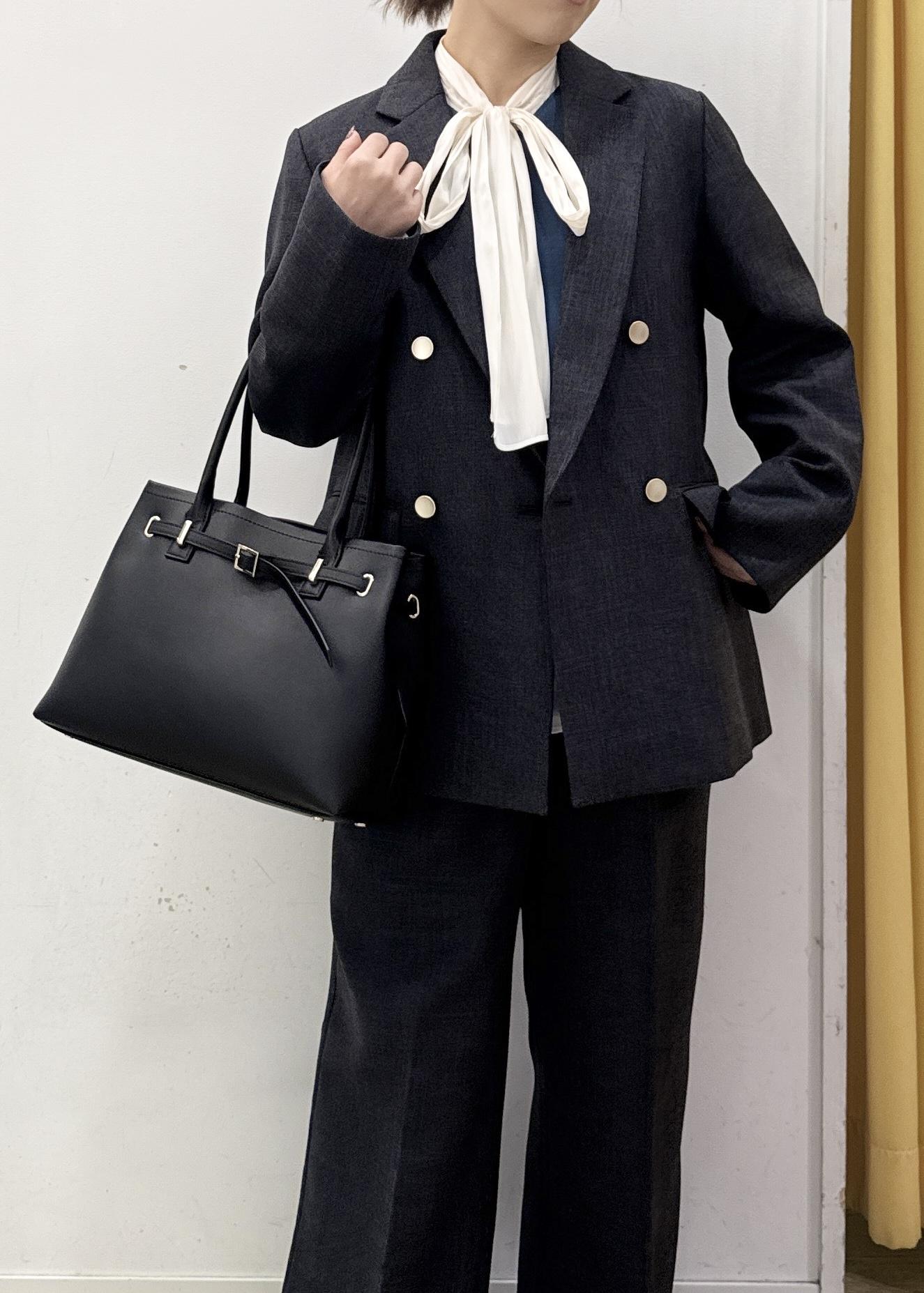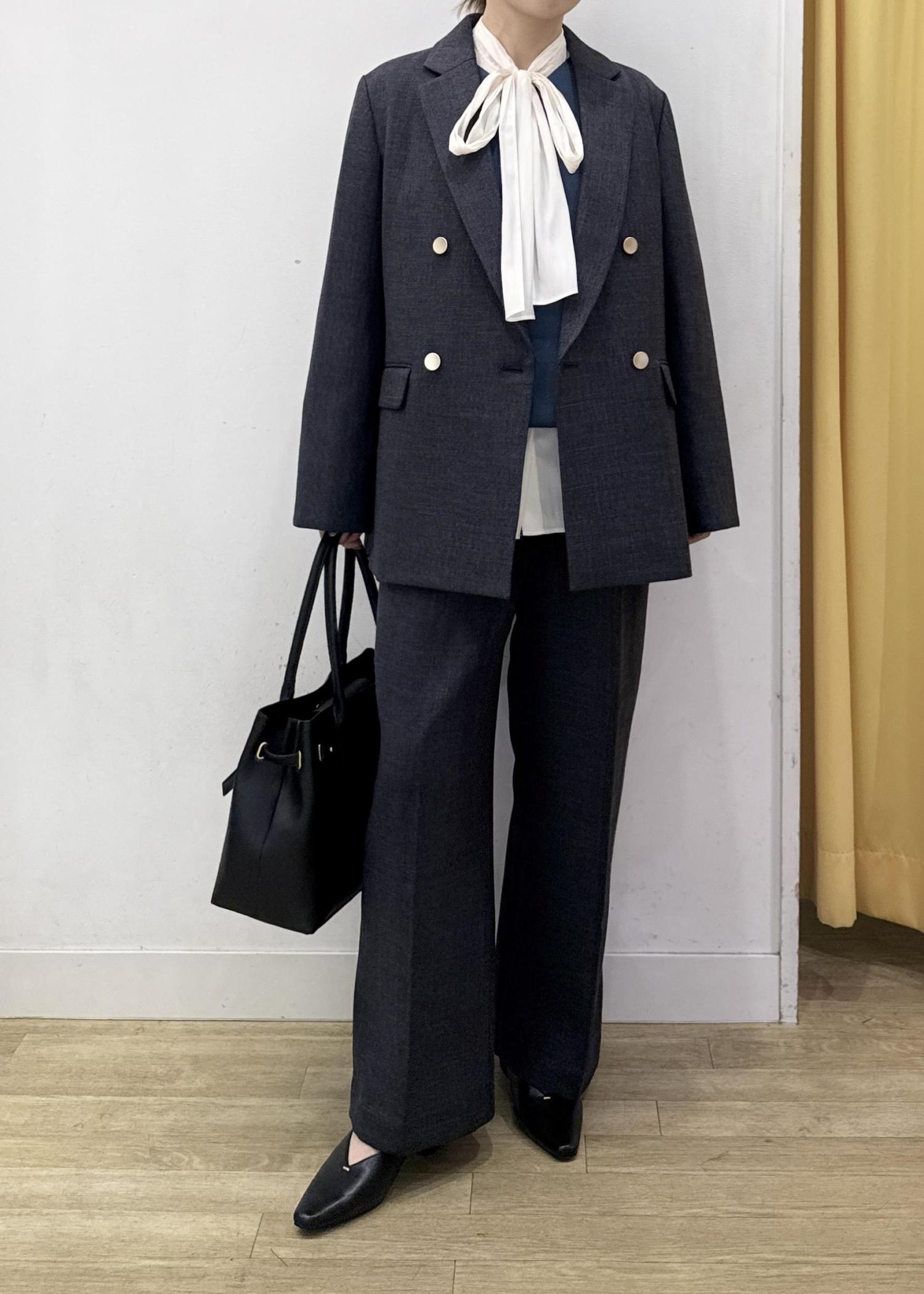 シックなチャコールカラーのジャケットとパンツのセットアップコーディネート!
