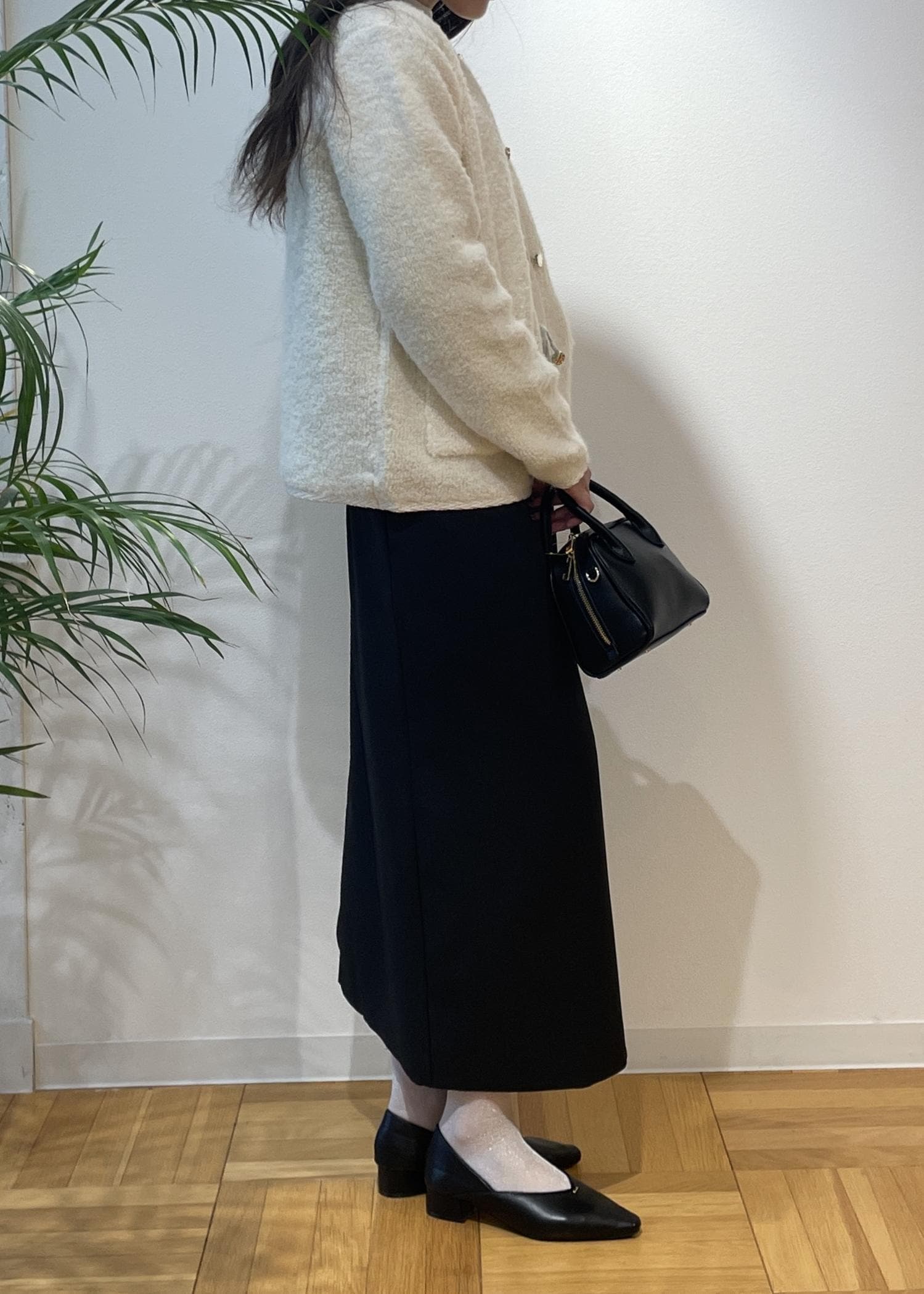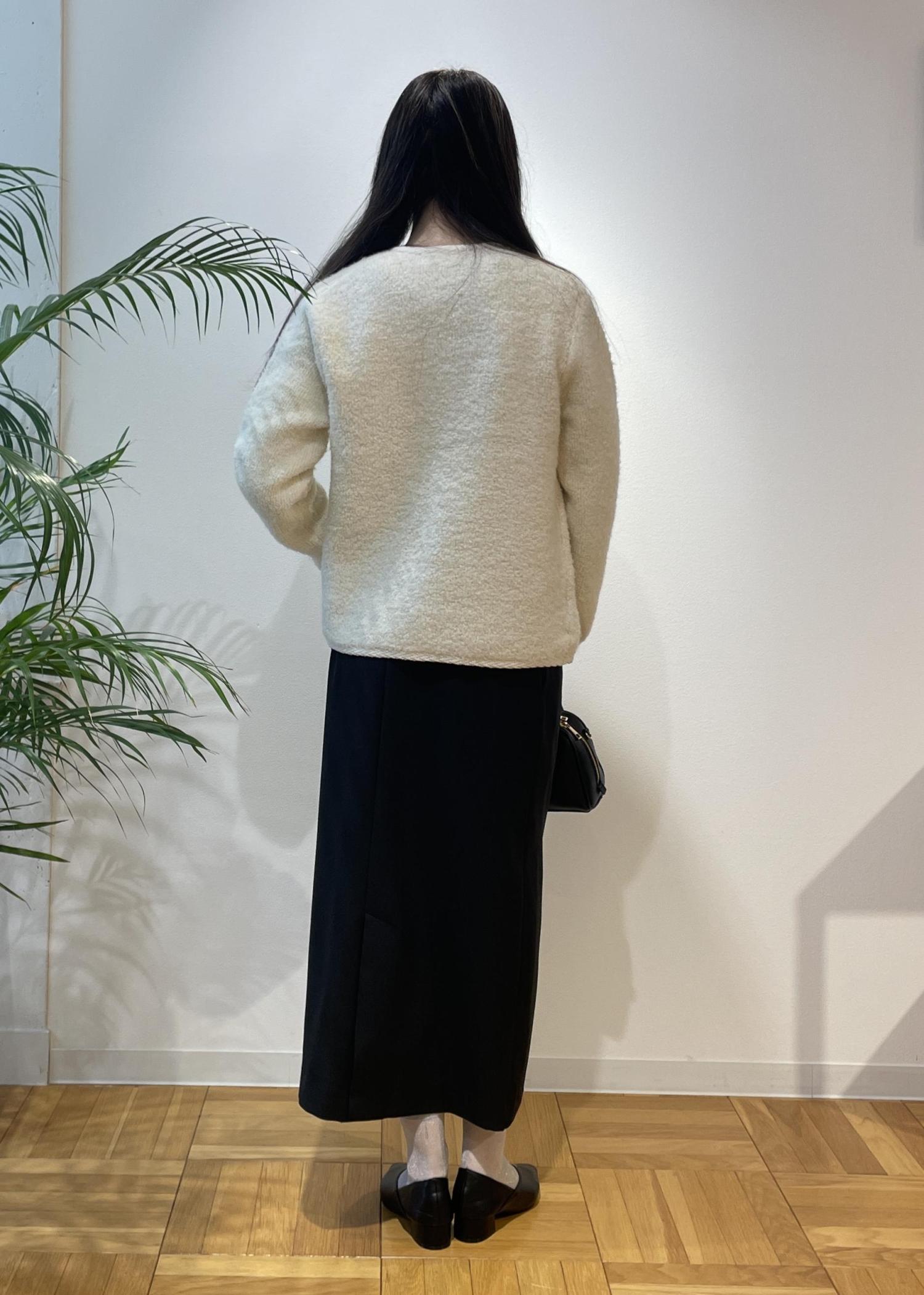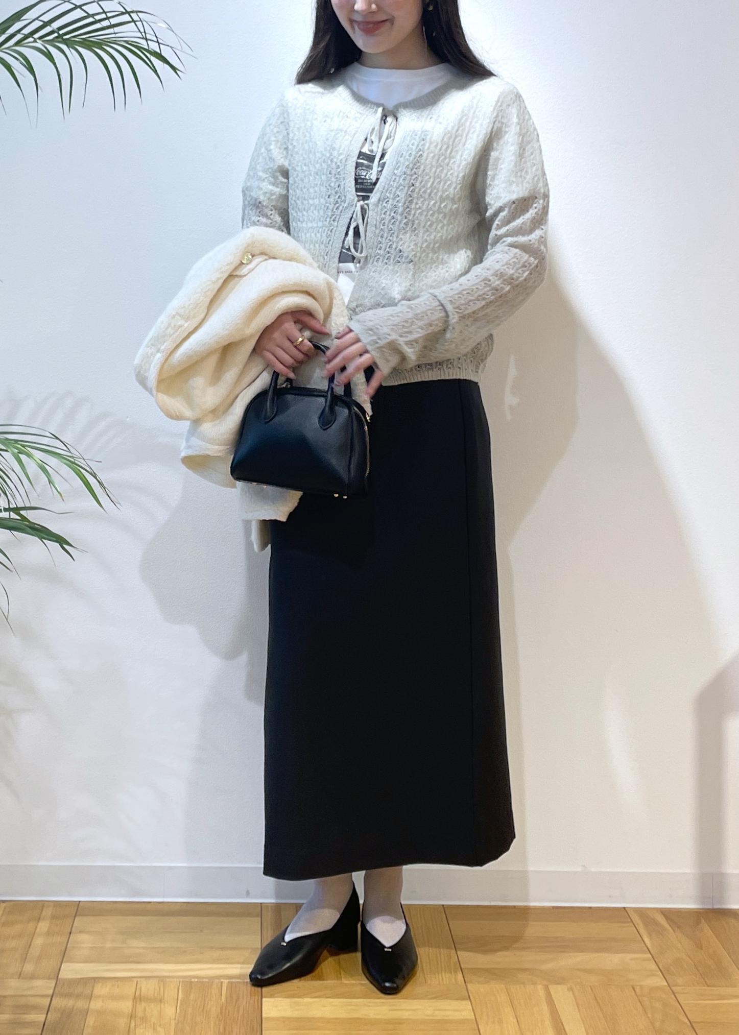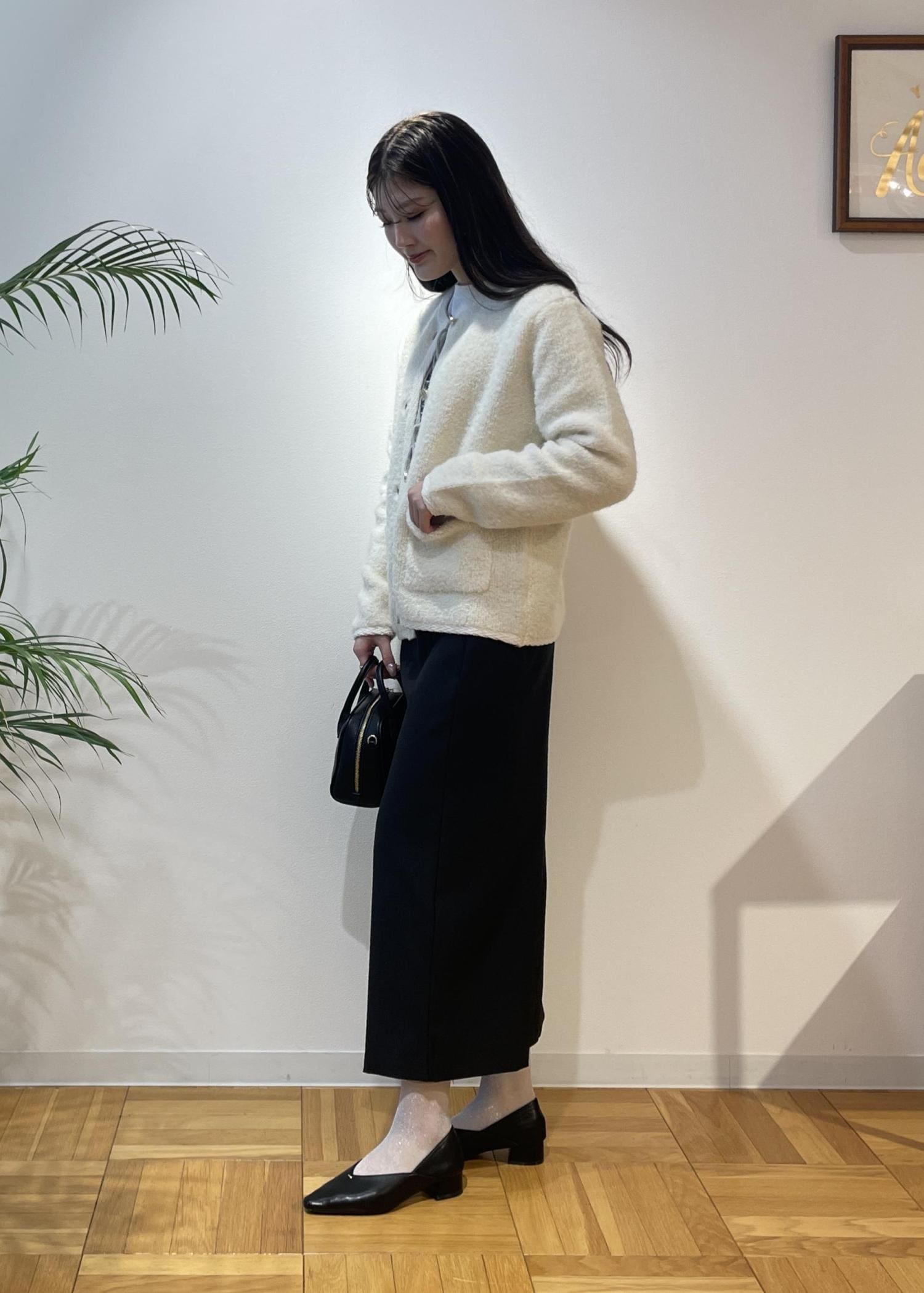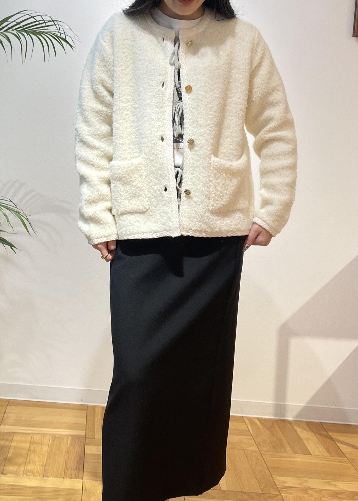 ふわふわのジャケットライクなカーディガンで女性らしいスタイリングです。