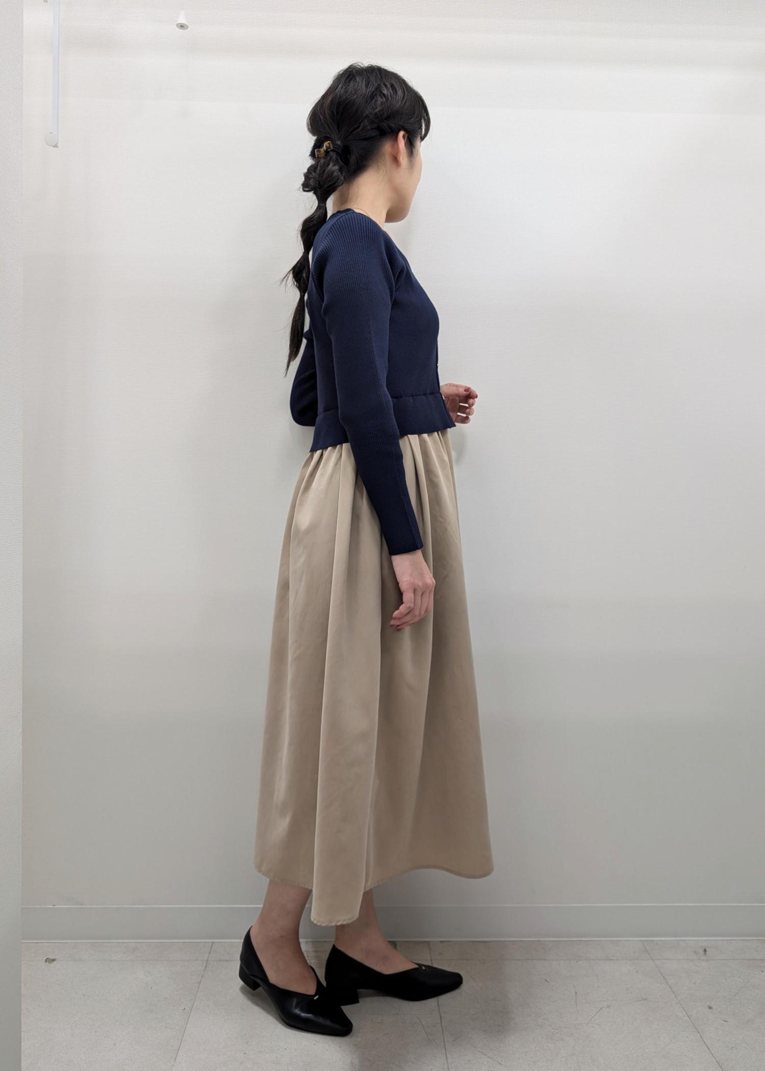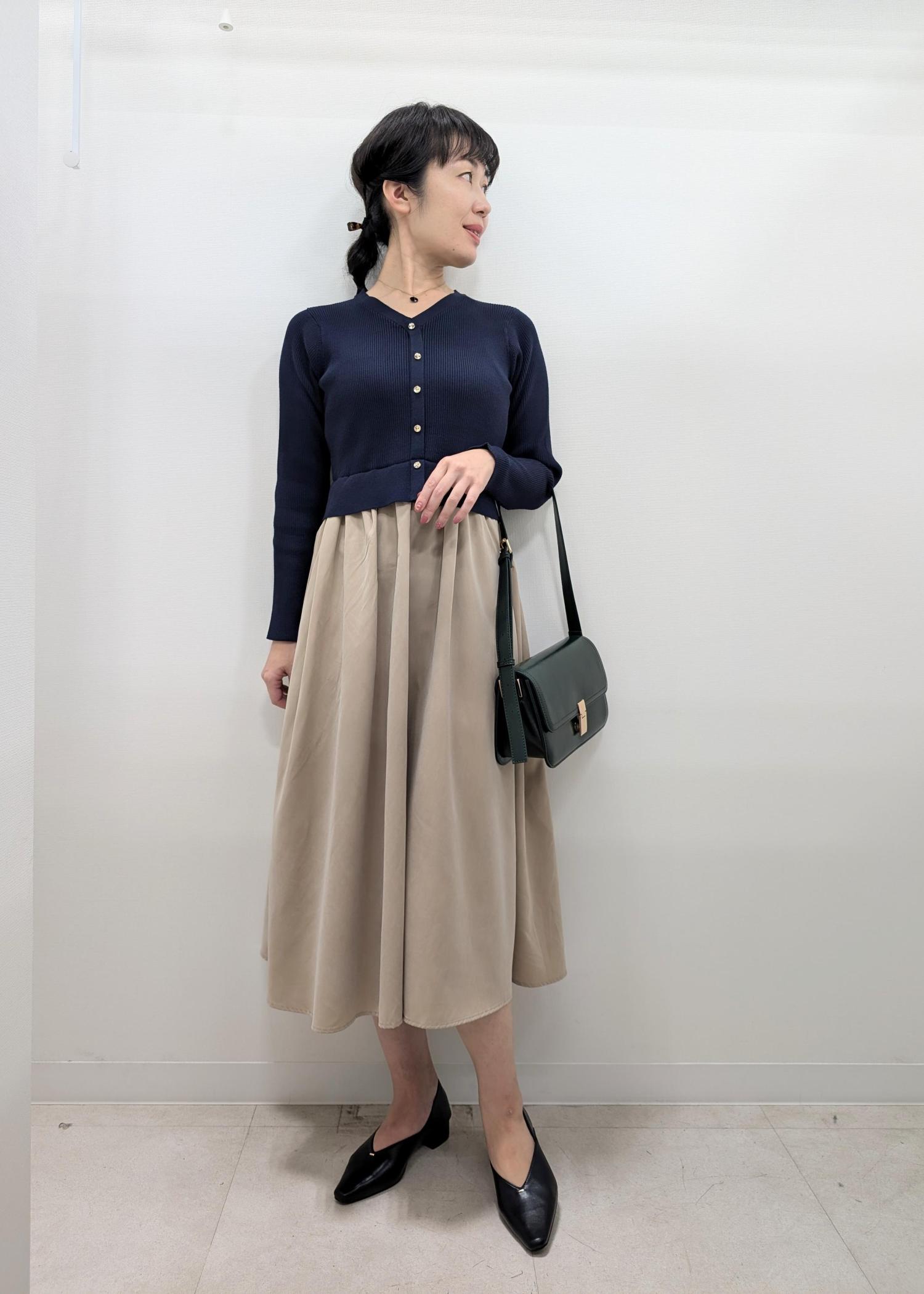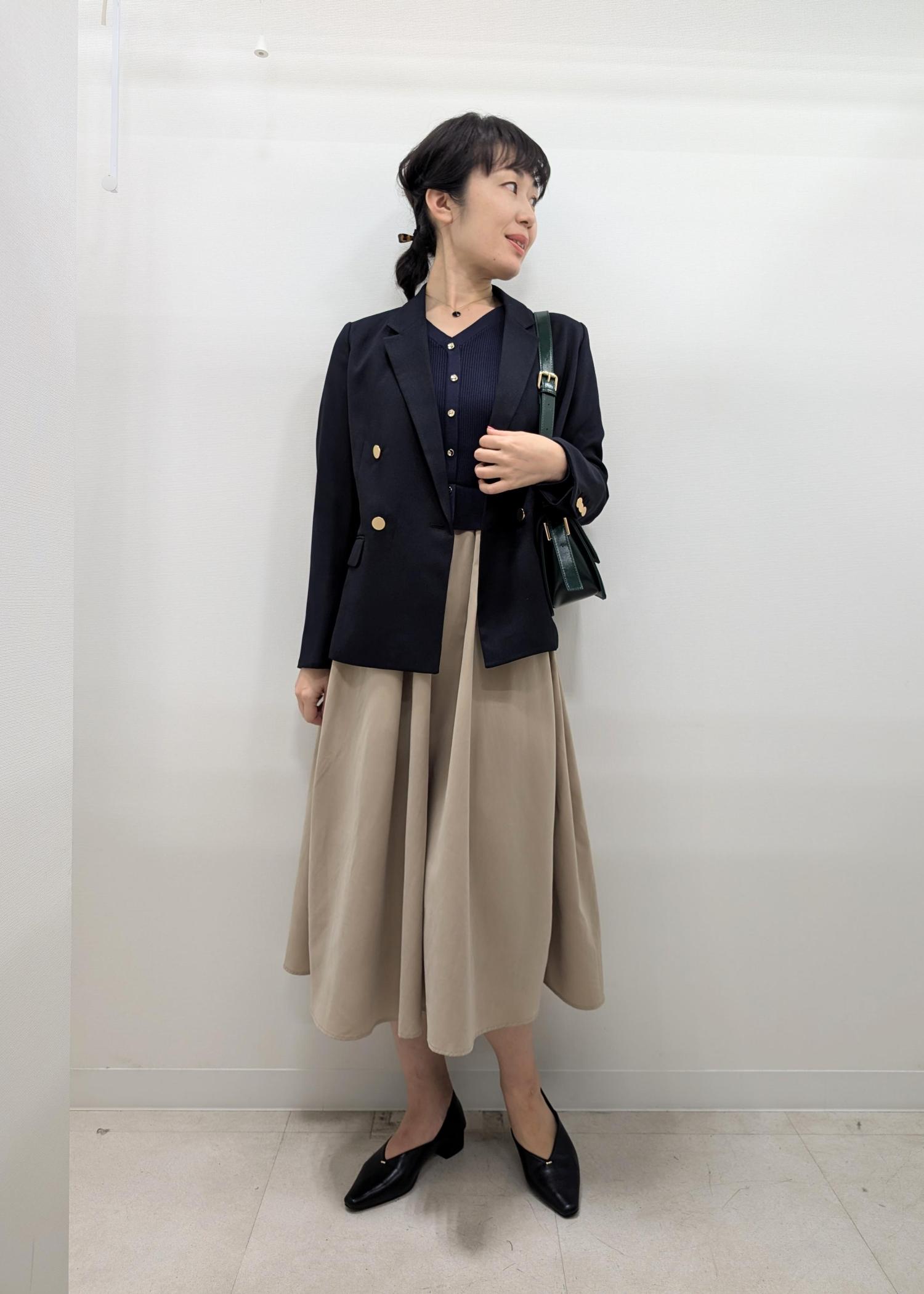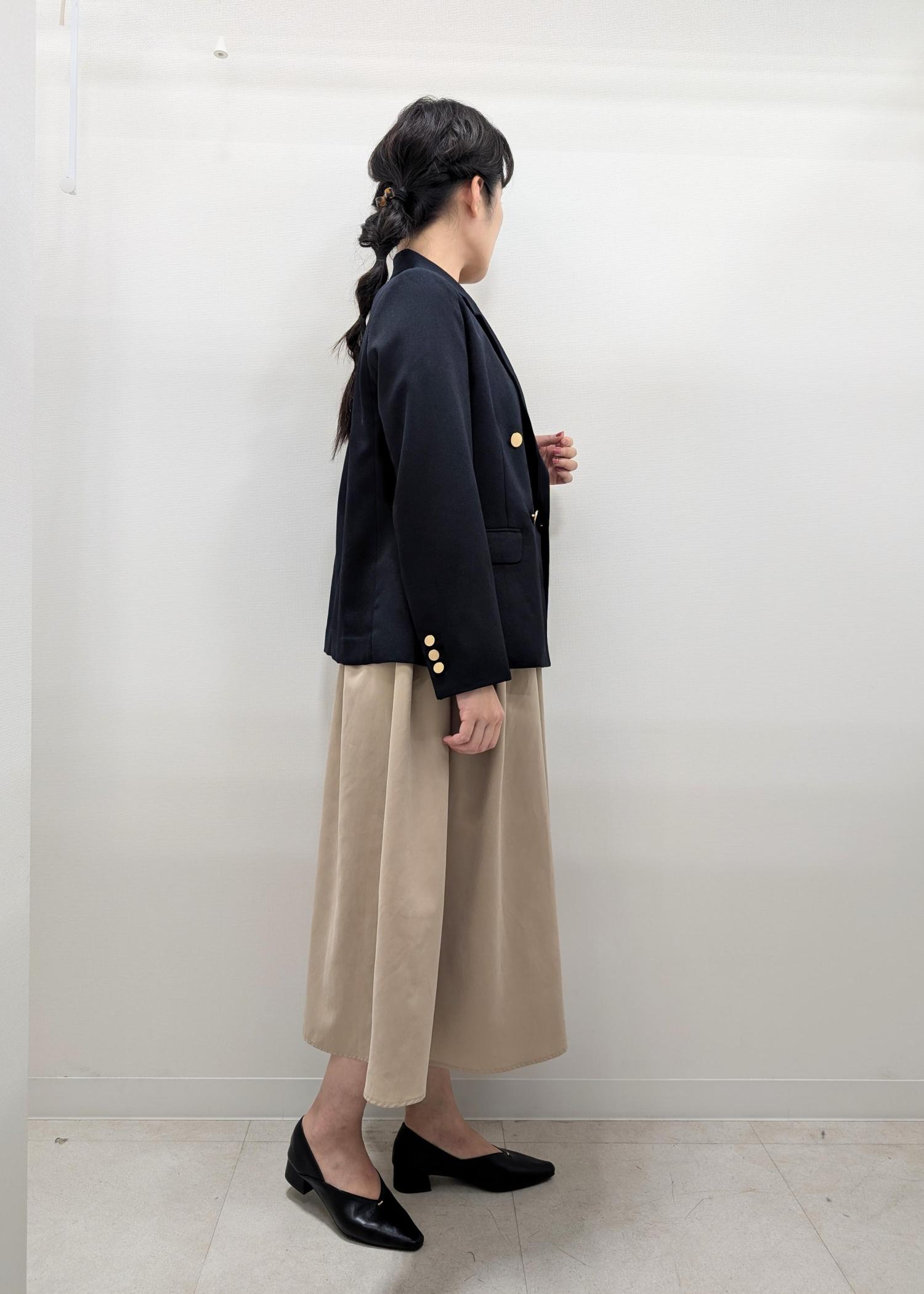 フィットアンドフレアのシルエットが綺麗なワンピースなのでジャケットはスッキリとしたサイズ感のMサイズを合わせました!