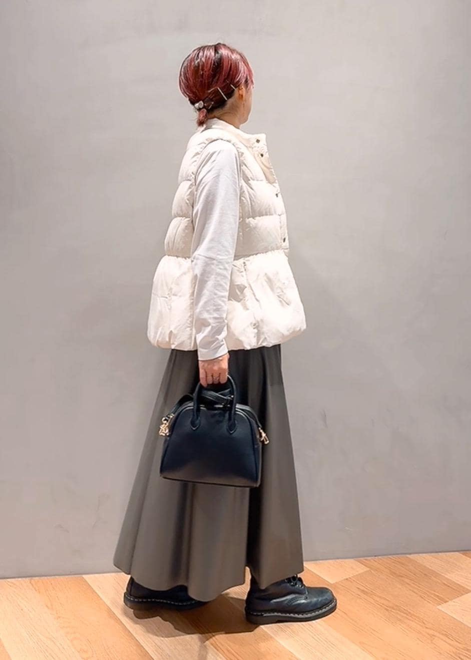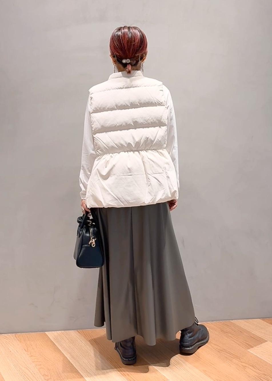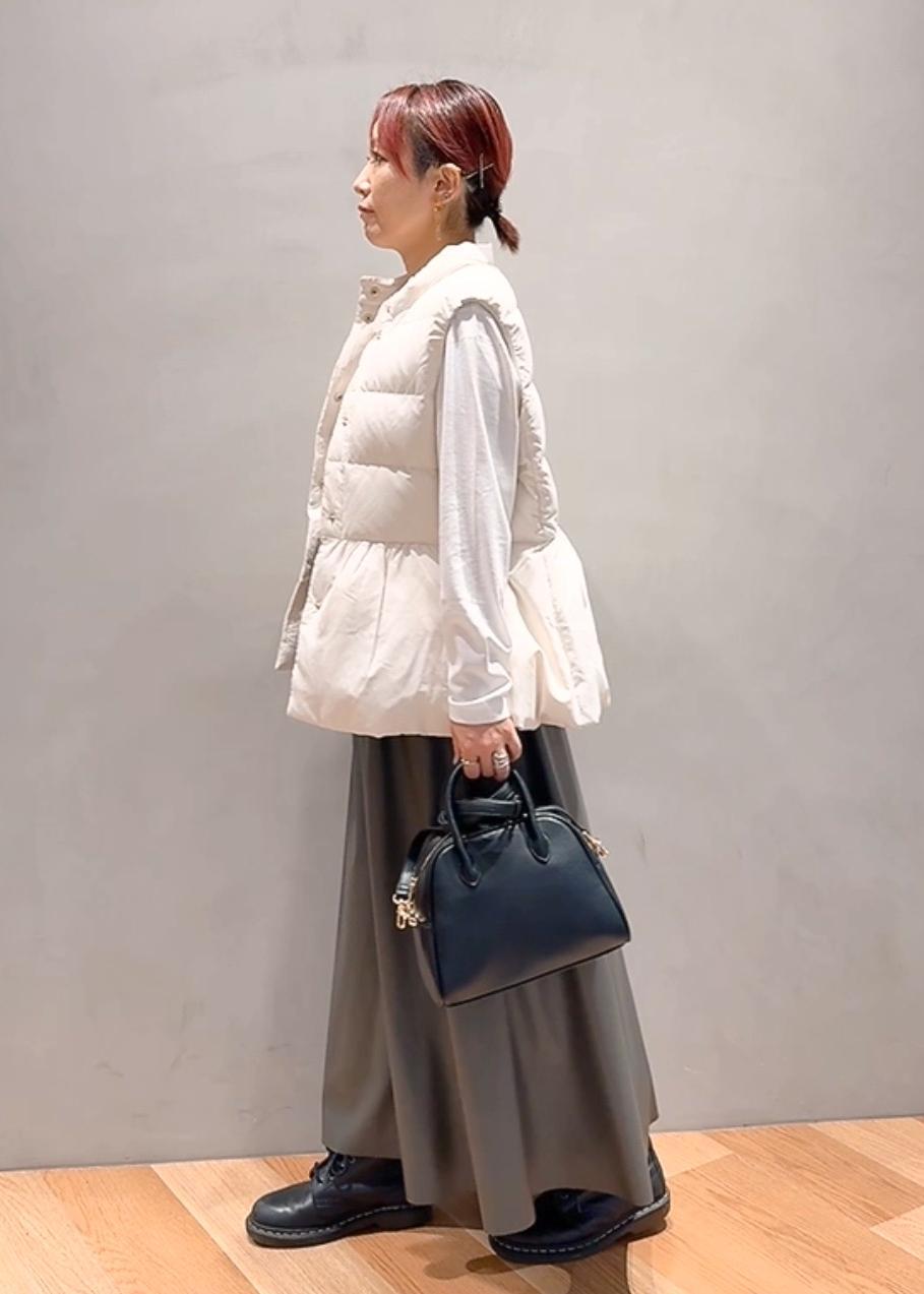 ホワイトのロンTに重ね、下はカーキ色のロングスカートでメリハリを。