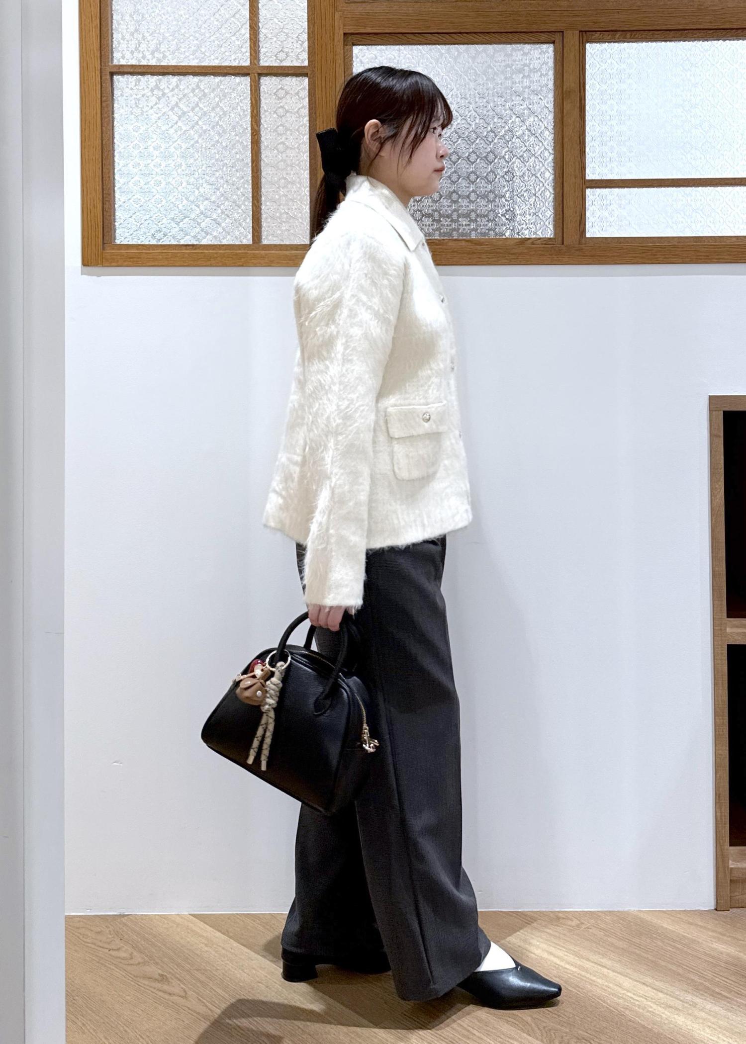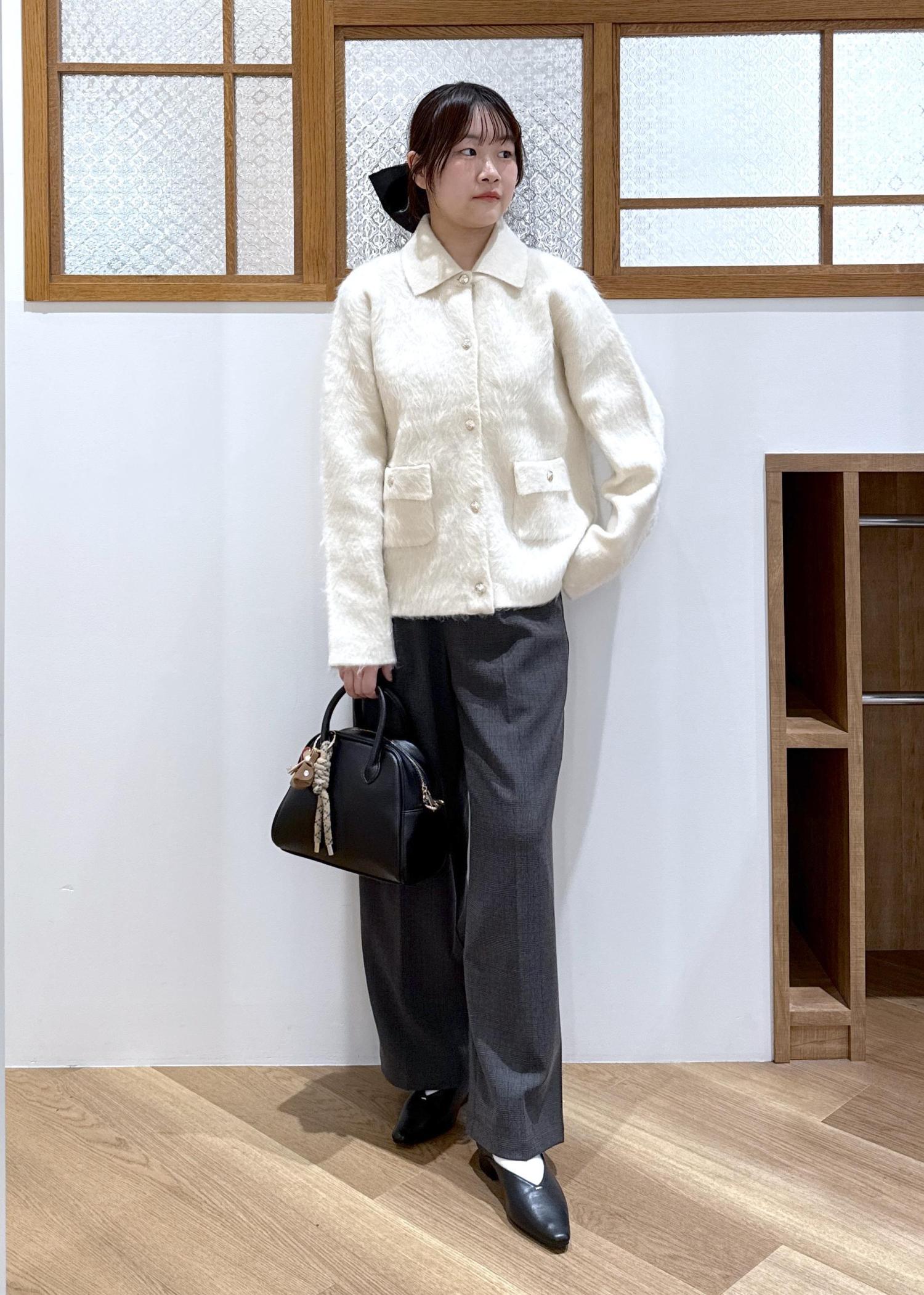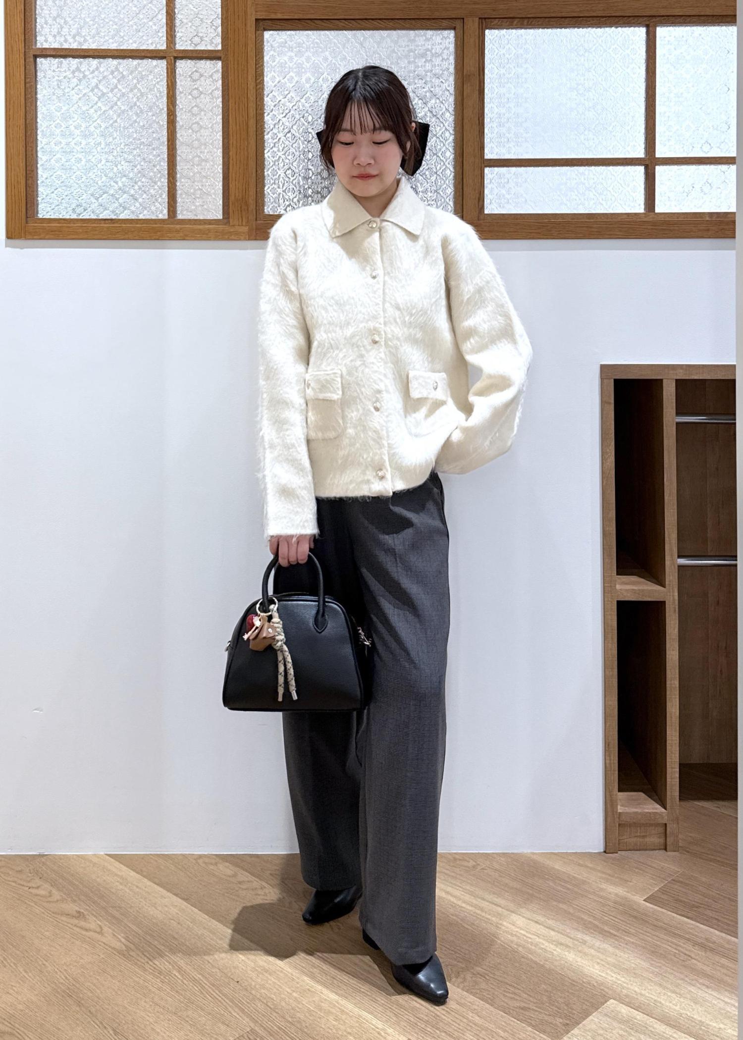 生地に存在感を感じられる襟付きカーディガンを主役にモノトーンのコーディネートを組みました。