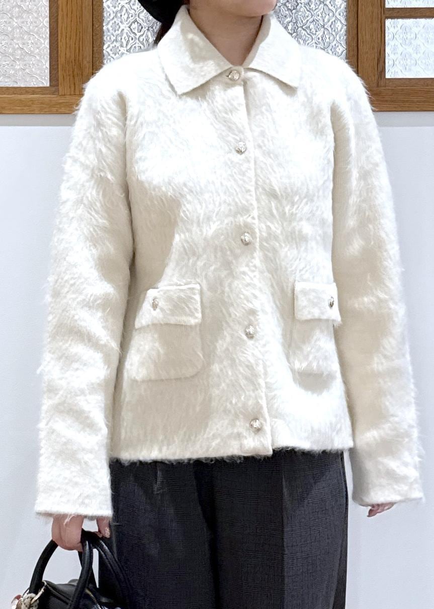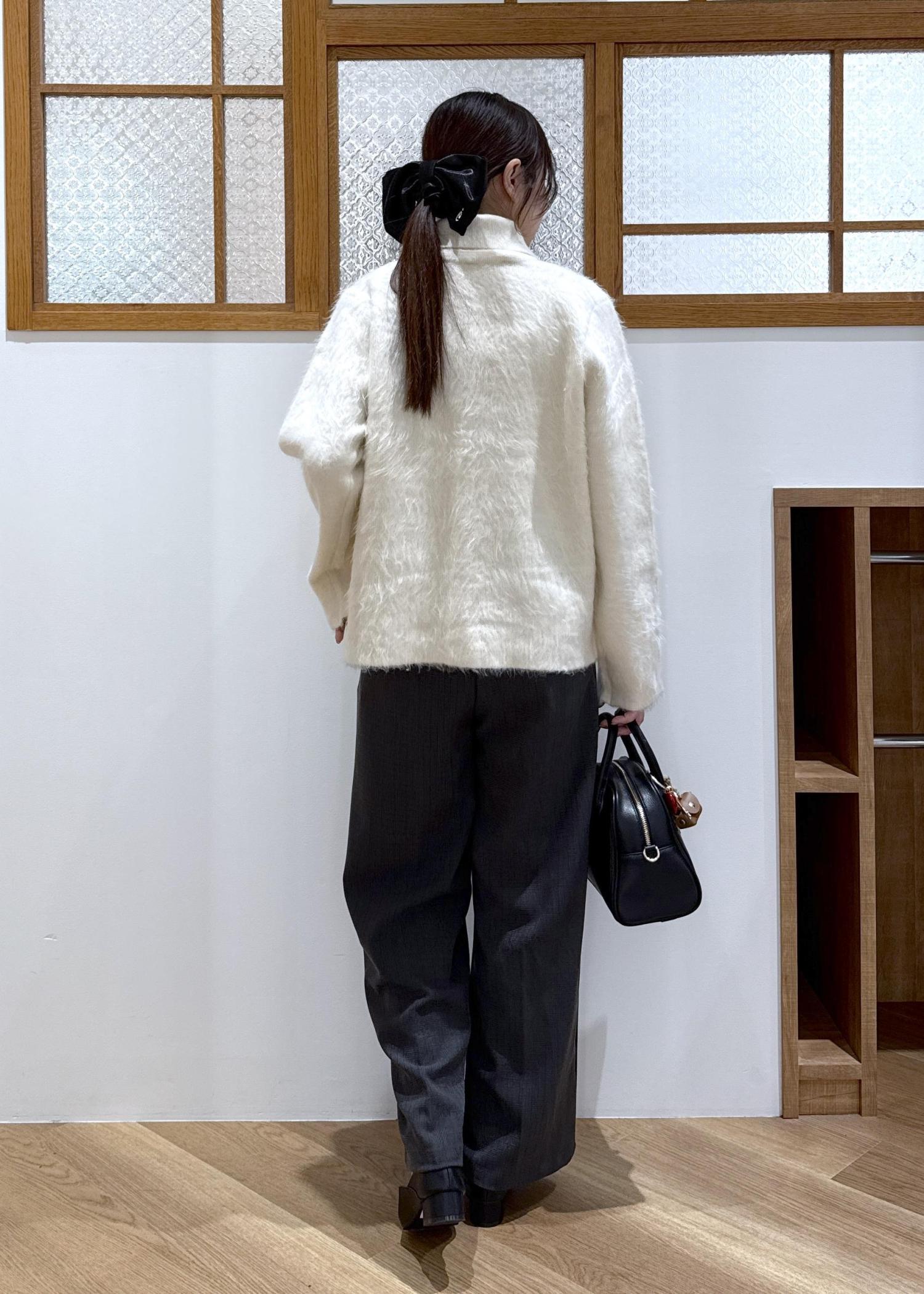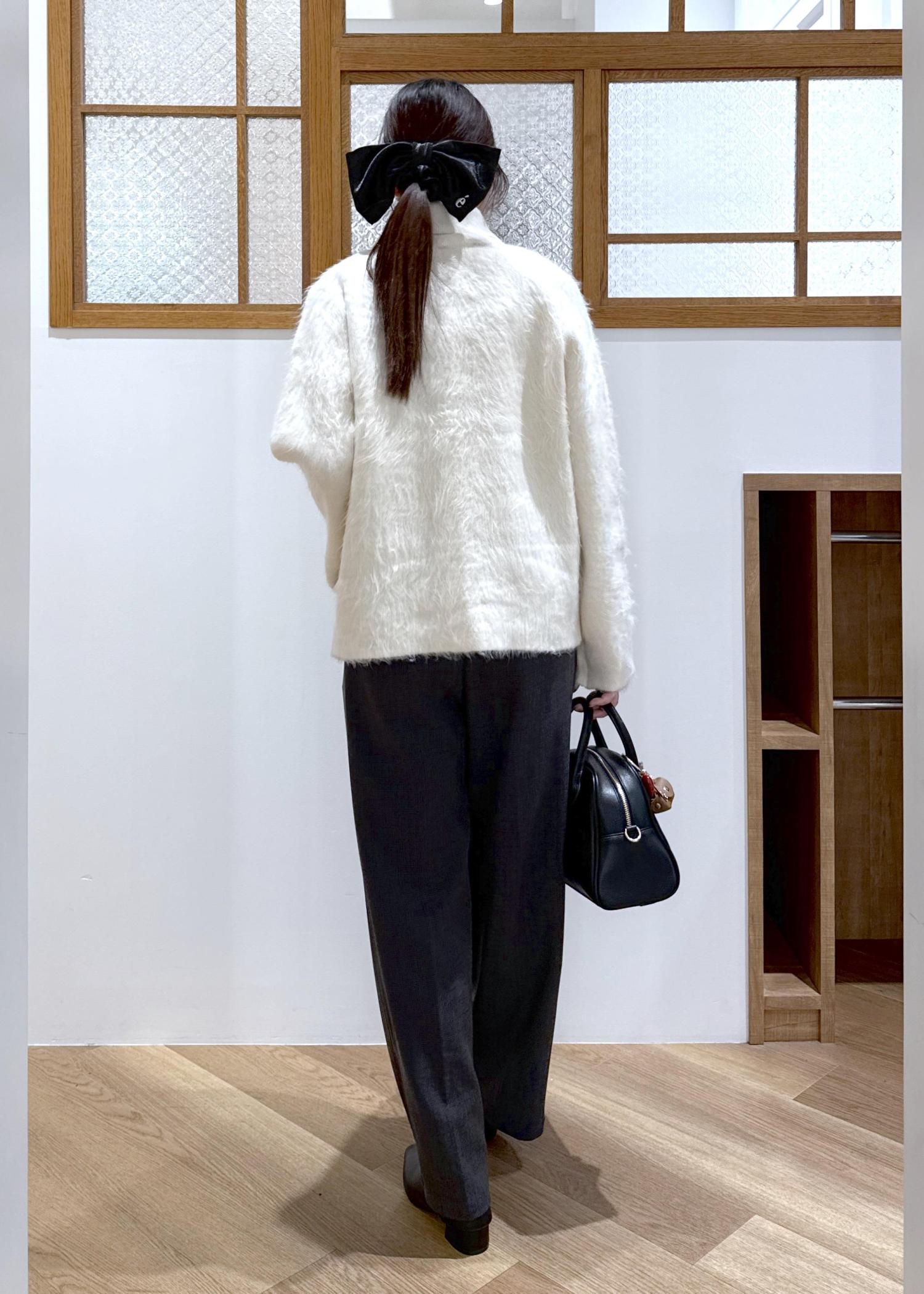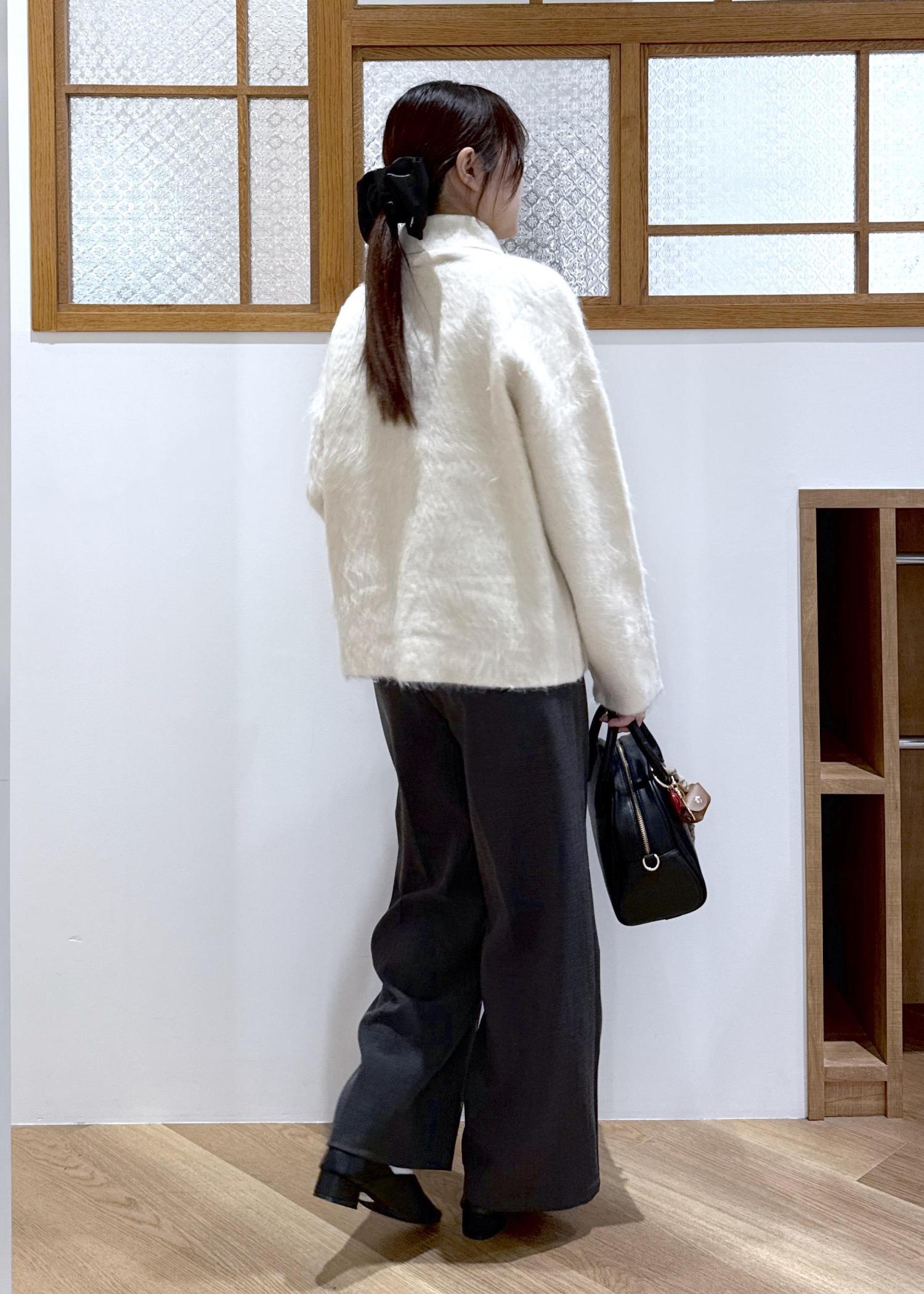 生地に存在感を感じられる襟付きカーディガンを主役にモノトーンのコーディネートを組みました。