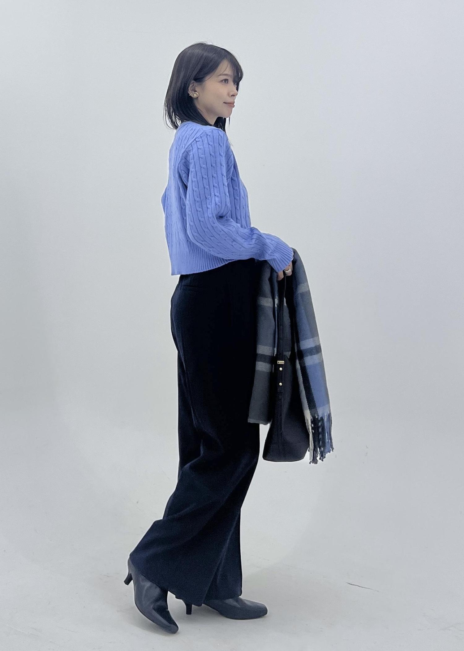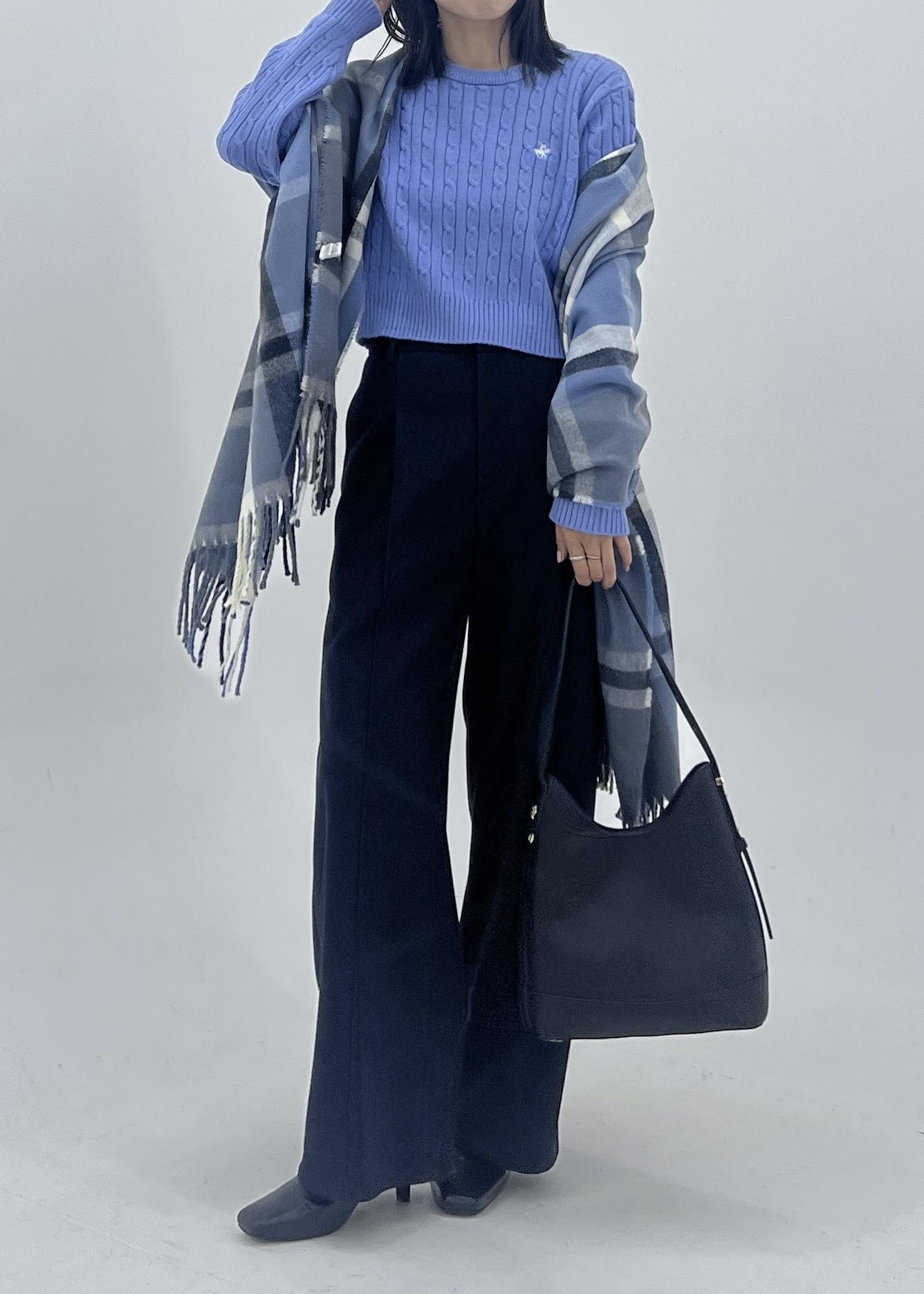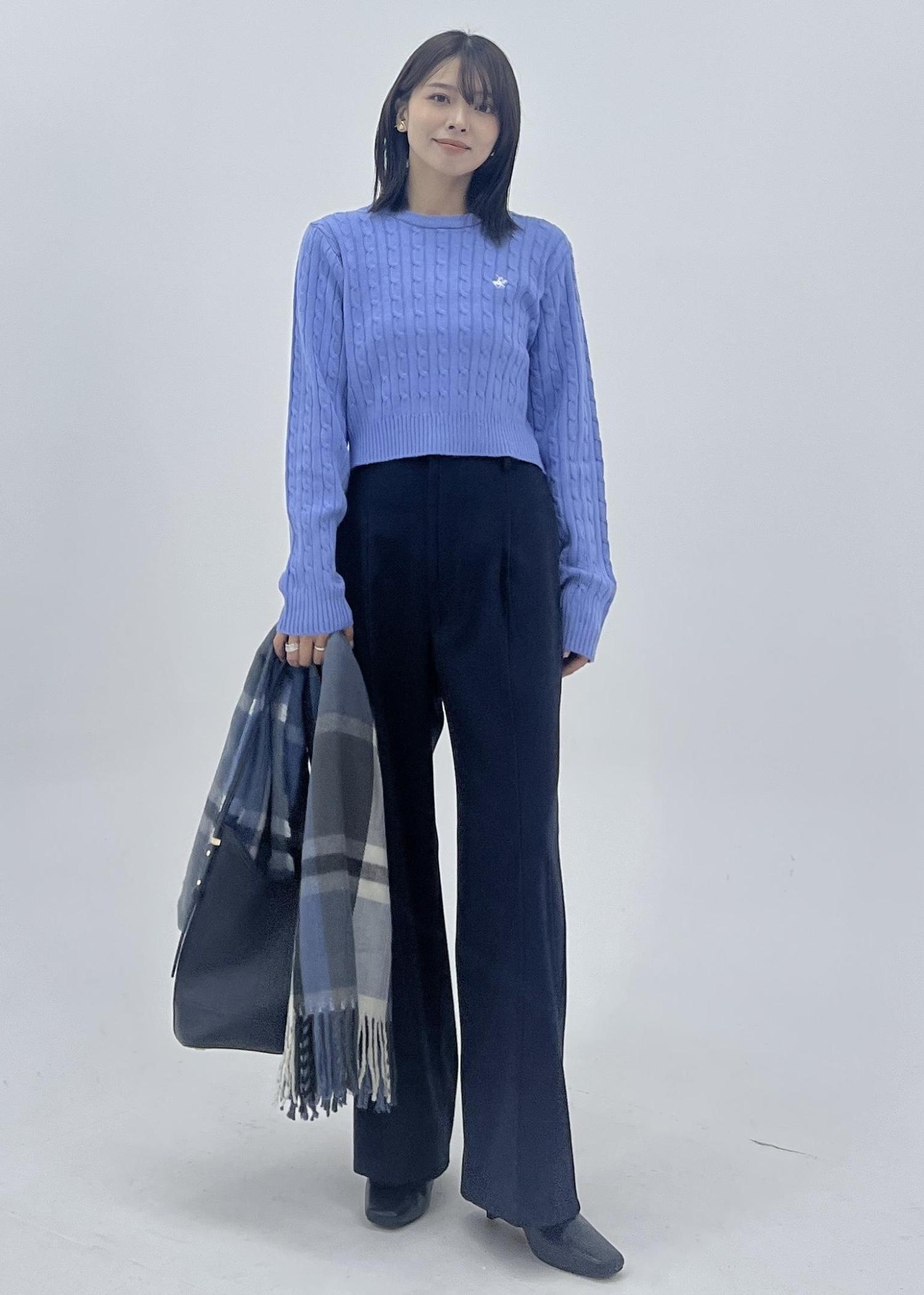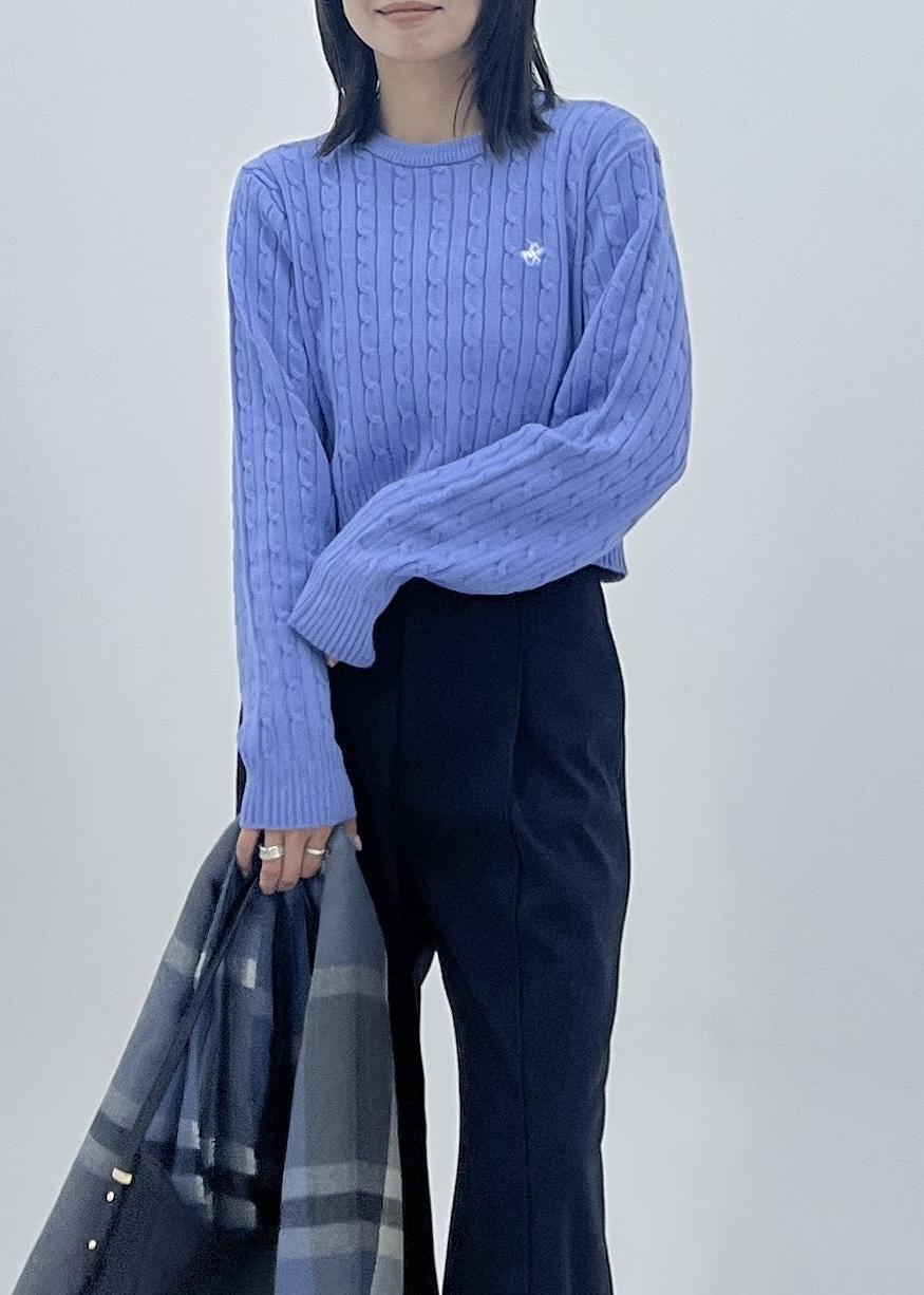柔らかいブルーニットは、ケーブル編みの生地がコーデのポイントになってくれます。