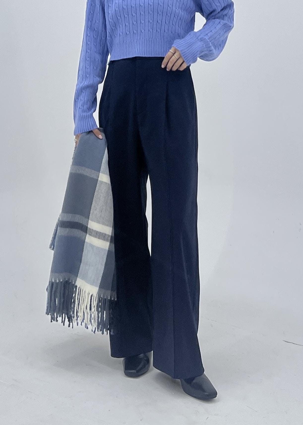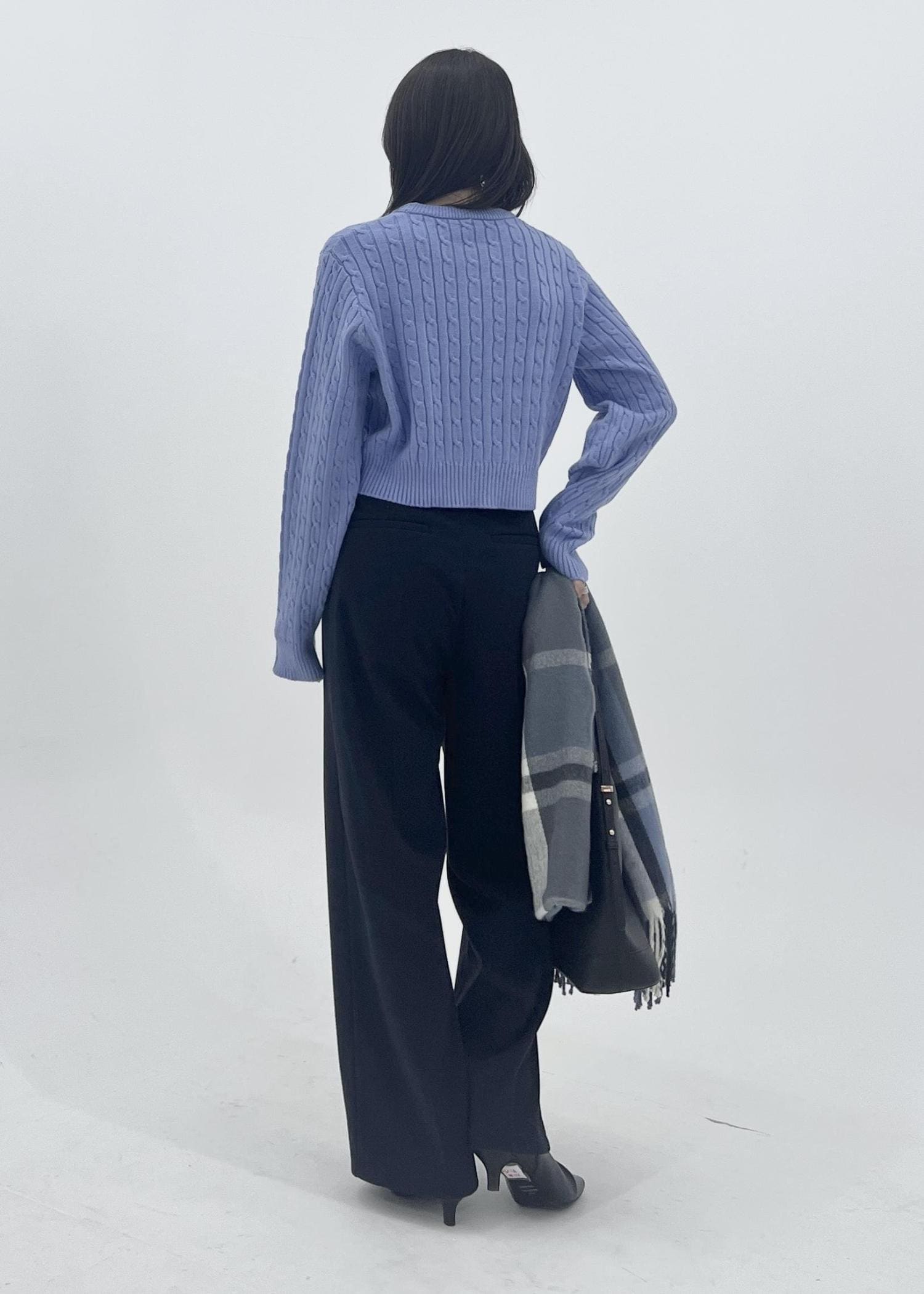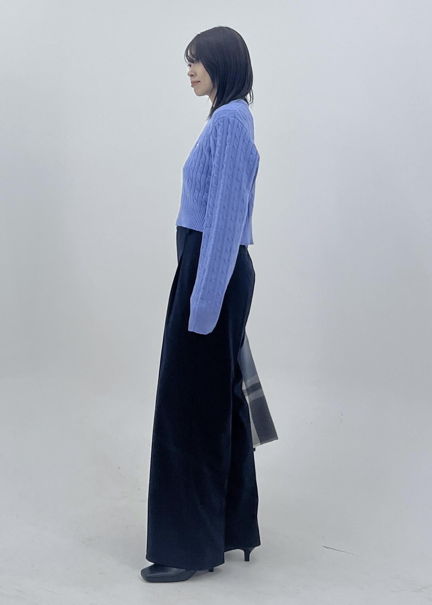 柔らかいブルーニットは、ケーブル編みの生地がコーデのポイントになってくれます。