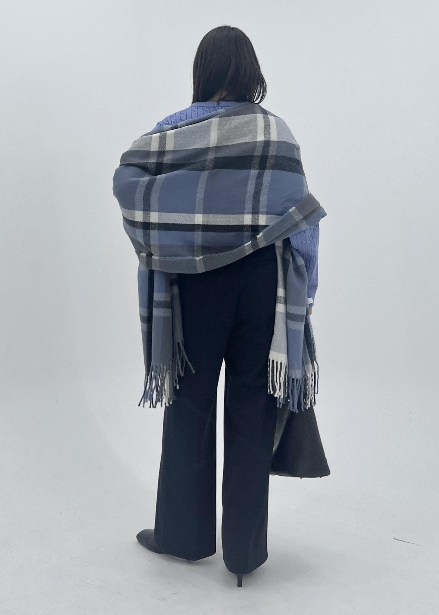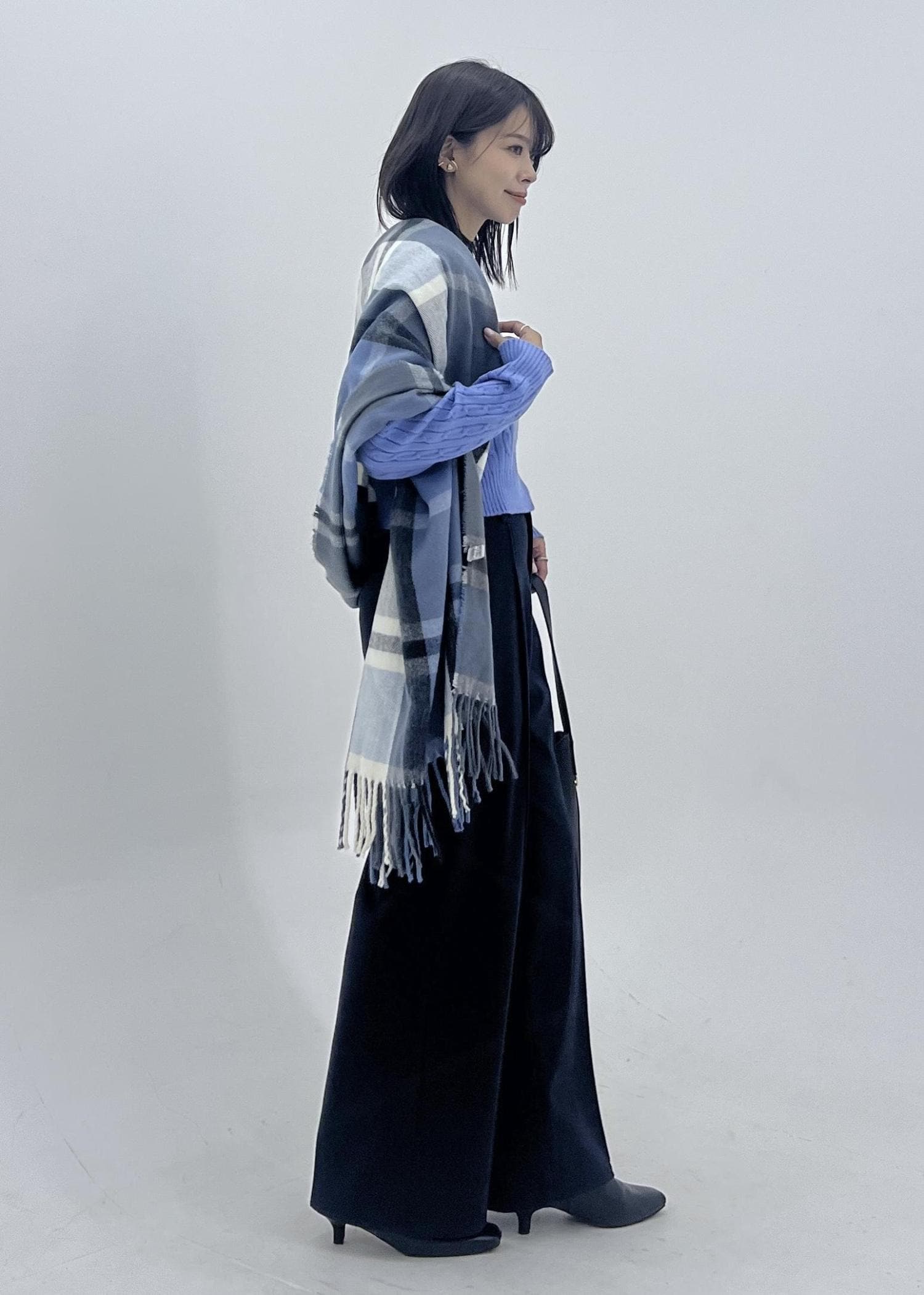 チェック柄のストールをアクセントに、冬の大人カジュアルなスタイリングにしました。