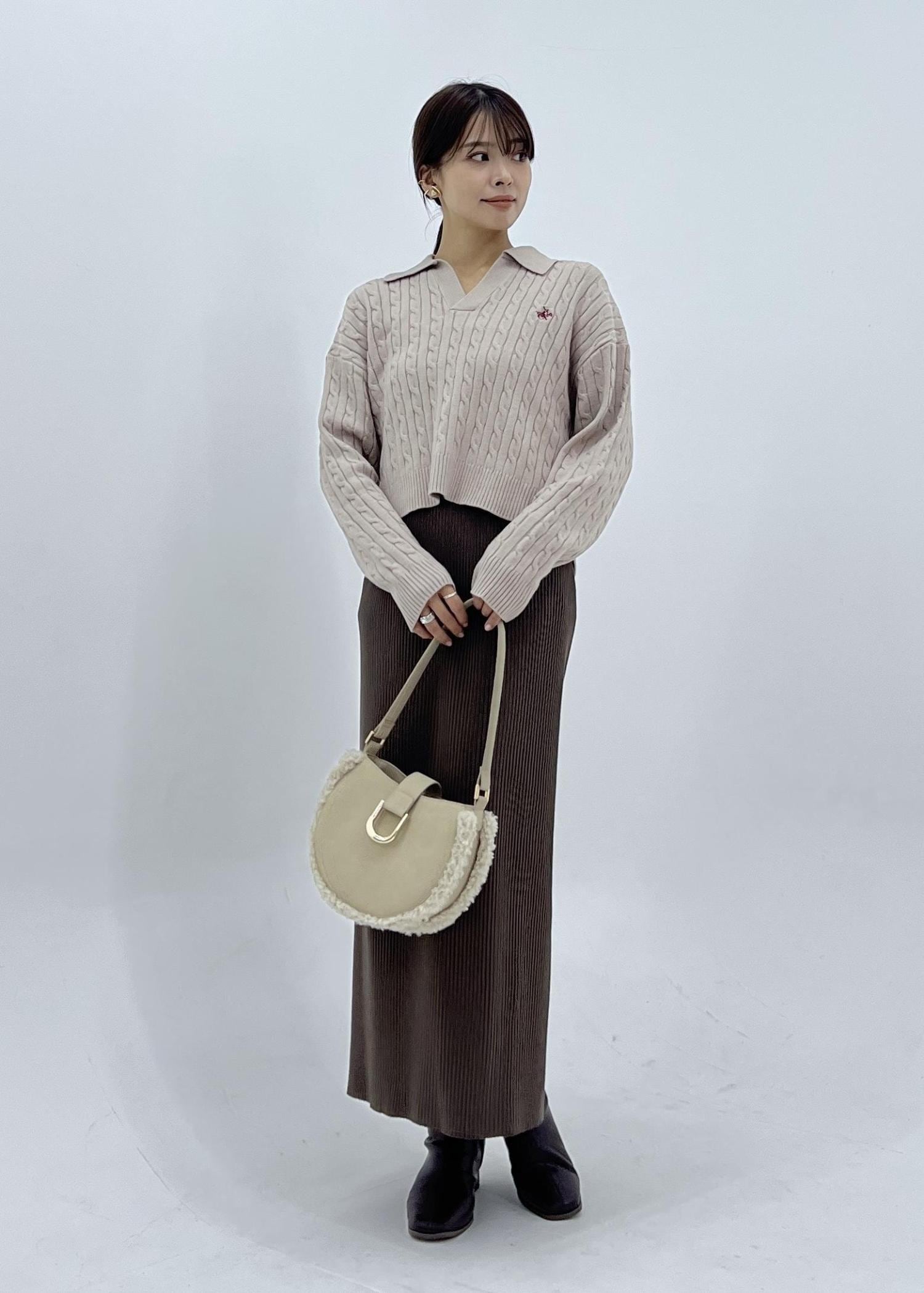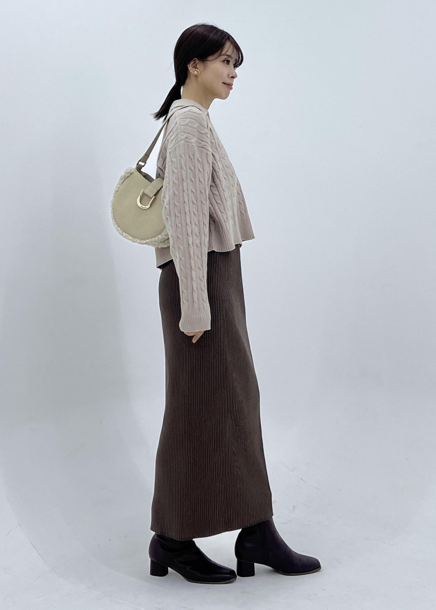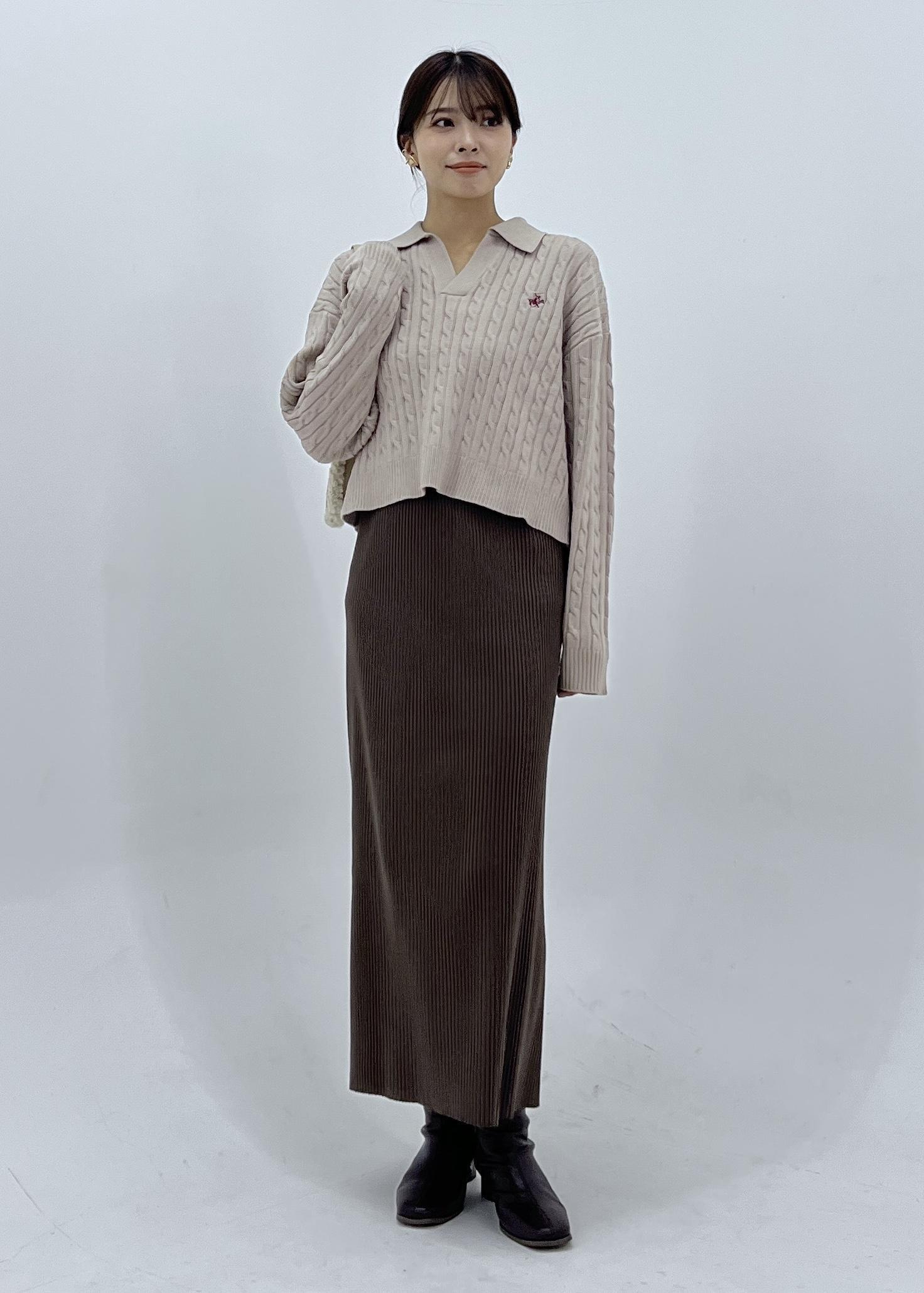 トレンド感のある襟付きニットは、柔らかいベージュで大人カジュアルなスタイリングもおすすめ。