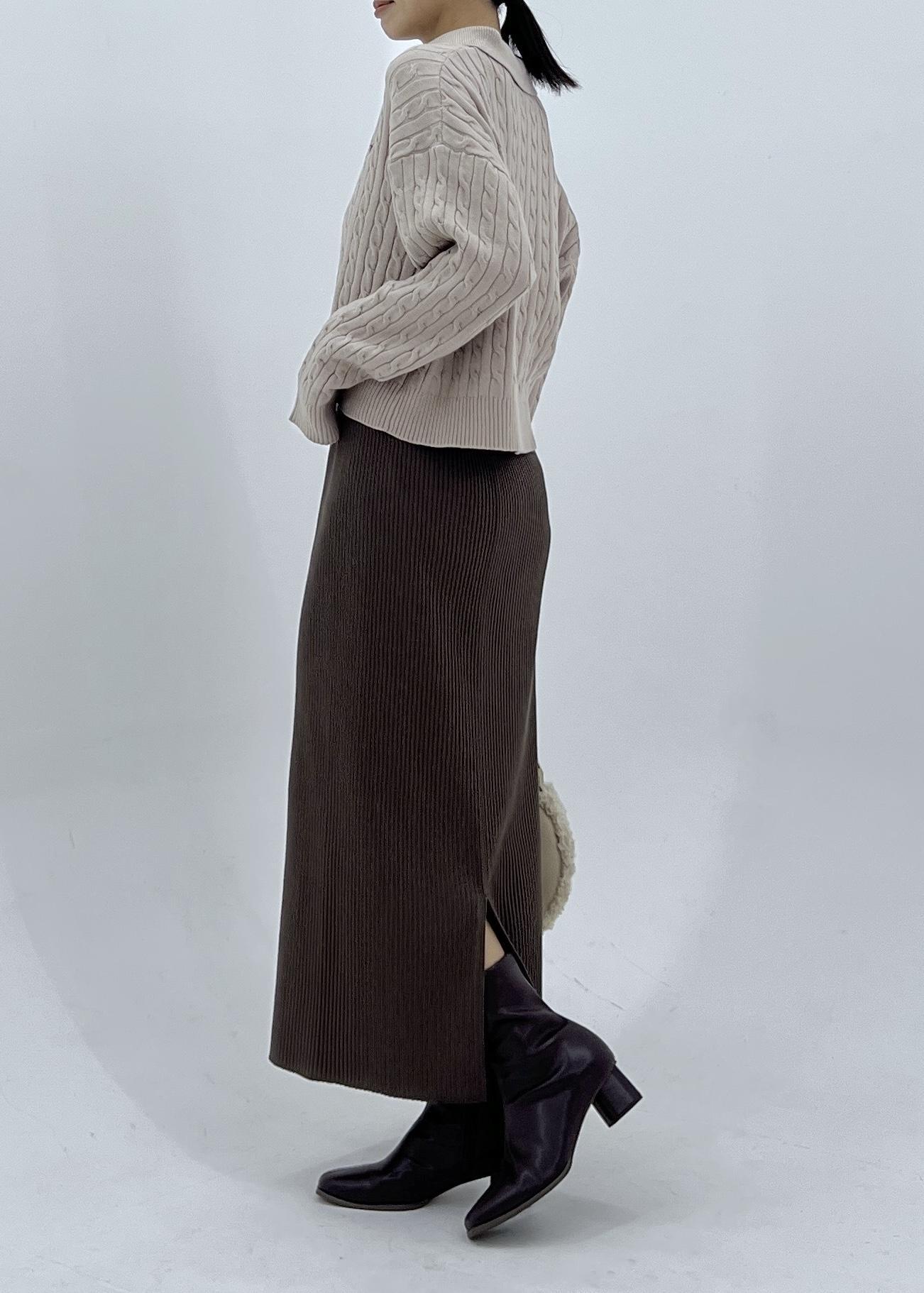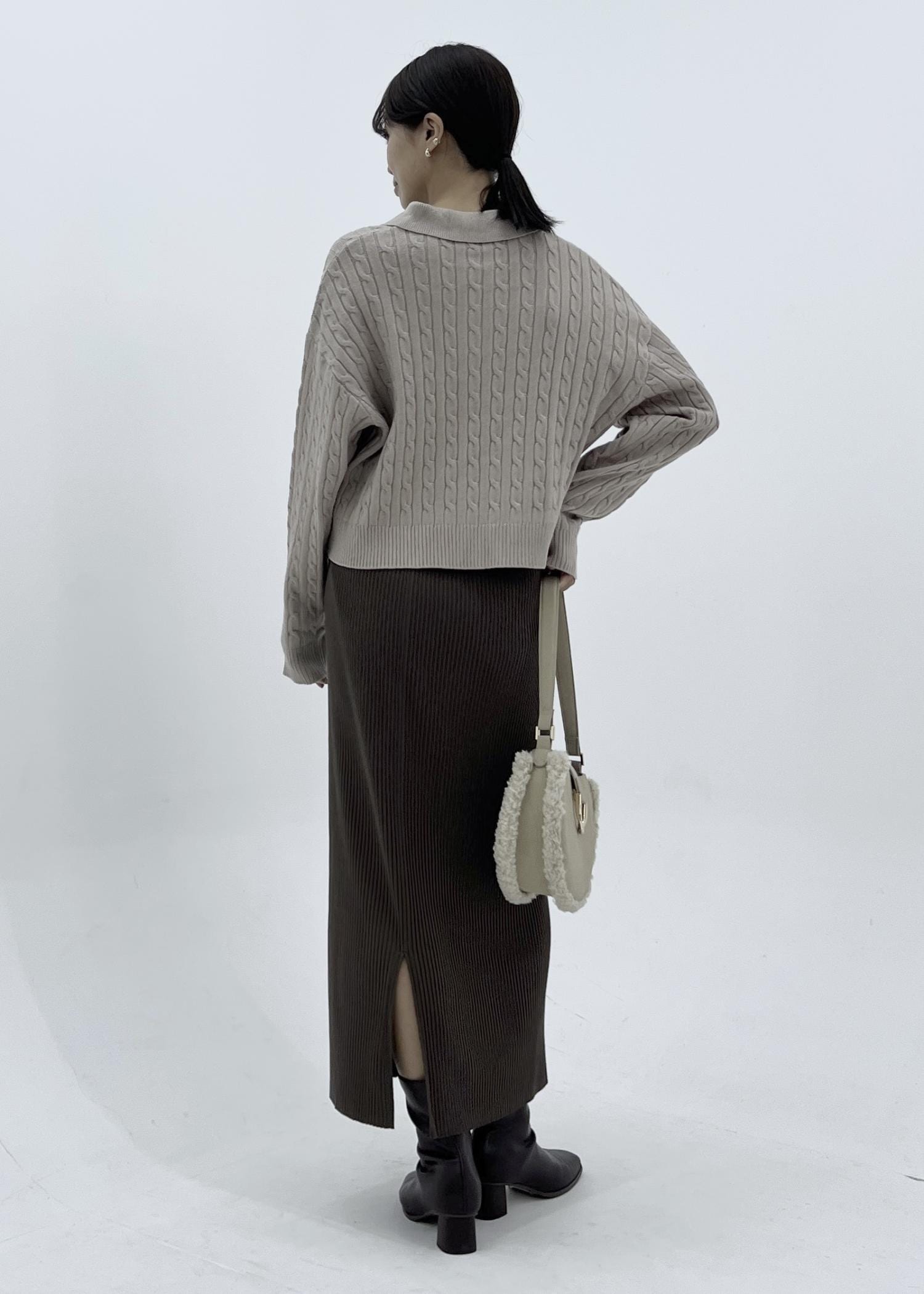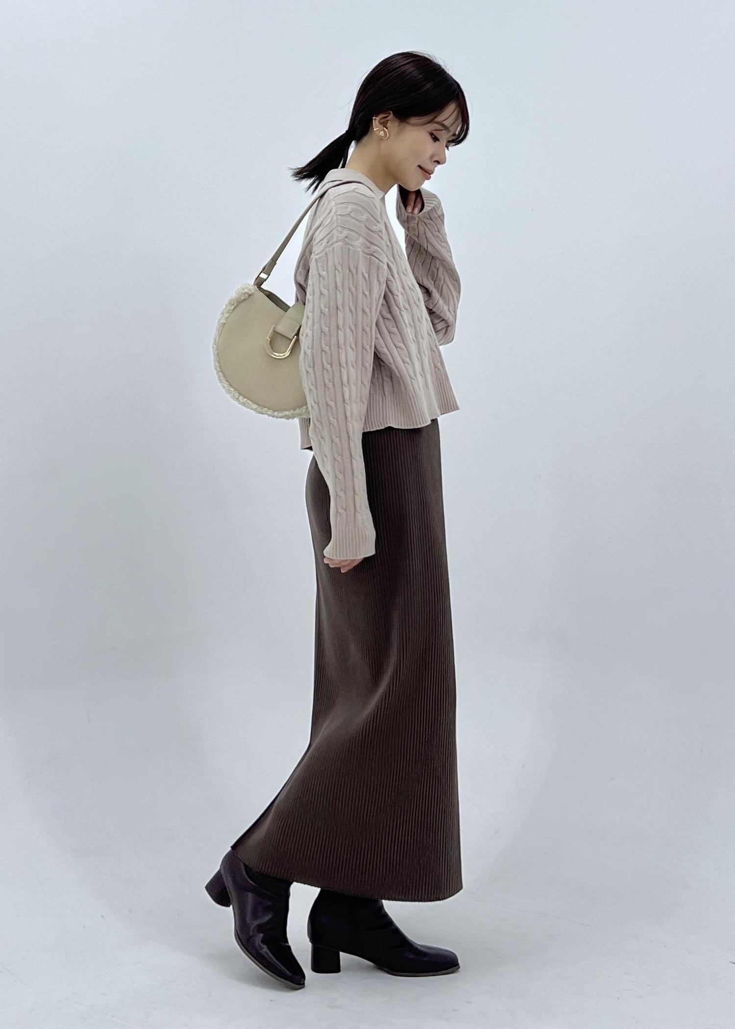 トレンド感のある襟付きニットは、柔らかいベージュで大人カジュアルなスタイリングもおすすめ。