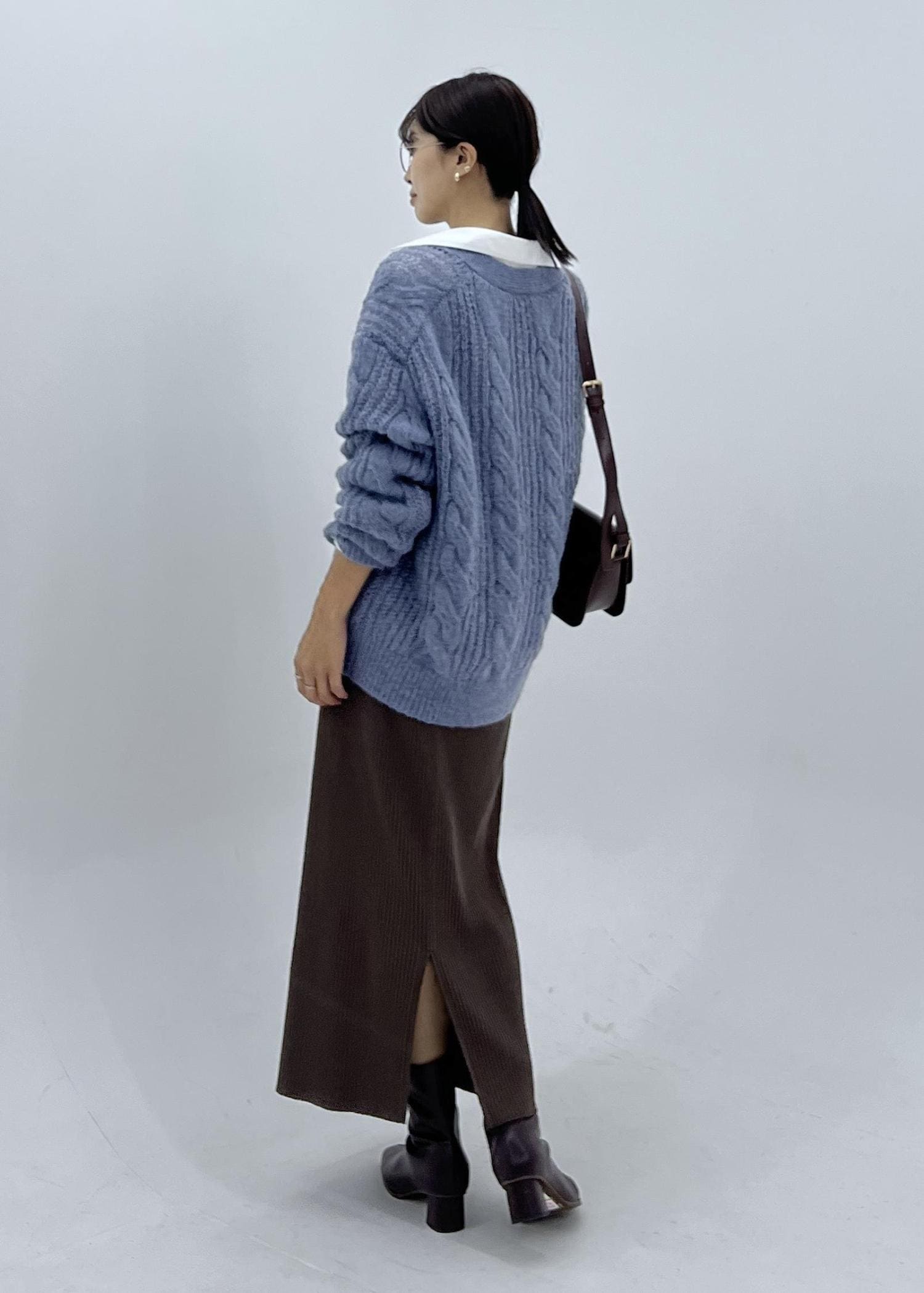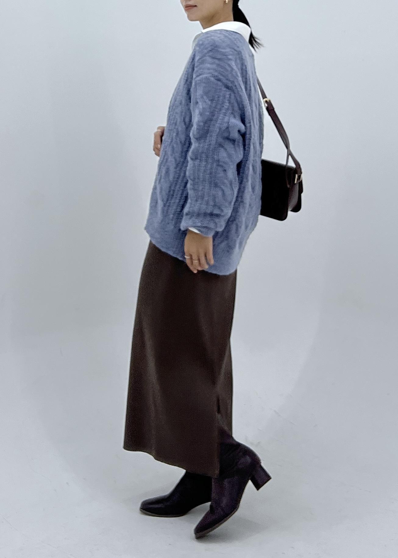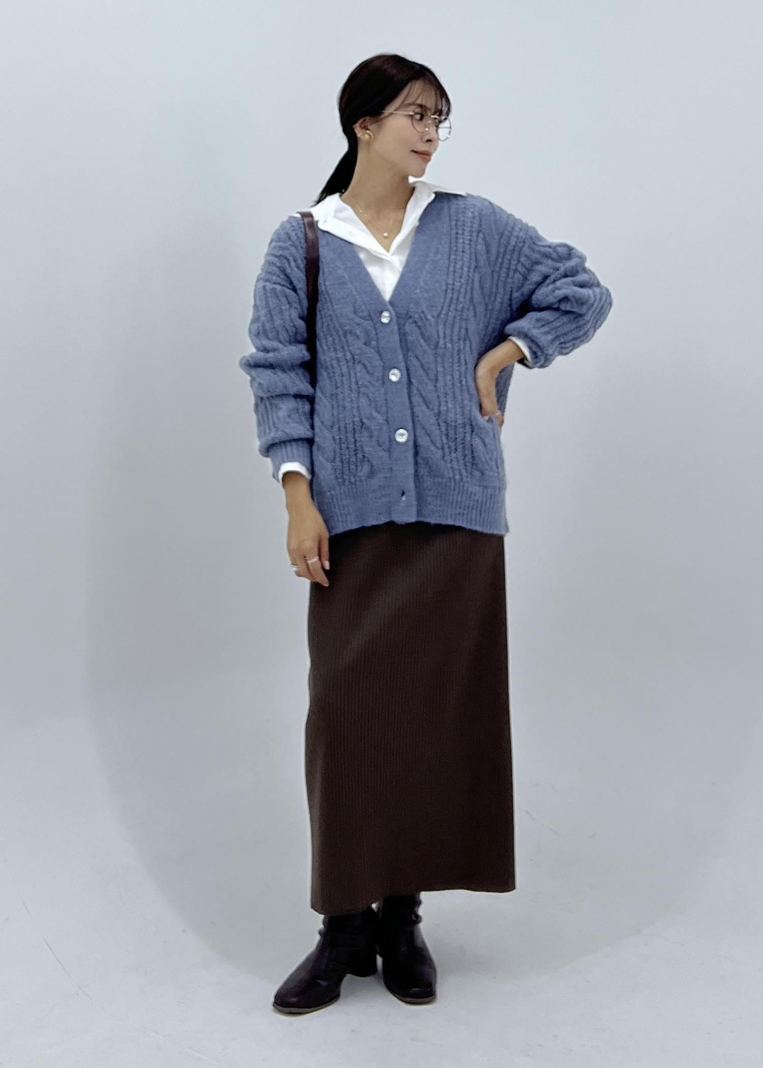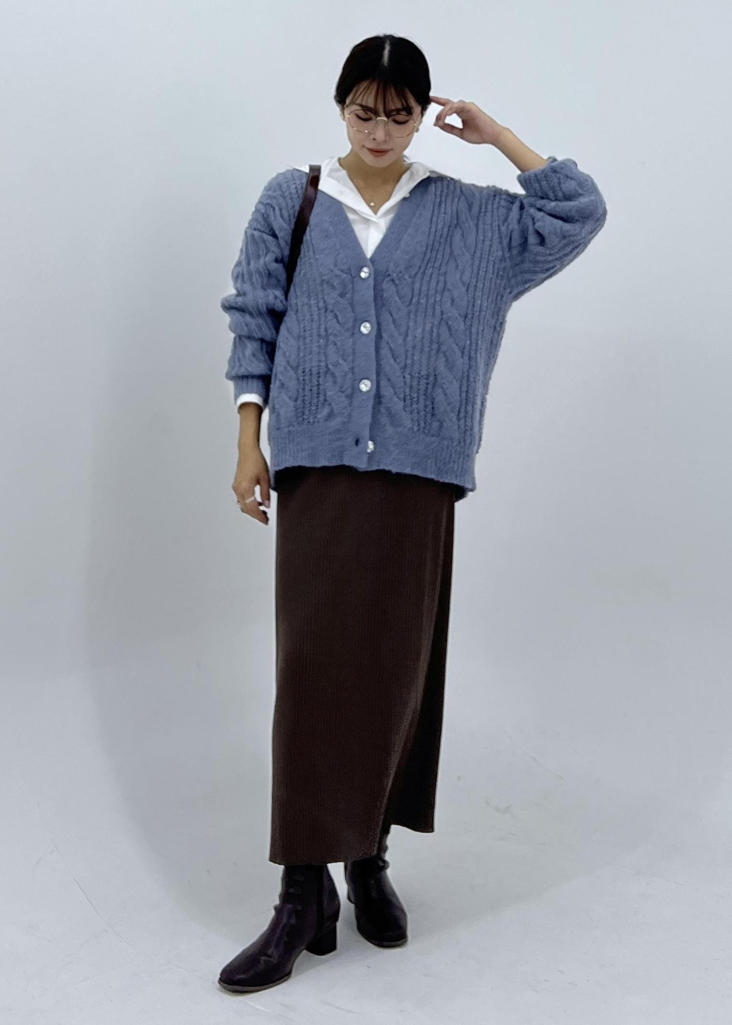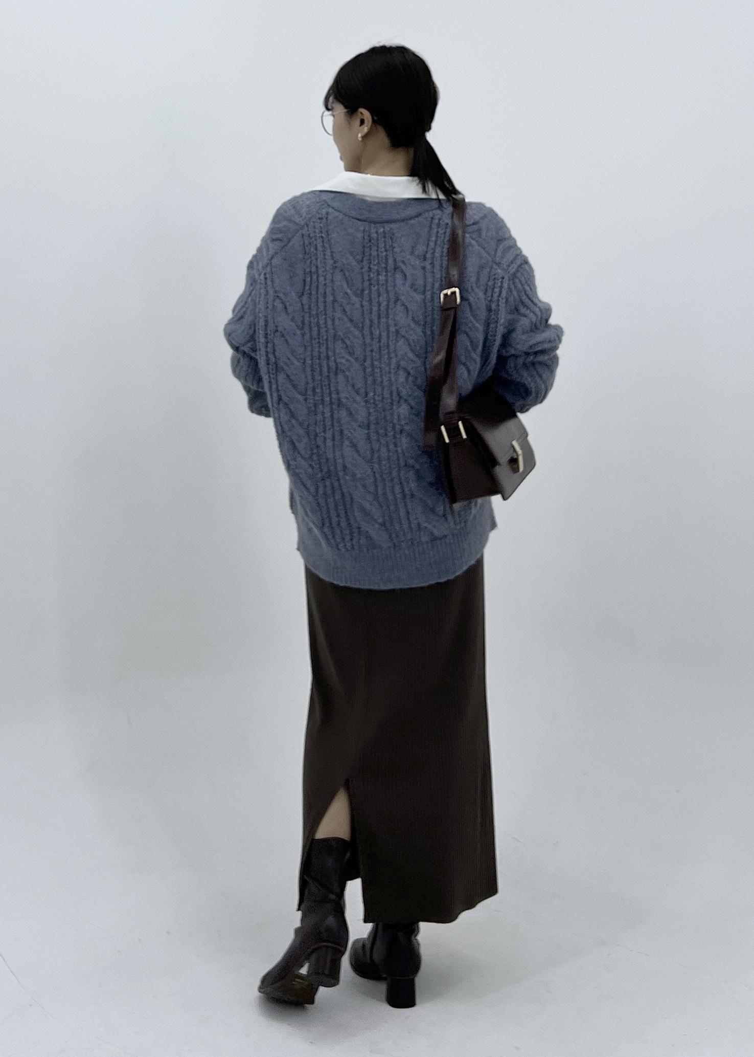 ゆったりカーディガンにはアイラインスカートでスッキリ感のあるコーデにまとめました。