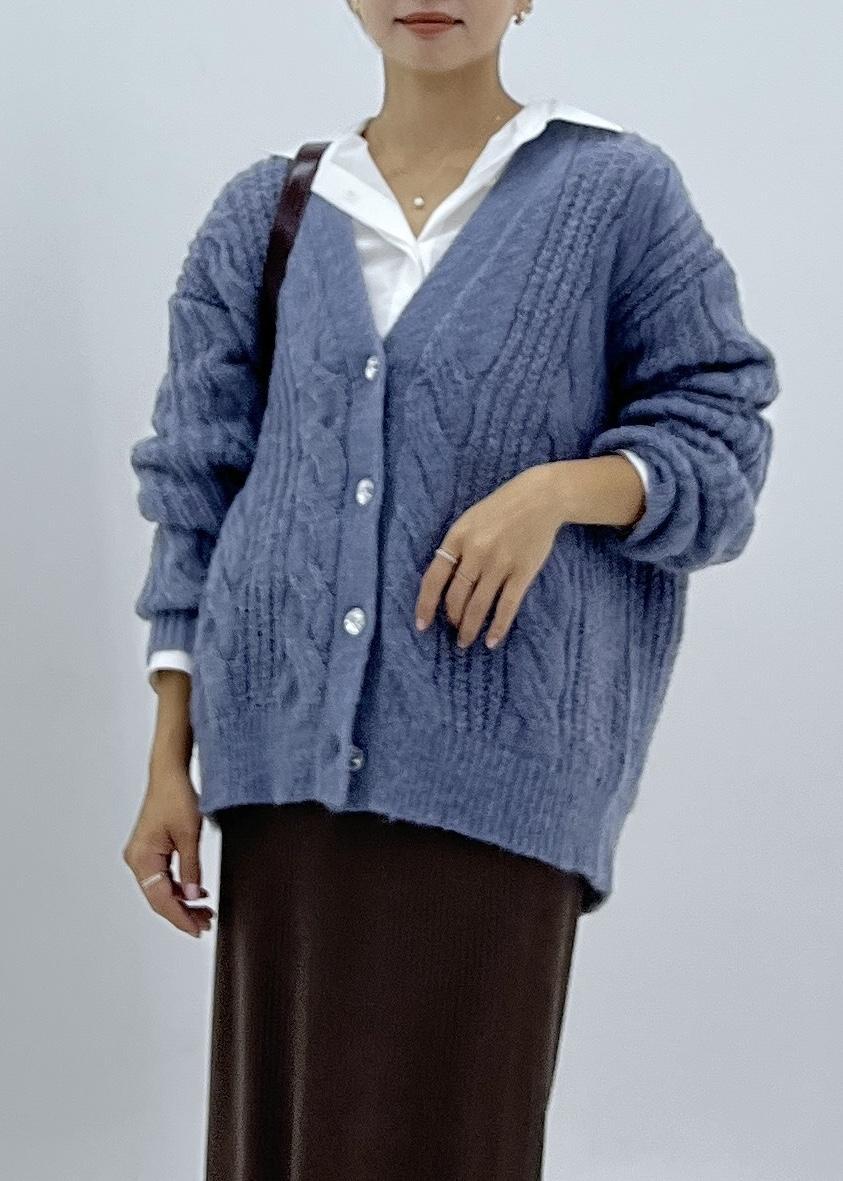 柔らかいブルーのカーディガンはざっくりローゲージが大人カジュアルなコーデにおすすめ。