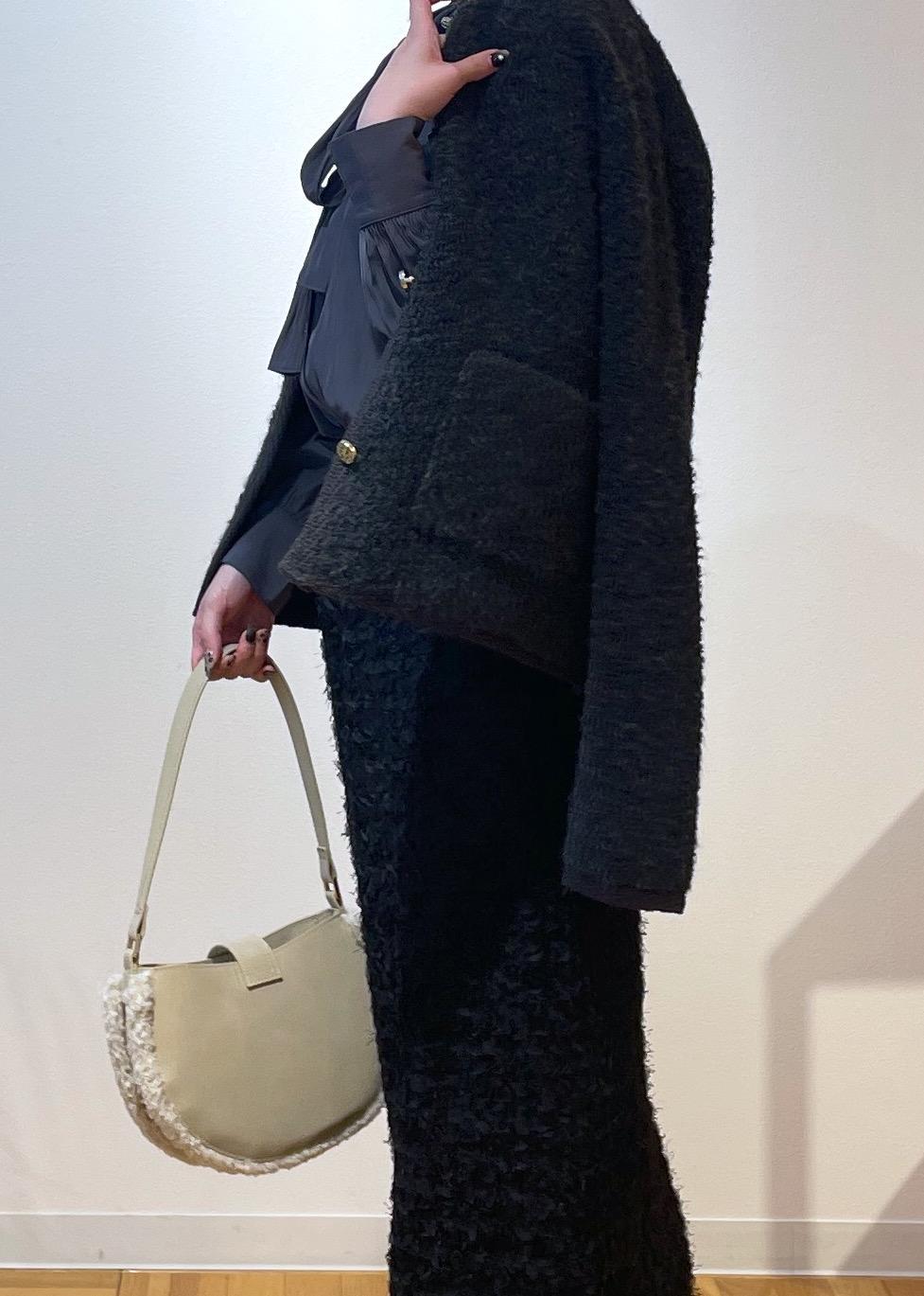 バッグの素材感で柔らかが出るので、どのシーンでもオススメなコーディネートです◎