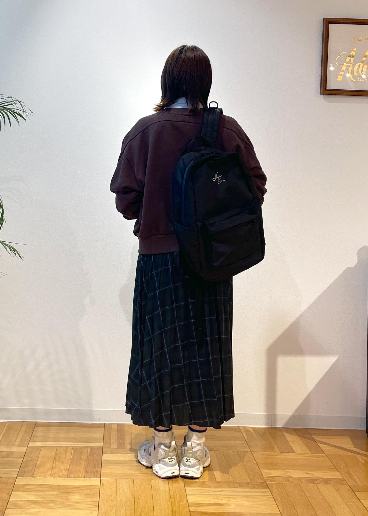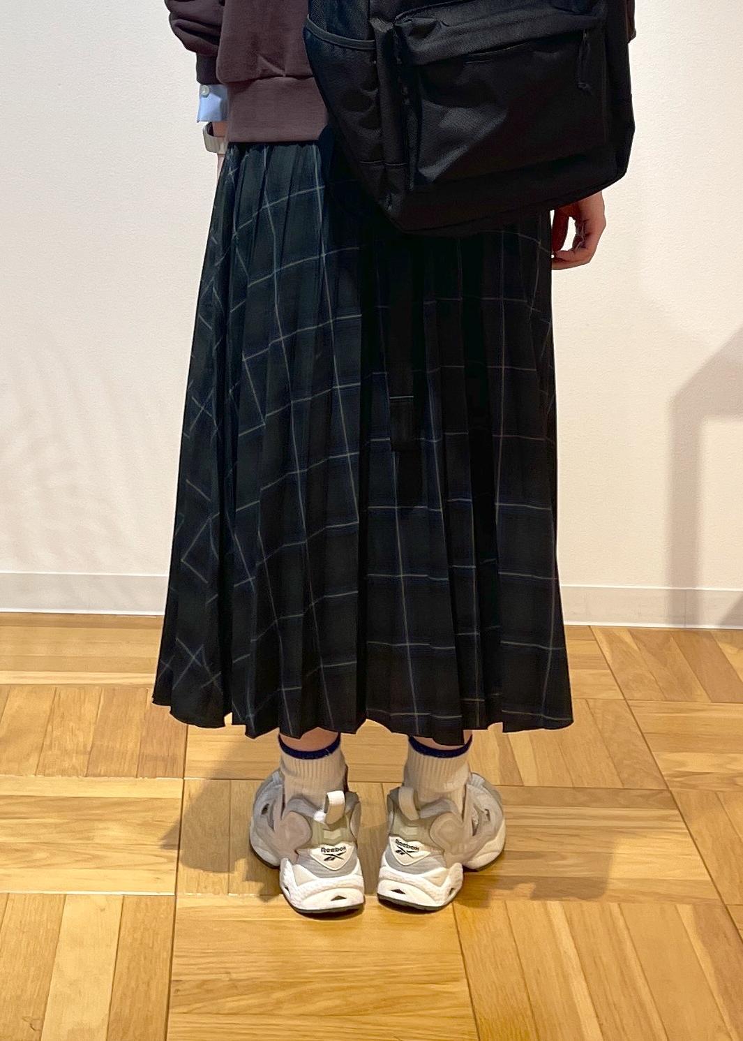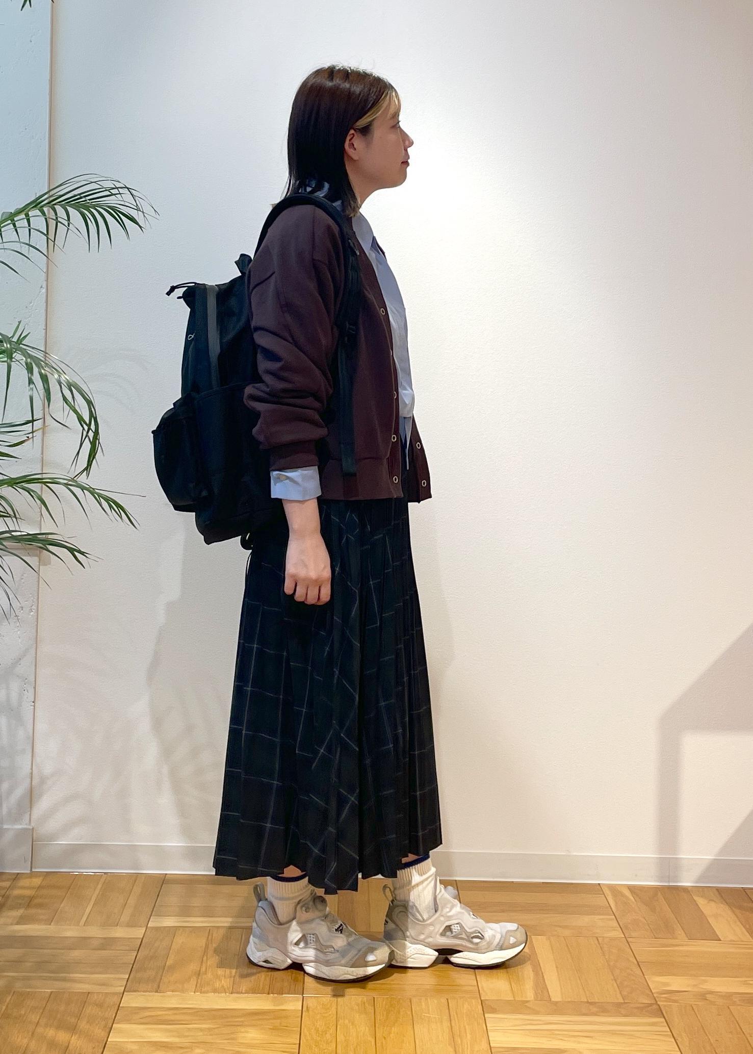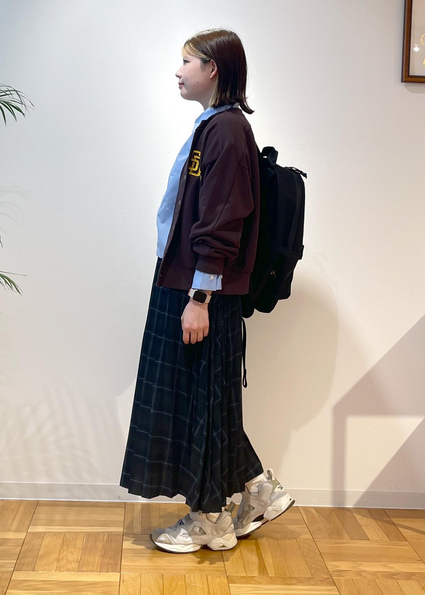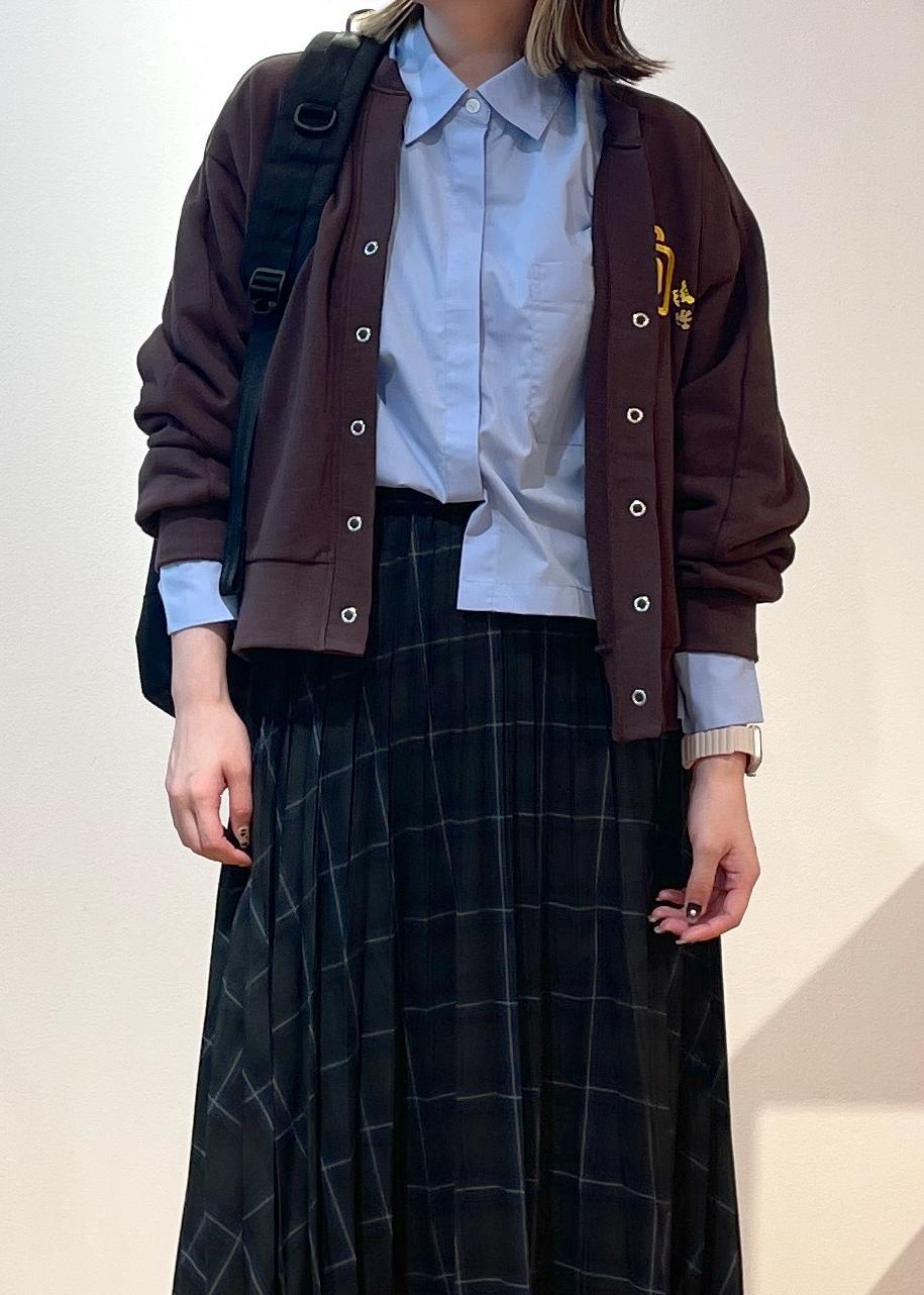 今年人気のブラウン×ブルーのカラー合わせと秋っぽさの出るチェックスカートでカジュアルにしてみました♩