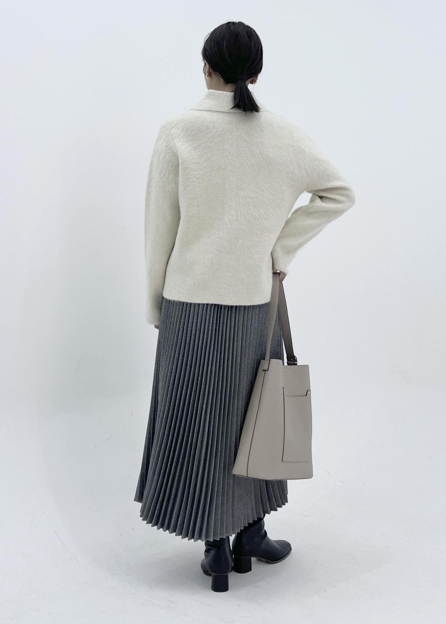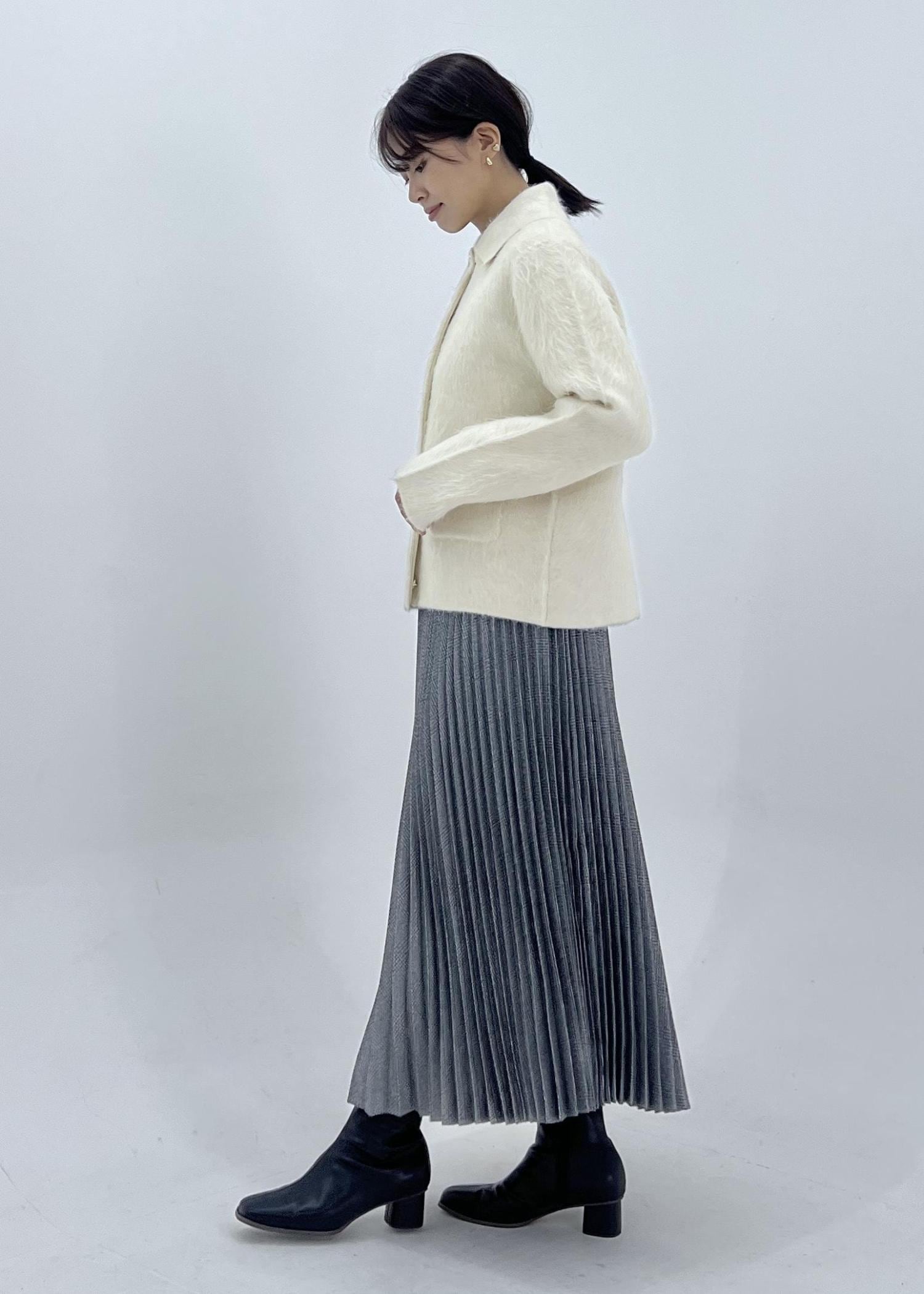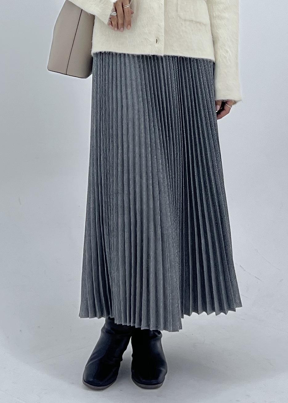 プリーツスカートは細かいラメの質感が華やかで、年末年始のお出かけスタイルにもおすすめです。