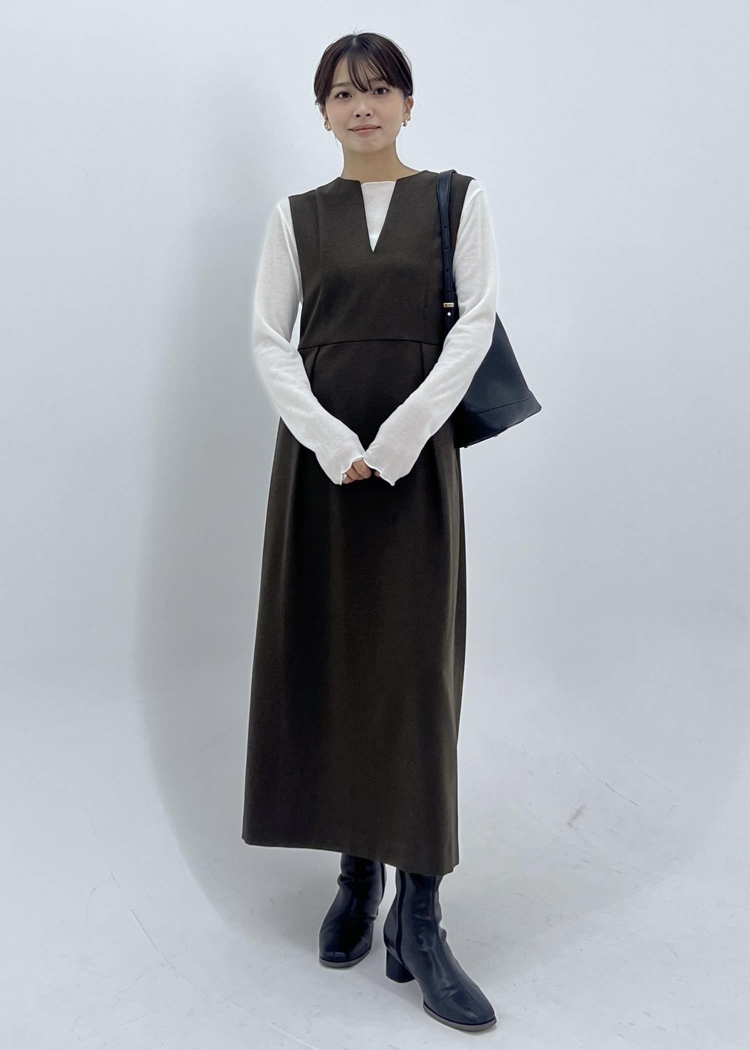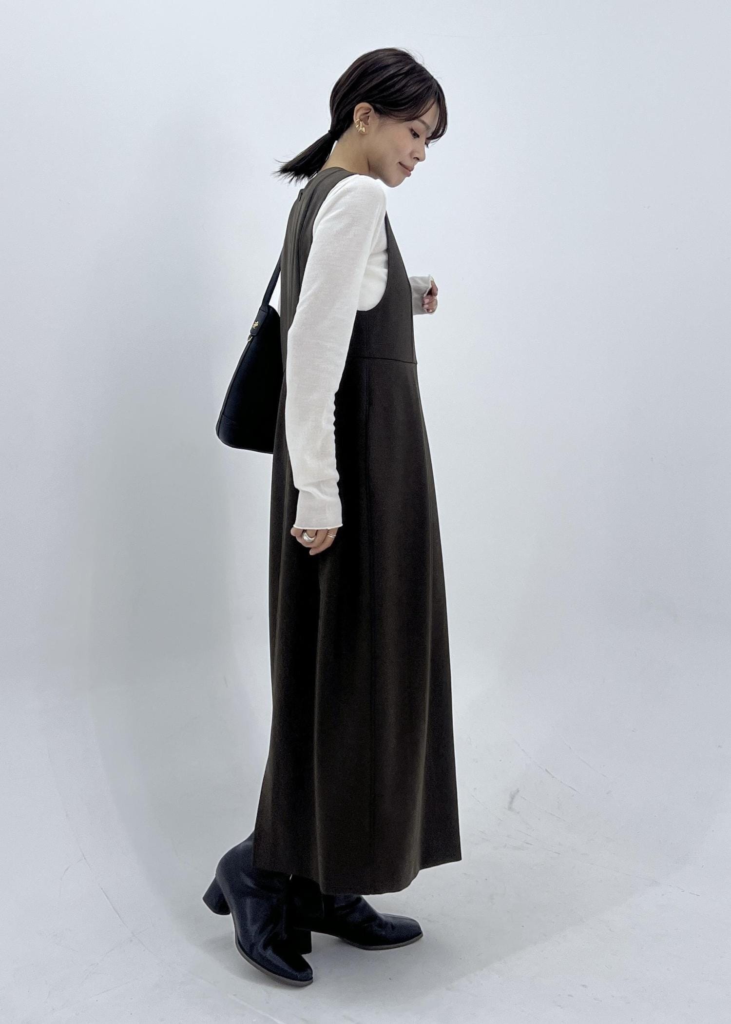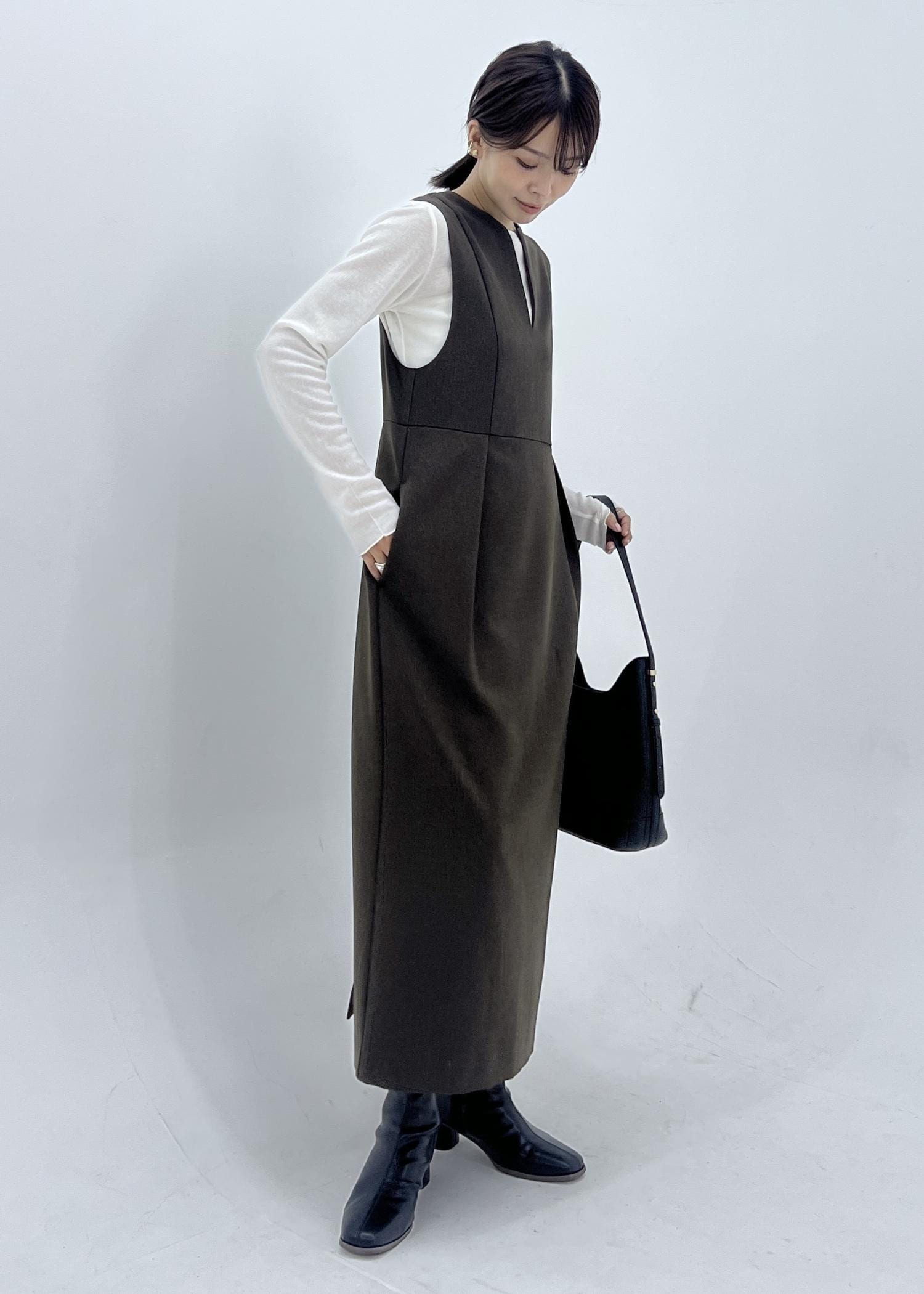 スッキリ感のあるキーネックのジャンパースカートは、シンプルにシアートップスに合わせて大人コーデに。
