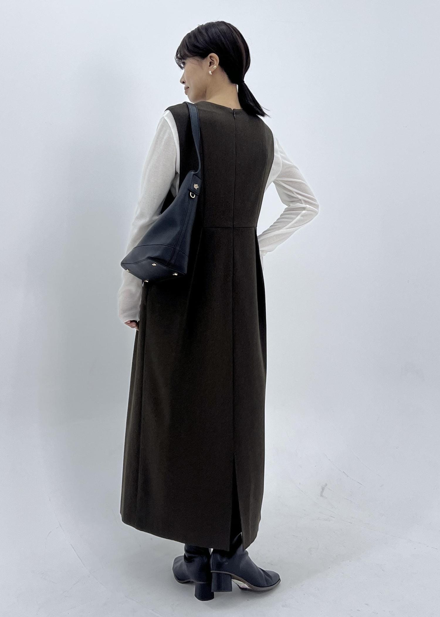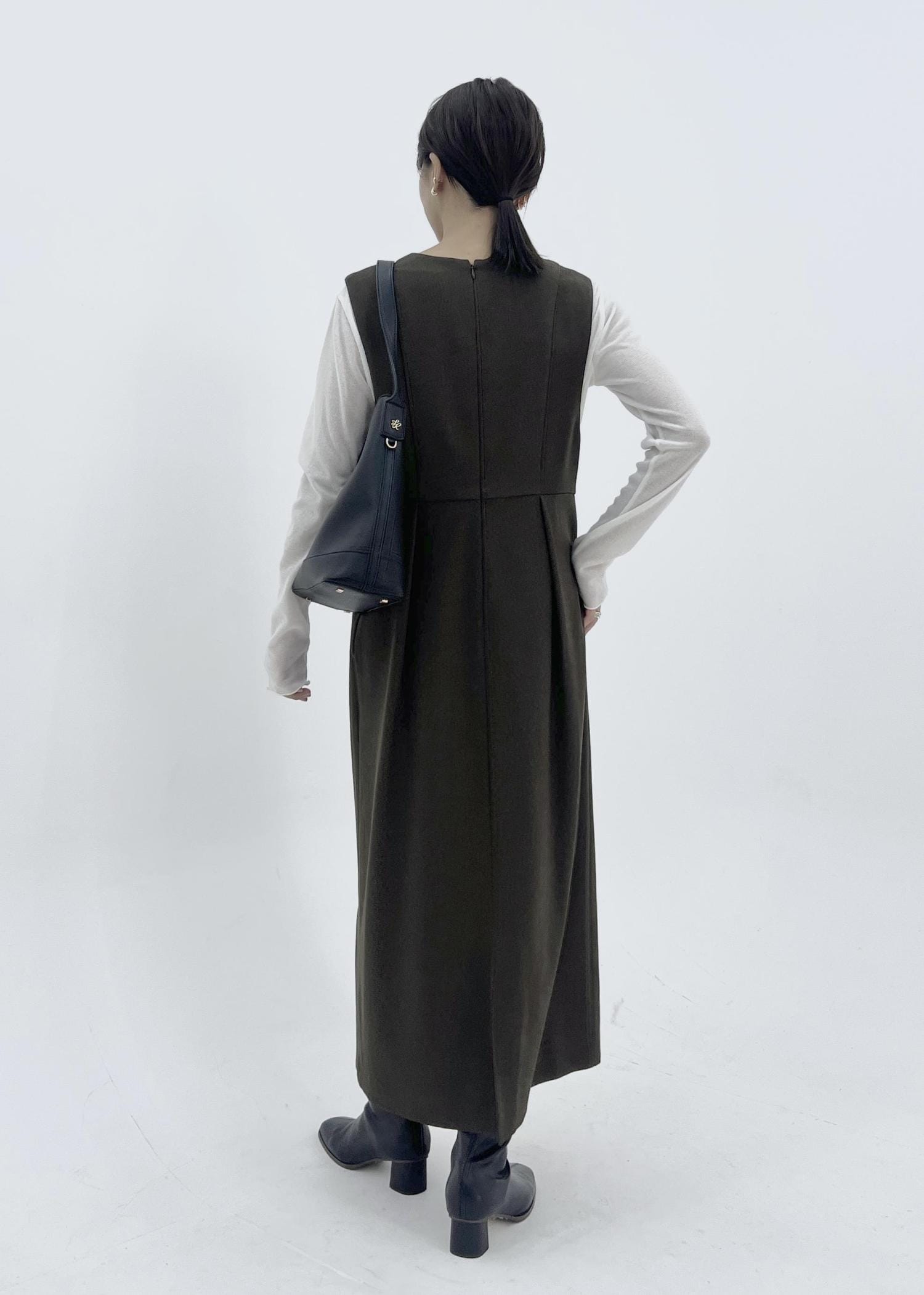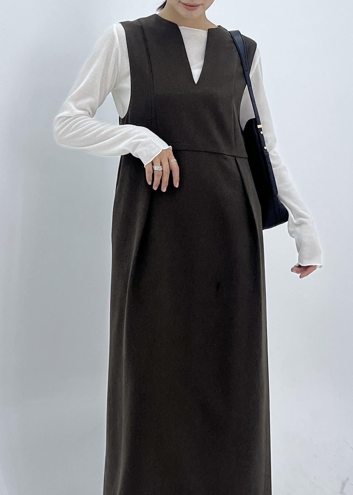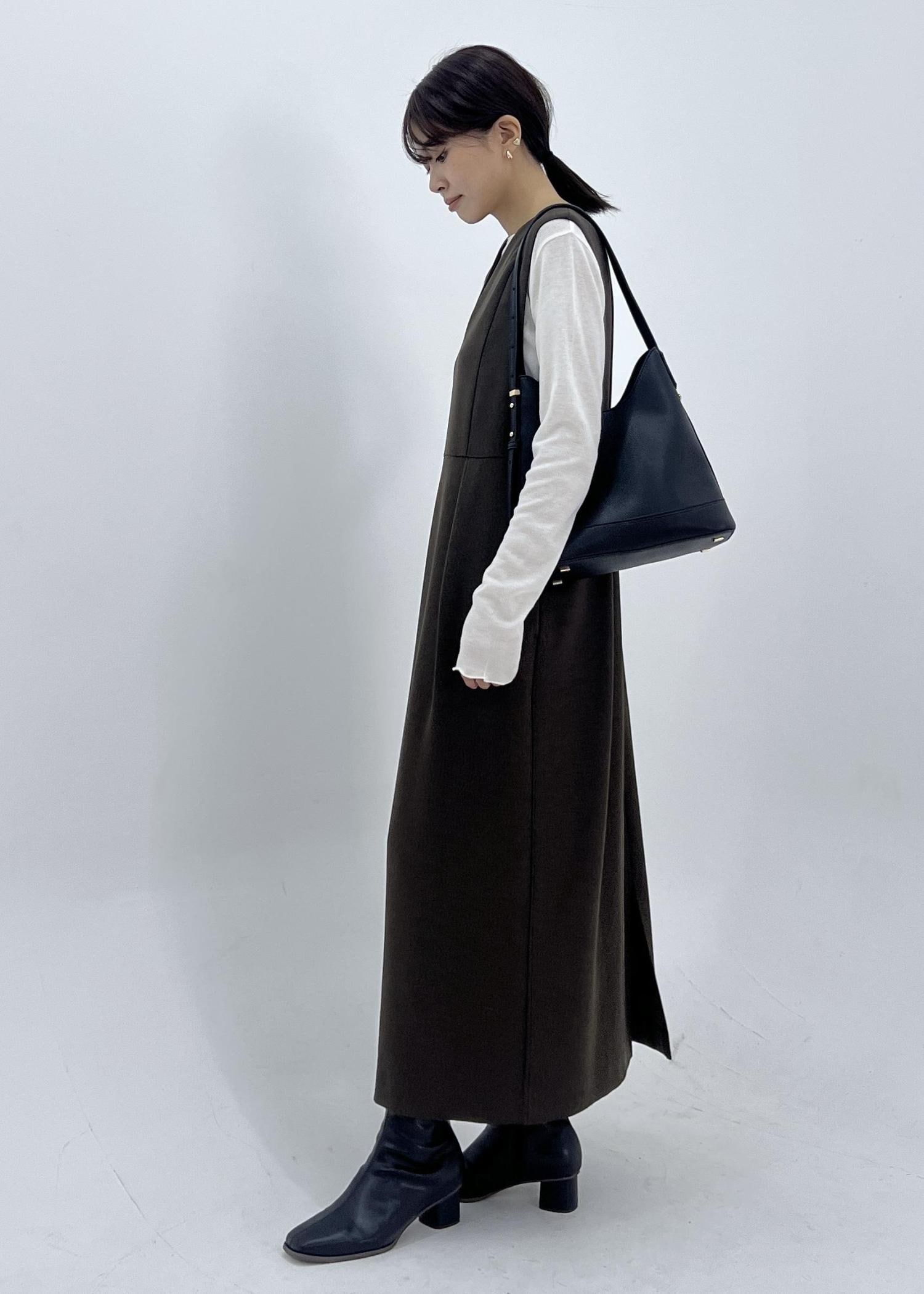 スッキリ感のあるキーネックのジャンパースカートは、シンプルにシアートップスに合わせて大人コーデに。